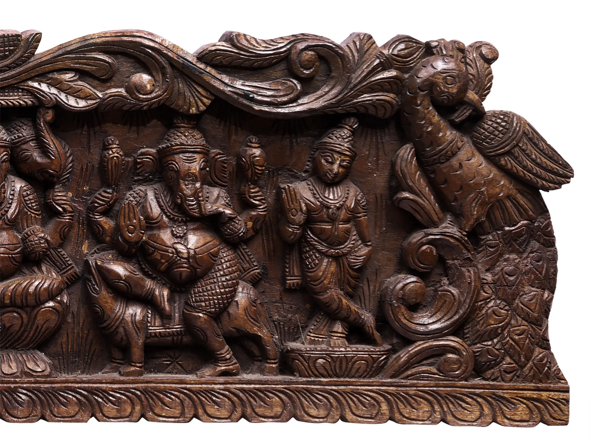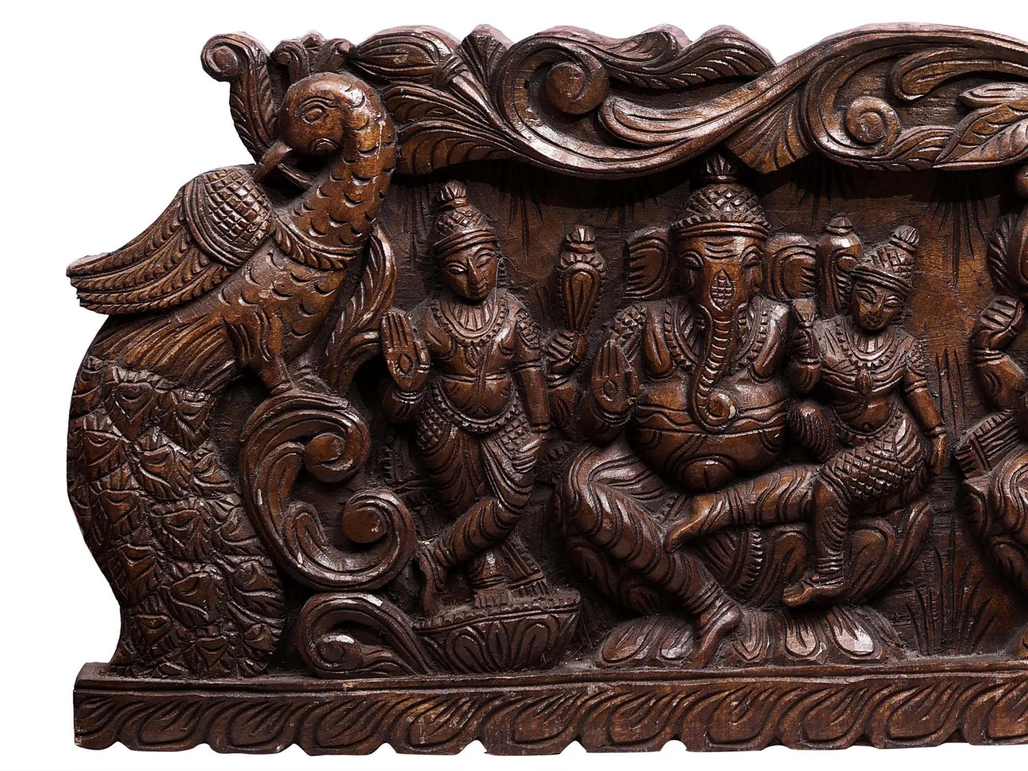 Trimukha Ganapati or the three-headed Ganesha who protects the devotees from all troubles and Srishti Ganapati, who is the supreme being who is in the beginning, stability and annihilation of the Universe and the root of all activities. Two guardians stand on either side of the Ganeshas, in graceful poses, accompanied by Mayura or peacock, a bird associated with Ganesha as his mount and an ancient symbol of divinity and royalty in Hindu art.
