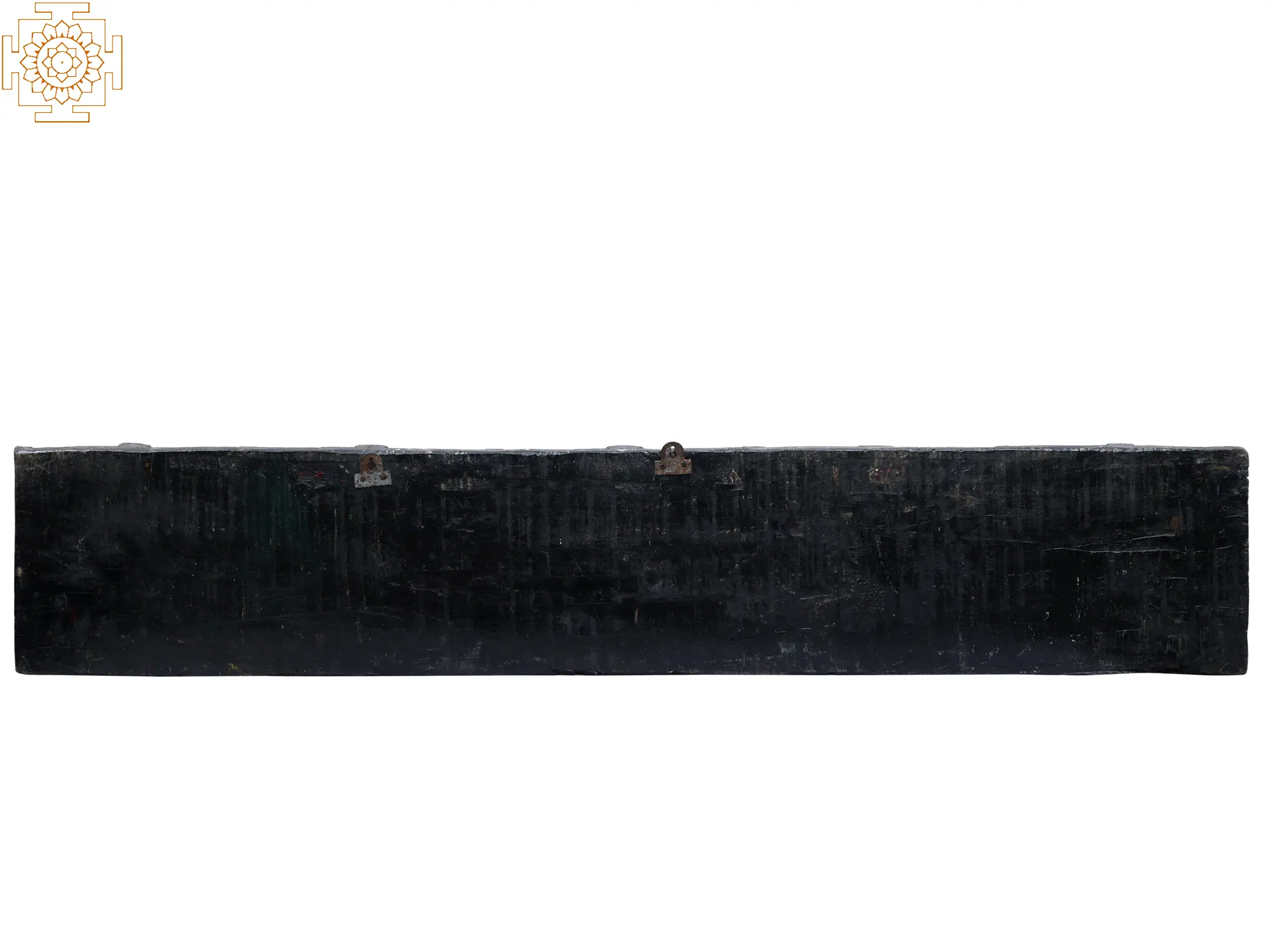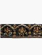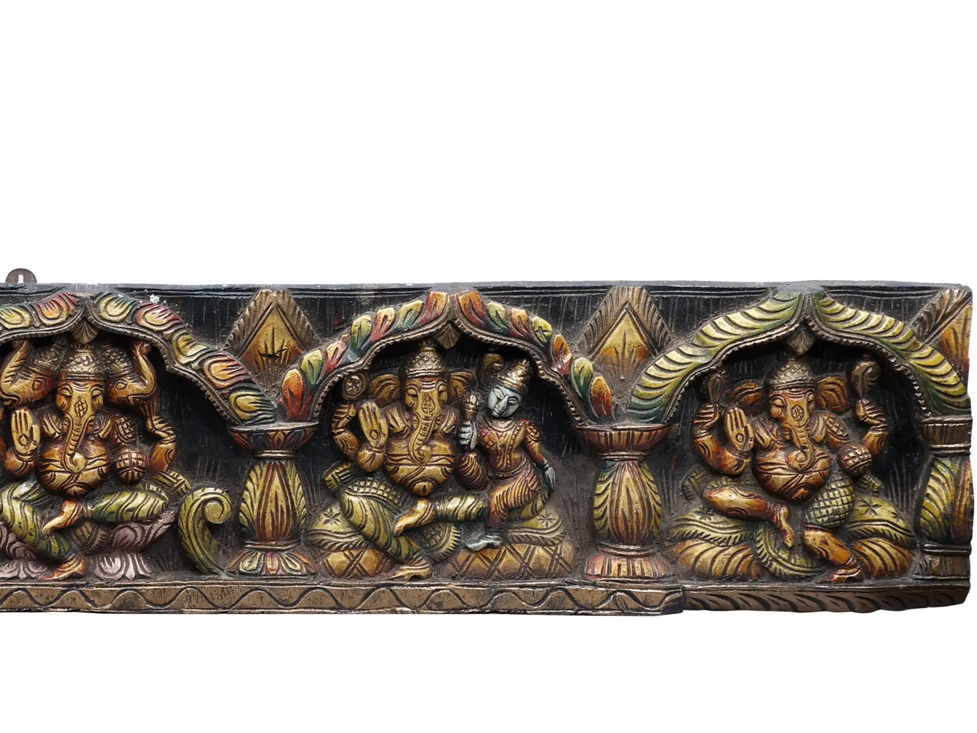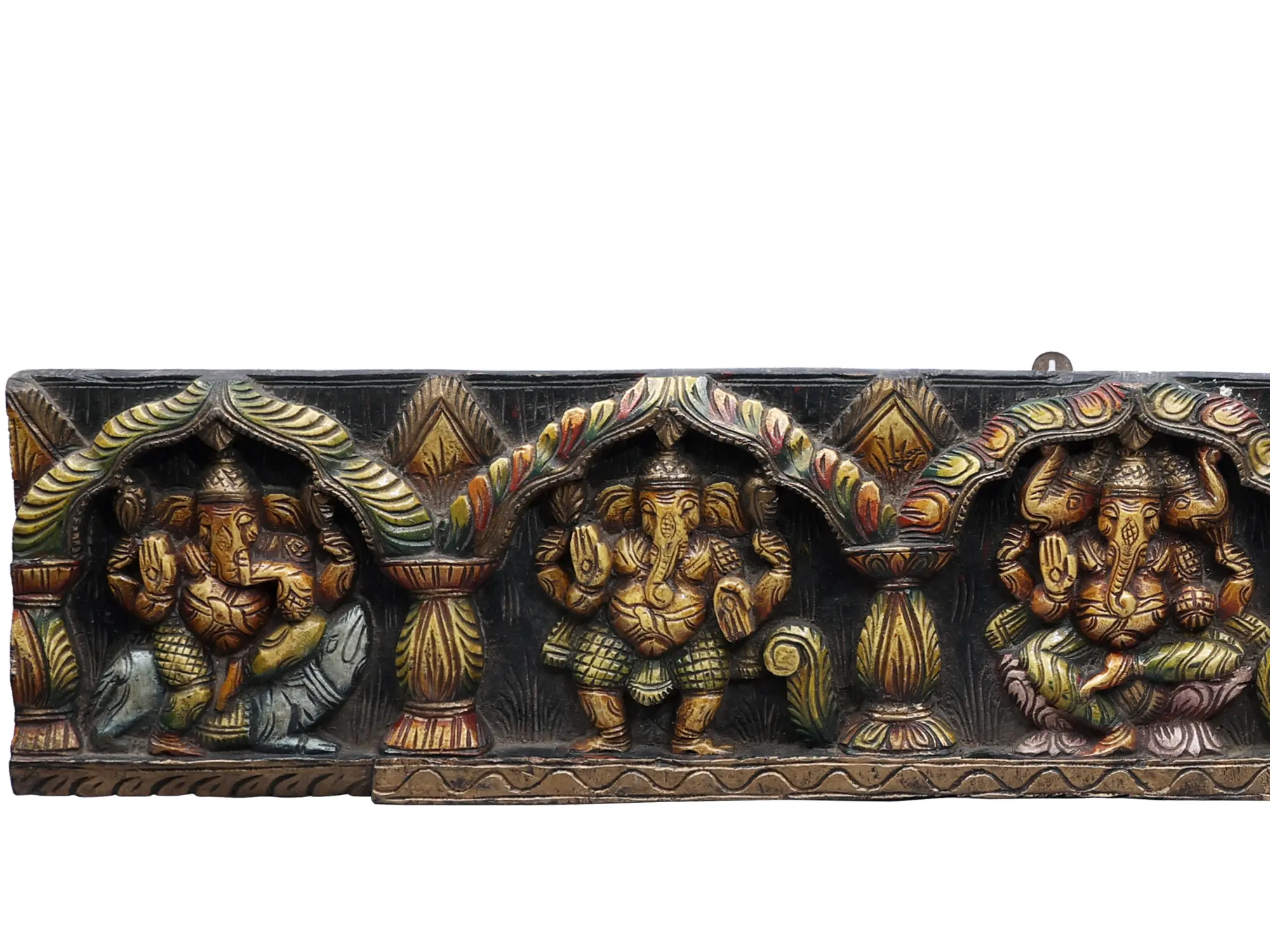 A rare and divine representation of the four powerful aspects of Ganesha- Vijaya Ganapati (bestower of victory), Nritya Ganapati (dancing Ganesha, a source of bliss), Trimukha Ganapati (the three-headed Ganesha, who brings a balance of the three Gunas- Sattva, Rajas and Tamas), Lakshmi Ganapati (Ganesha with his consort, bestower of fecundity and auspiciousness), and Ekakshara Ganapati (Ganesha of single-syllabled mantra), this wooden wall panel is a crafted in the ancient iconography of Southern India, recreating the heavenliness of the sanctum walls, with arched elements carved to bring a grandeur in the miniature wall ornamentation.