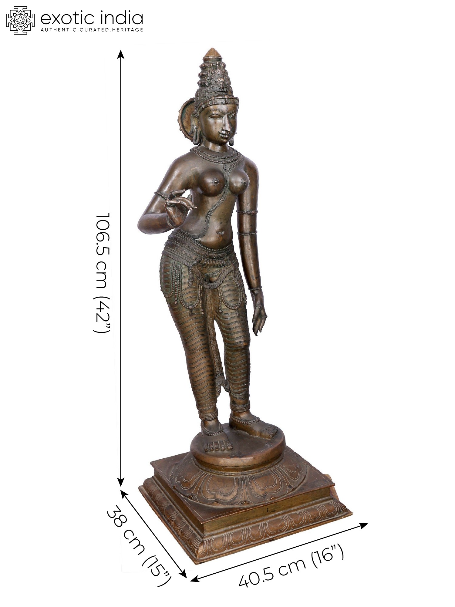 Wife of Shiva, queen of paraloka, Uma is the quintessential deviroopa. Behind the exterior of otherworldly beauty, She is made of equal parts compassion and equal parts invincibility. The standing murti of Her that you see on this page has been handpicked for a form and stance conveyed superbly in the medium of the panchaloha (mix of five iron-based alloys), unique to the South in general and Swamimalai in particular.
