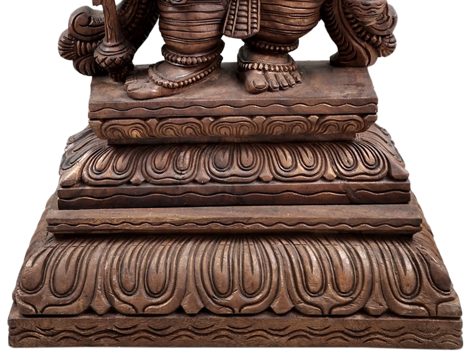 Each facet of this sculpture speaks to the dedication and skill of the artisan. The Vengai wood, known for its durability and beautiful grain, has been masterfully shaped to bring this divine form to life. Observe the subtle curves of Ganesha's trunk, the serene expression on each of his faces, and the carefully rendered gestures of his numerous arms. He holds various divine implements, each with symbolic significance: the noose (pasha) to bind desires, the goad (ankusha) to prod the reluctant, and various celestial weapons to vanquish ignorance and ego. The meticulous detailing extends to the adornments, from the ornate jewelry to the flowing garments, all rendered with exceptional precision. This is a piece that invites contemplation and admiration, a testament to the rich tradition of Indian wood carving. ––––––––––––––––––––