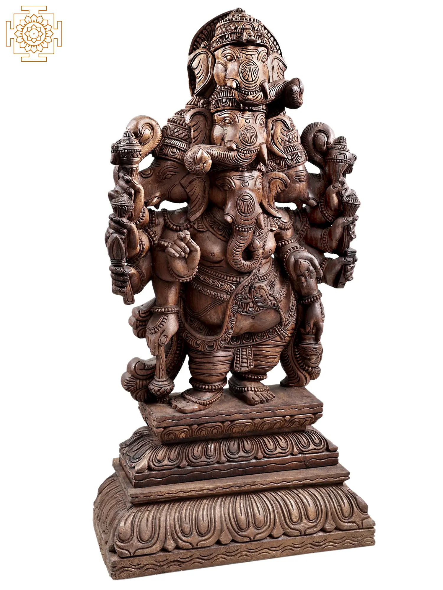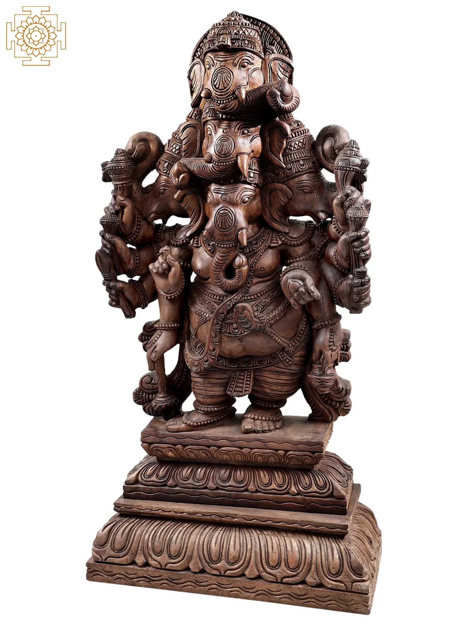 Elevate your sacred space with this magnificent, large-scale wooden sculpture of Heramba Ganesha. Standing at an impressive height, this piece is not merely an artistic representation but a powerful embodiment of the remover of obstacles, the bestower of wisdom, and the guardian of auspicious beginnings. Hand-carved from exquisite Vengai wood, the intricate details and the rich, natural grain of the timber lend an aura of timeless reverence to this divine form. Heramba Ganesha, also known as Panchamukha Ganesha, is a formidable manifestation of the elephant-headed deity. This particular depiction showcases Ganesha with five heads, symbolizing his omnipresence and all-encompassing vision. Each head is adorned with a distinct crown, intricately carved to reflect the divine majesty of this form. The presence of multiple heads signifies Ganesha's ability to perceive all directions and overcome challenges from every angle. This form is particularly revered for its protective qualities, offering a shield against negativity and misfortune. ––––––––––––––––––––