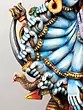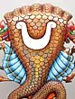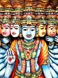 Vishnu, the preserver and protector of the cosmos, is shown here in his most universal and terrifying aspect. The central figure, radiating a divine blue aura, is surrounded by an astonishing array of faces, each representing a different aspect of creation, destruction, and sustenance. From fierce lion-headed visages to serene human countenances and even the trunk of an elephant, these varied expressions convey the boundless nature of the divine. The multiple arms, adorned with weapons and emblems of power, such as the discus and mace, signify Vishnu's omnipresence and his ability to act in all realms simultaneously. Above all, a hooded cobra, representing the primal serpent Adi Shesha, shelters the central deity, symbolizing eternity and the cosmic support upon which the universe rests. This is the form that Arjuna, guided by Krishna's divine wisdom, was privileged to witness, a manifestation that humbled him and revealed the ultimate truth of existence.