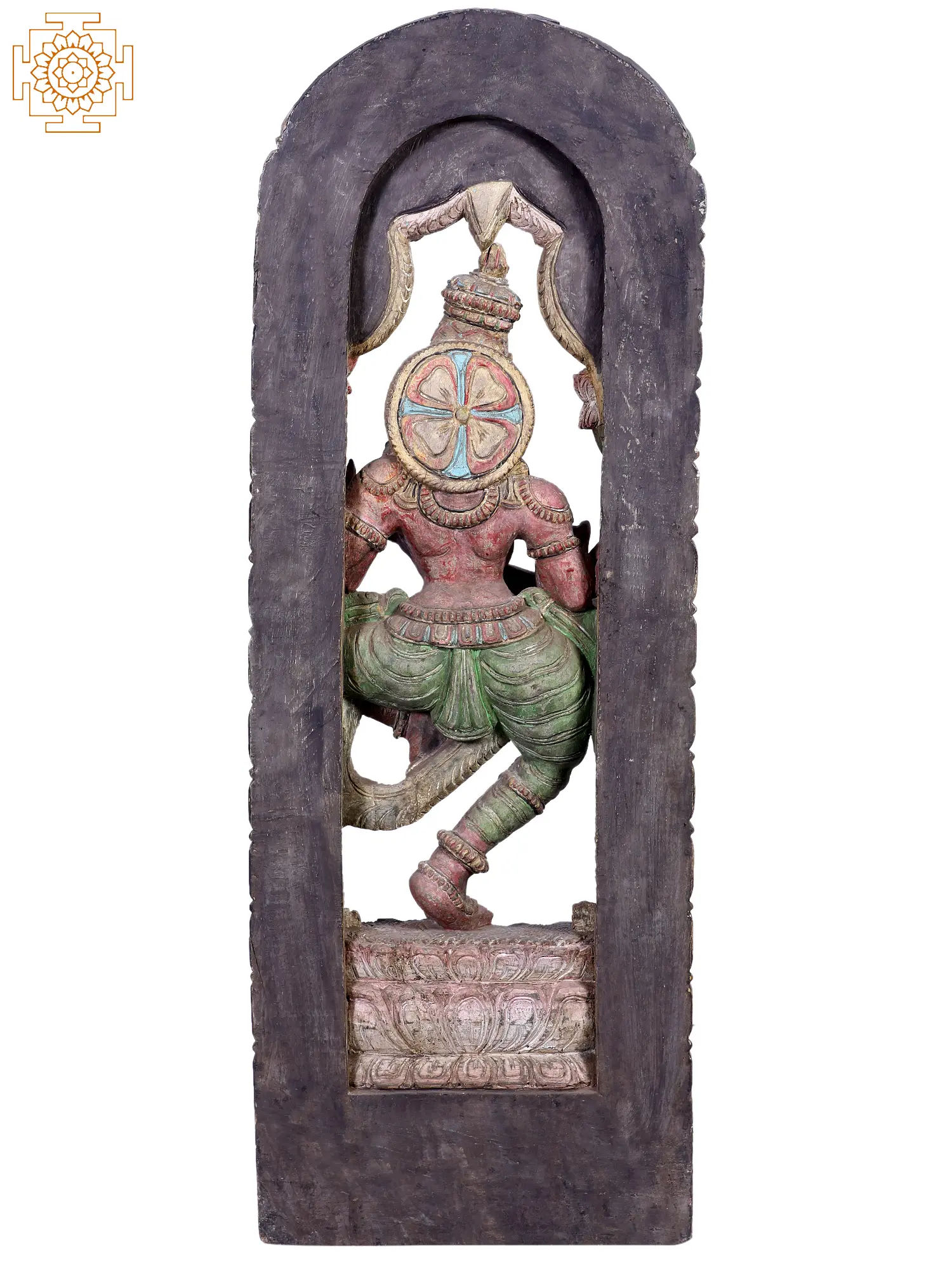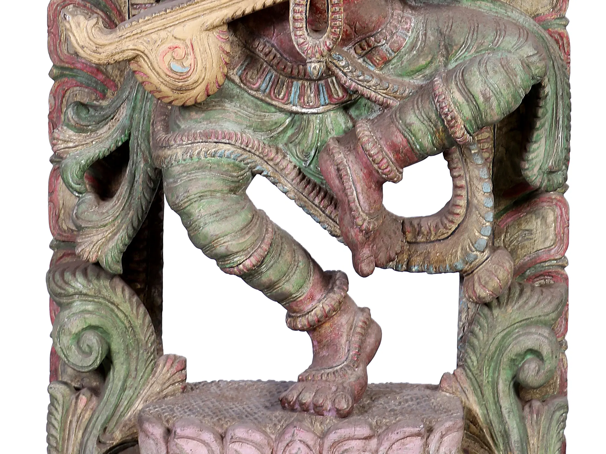 This exquisite wooden carving captures the divine grace and artistic spirit of Goddess Saraswati, the Hindu deity of knowledge, music, arts, wisdom, and learning. Rendered in a dynamic dancing pose, she embodies the fluidity and rhythm inherent in all creative expression. Her posture, with one leg bent and the other extended, conveys a sense of joyful movement, as if caught in the midst of a celestial dance. She holds a Veena, the traditional South Indian lute, expertly carved to suggest the delicate strings and resonant body, ready to fill the air with enchanting melodies.