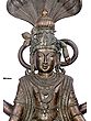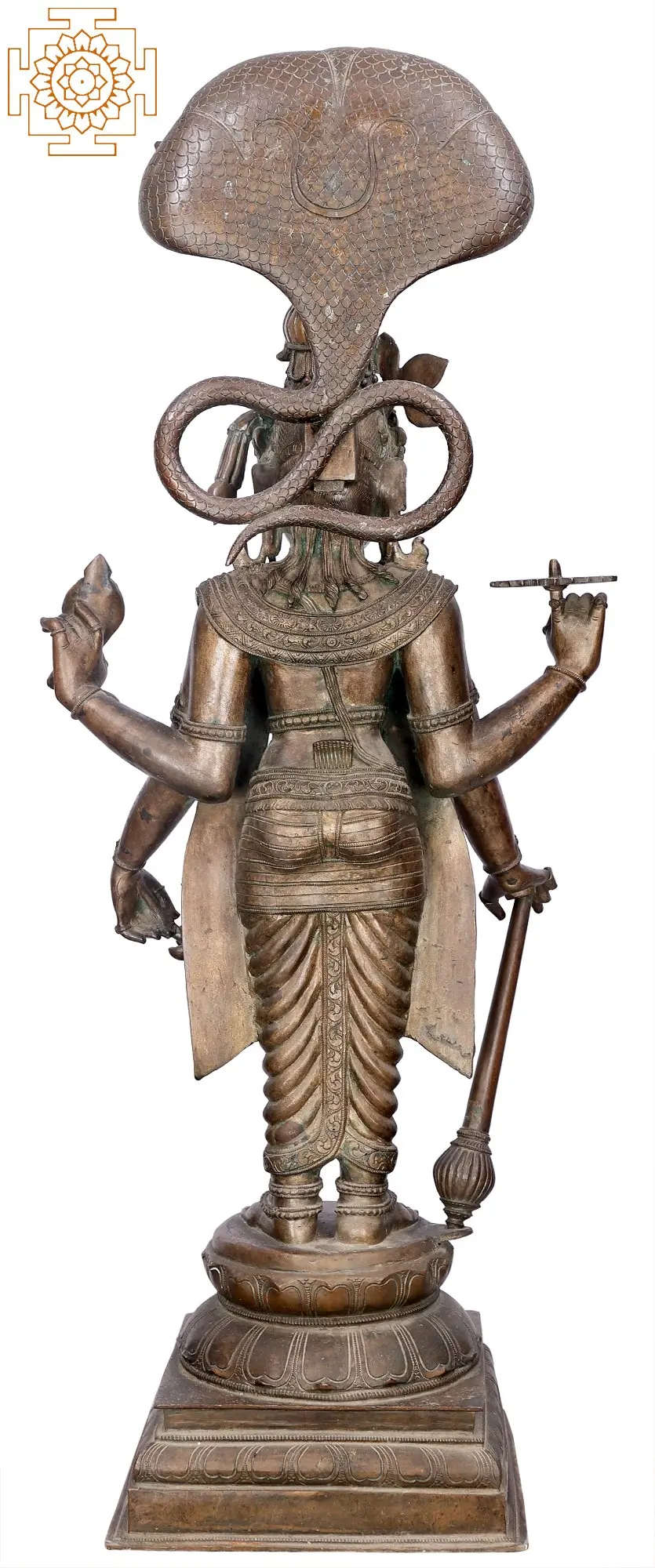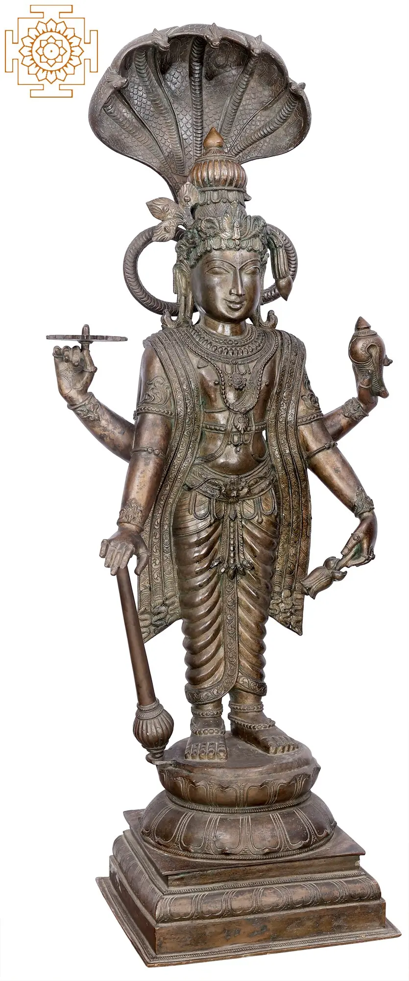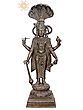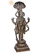 This magnificent Vishnu sculpture captures the divine essence of the preserver of the universe, an embodiment of cosmic order and benevolent power. Crafted with exceptional skill using the ancient Madhuchista Vidhana, or lost-wax, method in Panchaloha bronze, this piece is a testament to traditional Indian artistry. The Panchaloha, a sacred alloy of five metals, is believed to bestow spiritual and physical benefits, imbuing the sculpture with an aura of sanctity and permanence. The sheer scale of this imposing 43-inch statue commands reverence, making it a truly awe-inspiring centerpiece for any sacred space or discerning collection. The artistry is evident in every meticulously detailed element. Vishnu stands tall, protected by the divine hood of the Naga, Shesha, on whom he is often depicted reclining during cosmic rest. This canopy of serpents symbolizes eternity, protection, and the undying cosmic energy that sustains creation. The serene yet powerful expression on Vishnu's face reflects his eternal watchfulness and compassion. His multiple arms, a characteristic feature, are adorned with divine attributes. In his upper left hand, he holds the Shankha, the conch shell, whose sound is believed to be the primordial sound of creation. His upper right hand gracefully holds the Sudarshana Chakra, his celestial discus, a potent weapon against all forms of evil and ignorance. His lower left hand rests on his mace, the Gada, a symbol of strength and authority, while his lower right hand is posed in a gesture of blessing or holding a lotus, representing purity, beauty, and spiritual enlightenment.