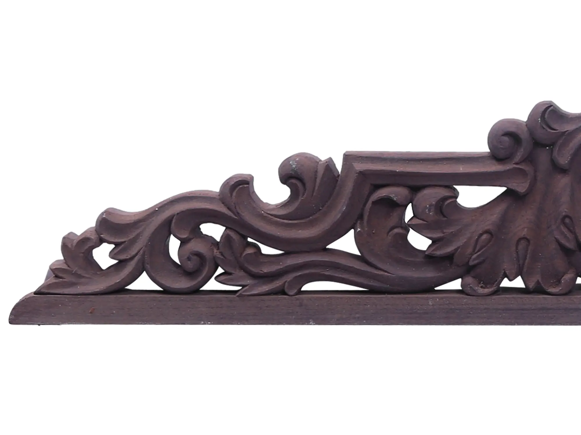 This exquisite wooden wall panel is a testament to the rich artistic heritage of India, where the art of wood carving has been honed over centuries. Each intricate detail is meticulously handcrafted, transforming a simple piece of wood into a captivating work of art. The design itself draws inspiration from the natural world and the rich tapestry of Indian culture, evoking a sense of timeless beauty and spiritual depth. The central motif, reminiscent of a blossoming flower or a stylized crown, is surrounded by flowing acanthus leaves and swirling volutes. This organic, yet controlled, ornamentation echoes the decorative styles found in ancient Indian temples and palaces, where every surface was adorned with symbols of prosperity, growth, and divine grace. In Hinduism, the lotus flower is a sacred symbol representing purity, enlightenment, and rebirth, often associated with deities like Lakshmi, the goddess of wealth and prosperity. The flowing lines can also be seen as a representation of the cosmic dance of creation and destruction, a fundamental concept in Hindu philosophy.