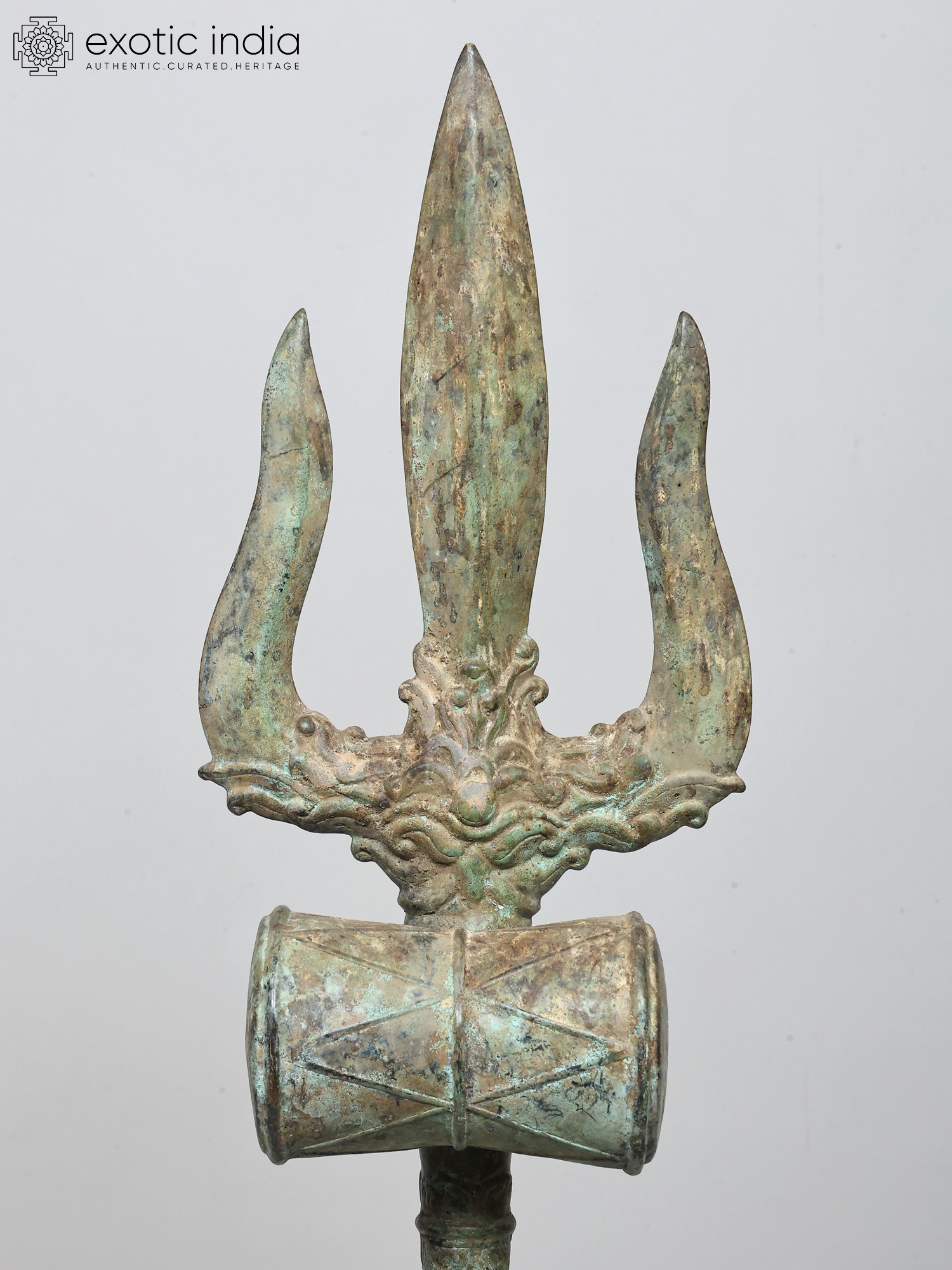 This magnificent brass trident, standing at an impressive 46 inches, is more than just a decorative piece; it is a powerful representation of Lord Shiva, the destroyer and transformer of the cosmos. Crafted using the intricate lost wax method, a time-honored technique passed down through generations of Indian artisans, this trident embodies the divine energy and profound symbolism associated with one of Hinduism's most revered deities. The aged patina of the brass lends it an aura of antiquity and sacredness, evoking a sense of timelessness that resonates with the eternal nature of Shiva himself.