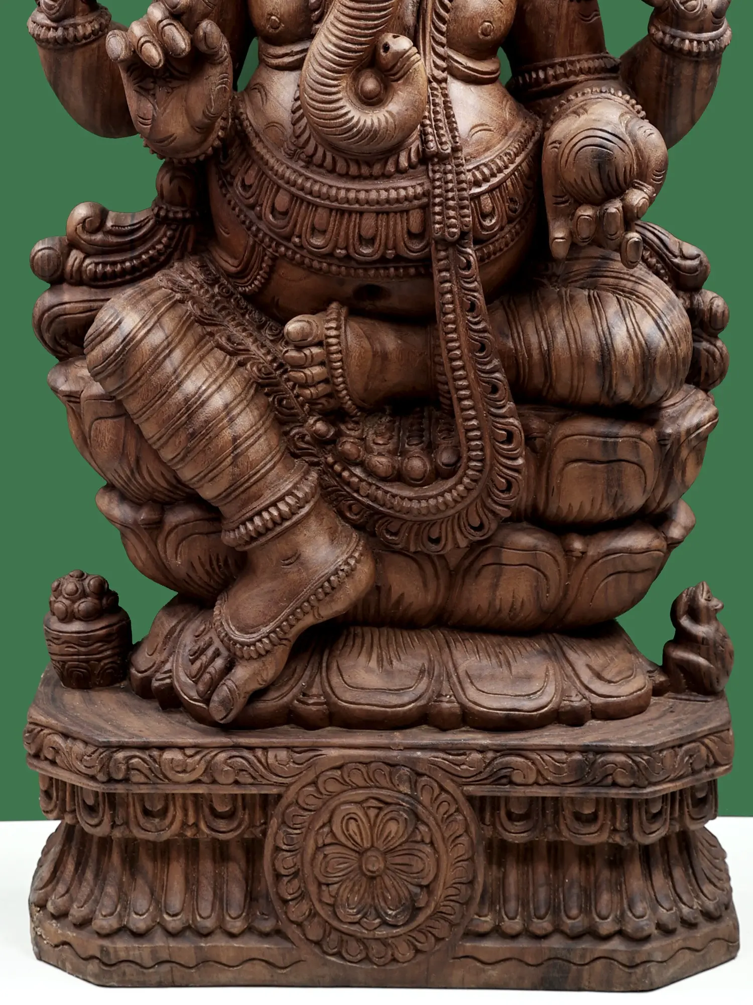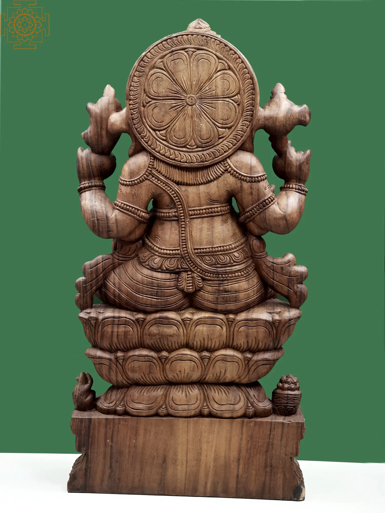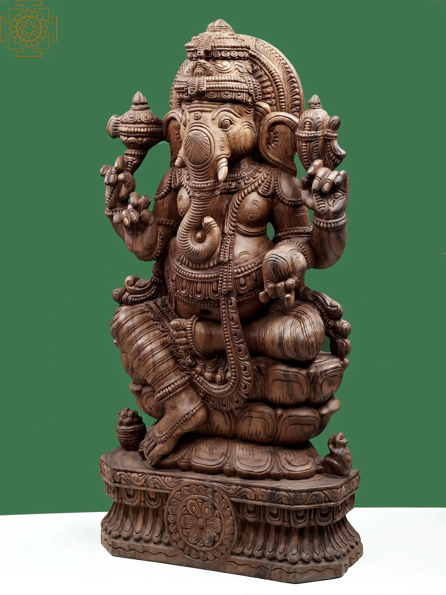 This magnificent sculpture captures the divine essence of Bhagwan Ganesha, the beloved elephant-headed deity revered as the remover of obstacles and the god of wisdom, intellect, and new beginnings. Crafted from the rich and durable Vengai wood, each detail of this large, 47-inch statue speaks of profound artistry and devotion. The intricate carvings showcase Ganesha in his characteristic seated posture, radiating an aura of serene power and benevolent grace.