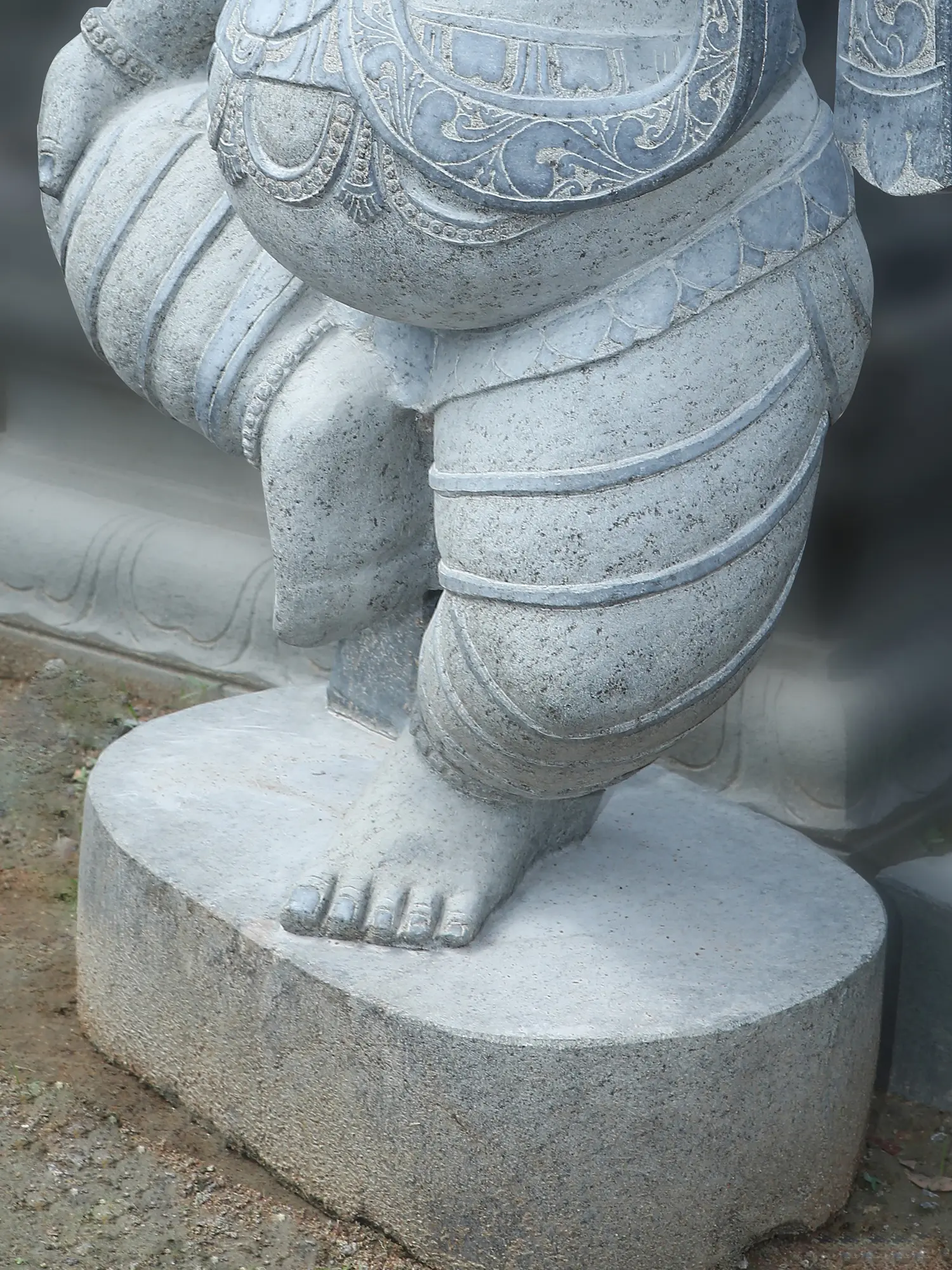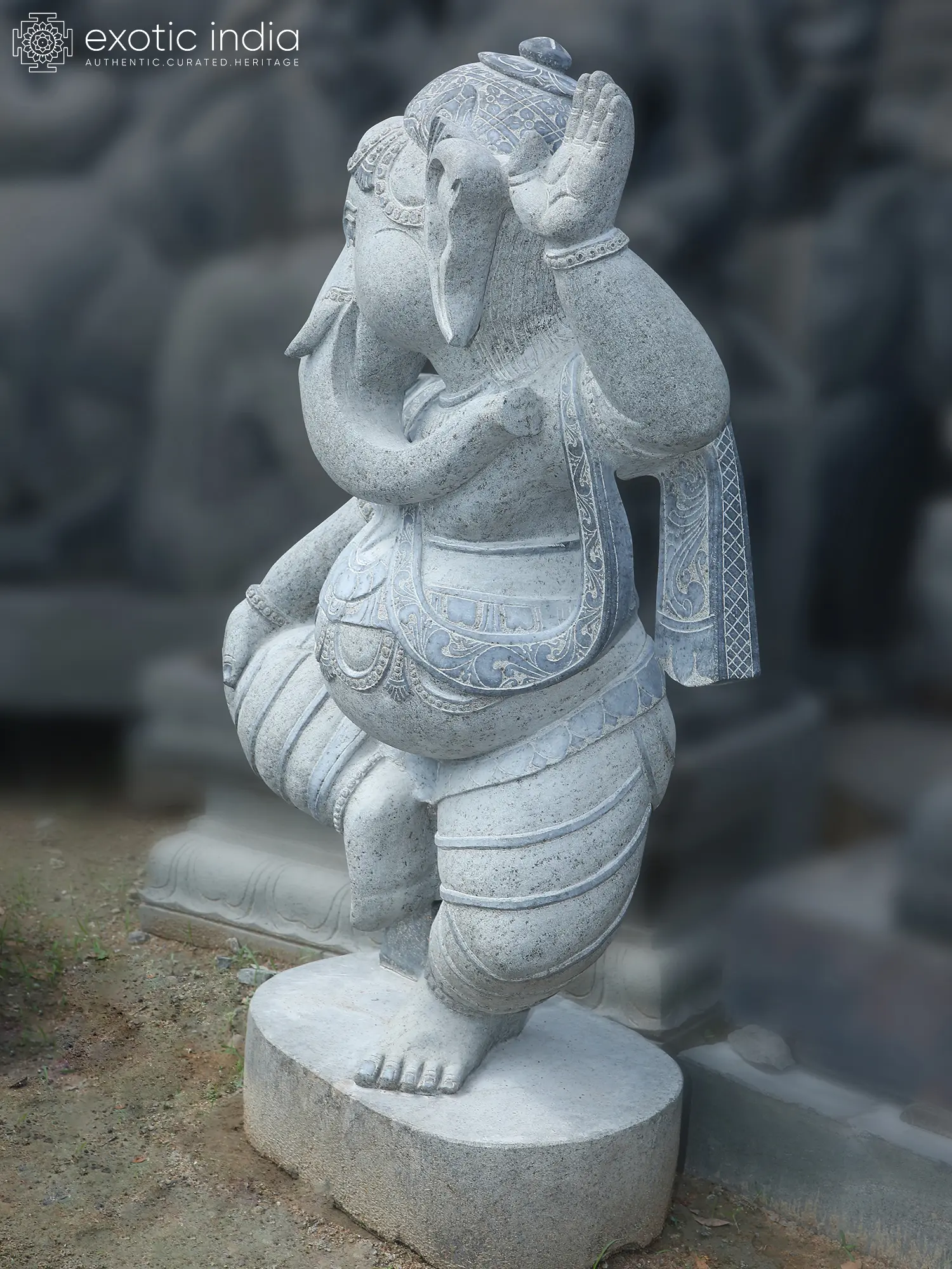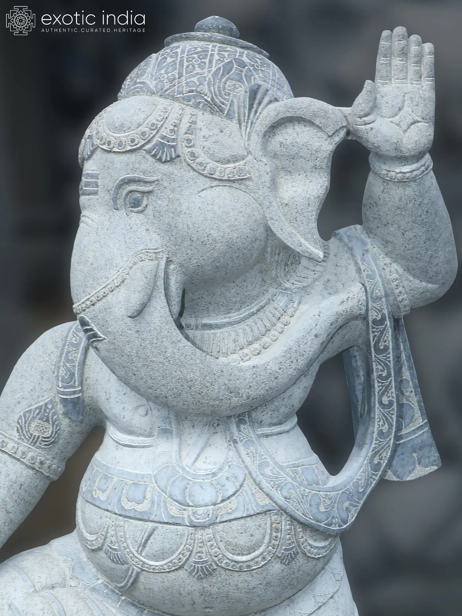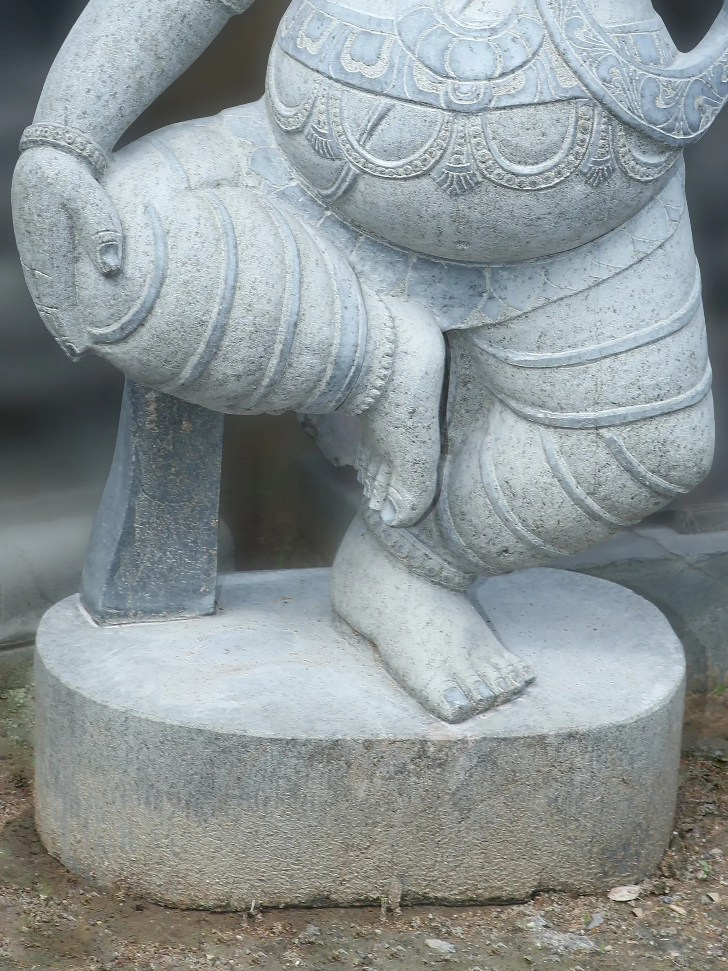 Meticulously carved from granite, the statue highlights Ganesha’s characteristic features, including his large ears, playful trunk, and ornate attire, while exuding a sense of movement and exuberance.