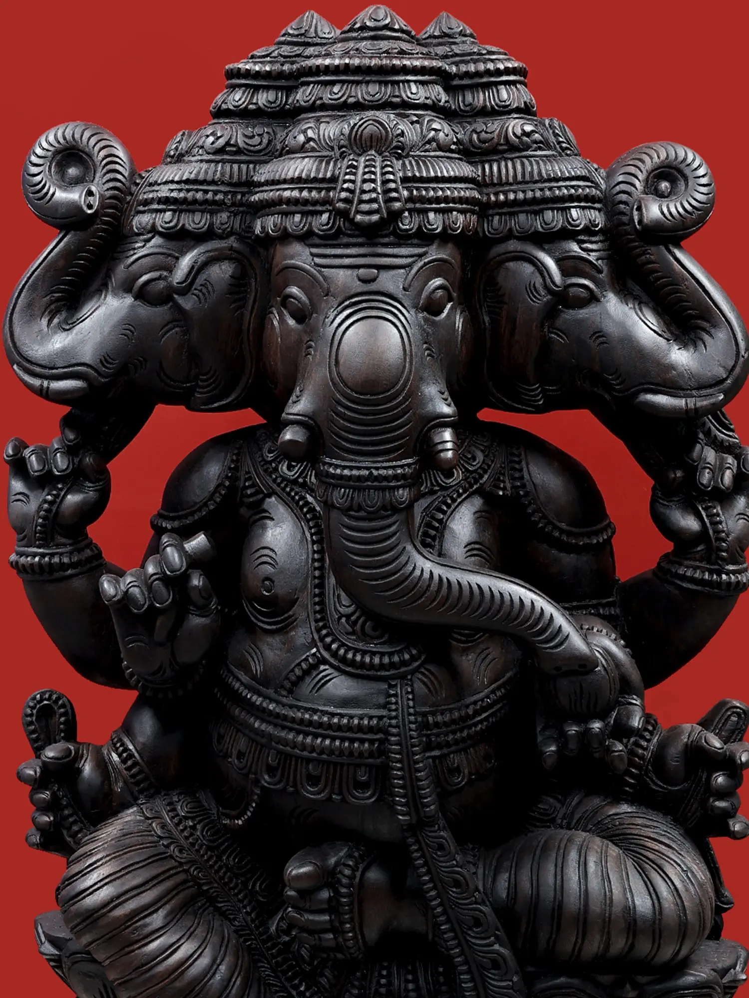 The striking feature of this Ganesha is its three heads, a less common but potent depiction of the deity. In Hindu iconography, multiple heads often signify expanded vision, multifaceted knowledge, and the ability to perceive and manage diverse aspects of existence simultaneously. The central head, as always, embodies wisdom and intellect. The flanking heads can be interpreted as representing the past and the future, or different paths of spiritual inquiry, all guided by the central divine intelligence. This tri-headed form amplifies Ganesha's role as a guide and protector, offering comprehensive insight and safeguarding devotees from all angles. The serene yet powerful expression on each face, combined with the characteristic trunk curled gracefully, speaks volumes of his benevolent yet formidable nature.