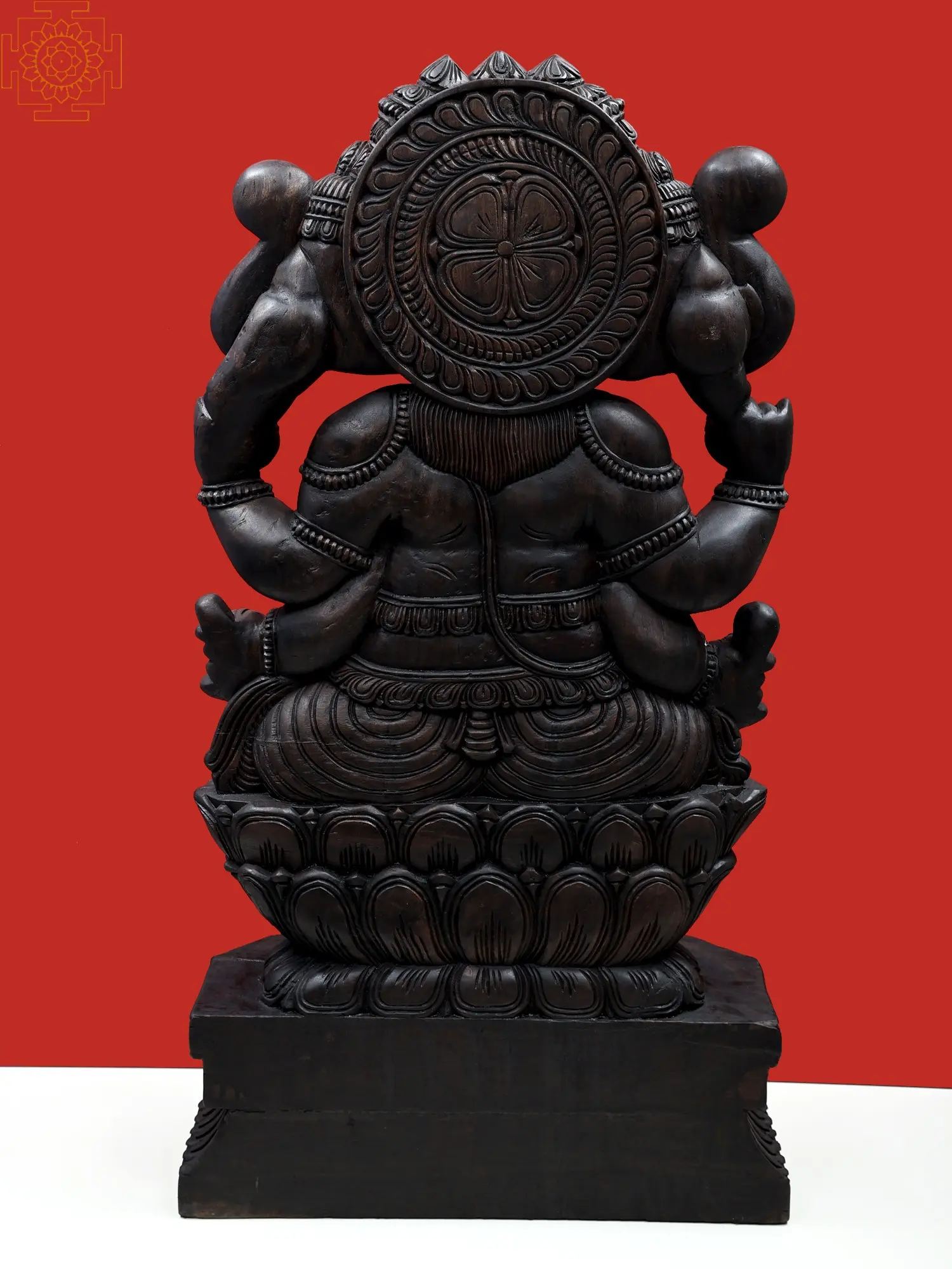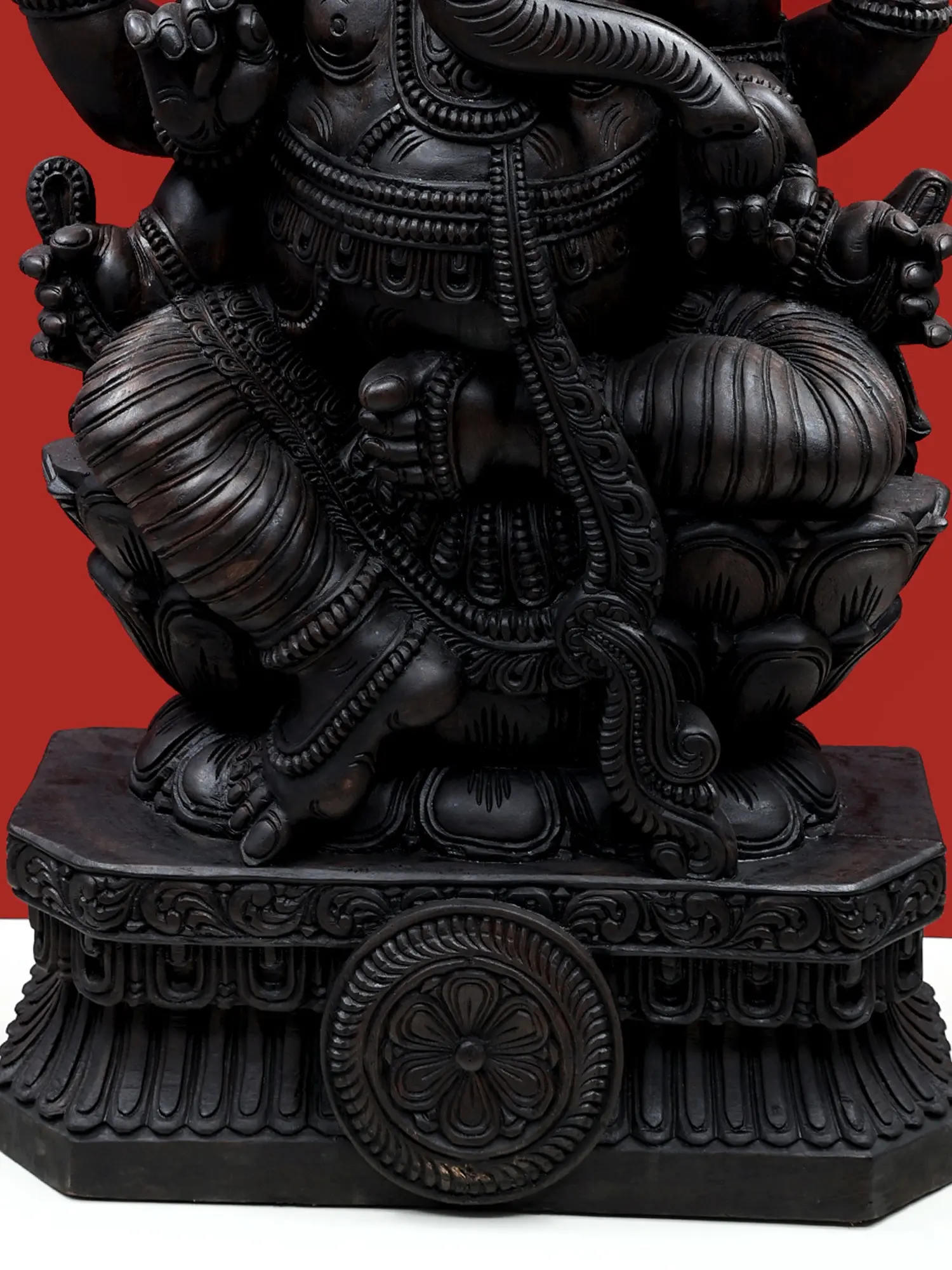 This magnificent hand-carved wooden sculpture presents a powerful and commanding image of Lord Ganesha, the revered elephant-headed deity. Standing at an impressive 47 inches tall, this piece is not merely a decorative item but a profound symbol of wisdom, good fortune, and the remover of obstacles. The intricate detailing and the deep, rich hue of the wood imbue the sculpture with a sense of ancient reverence and spiritual depth.