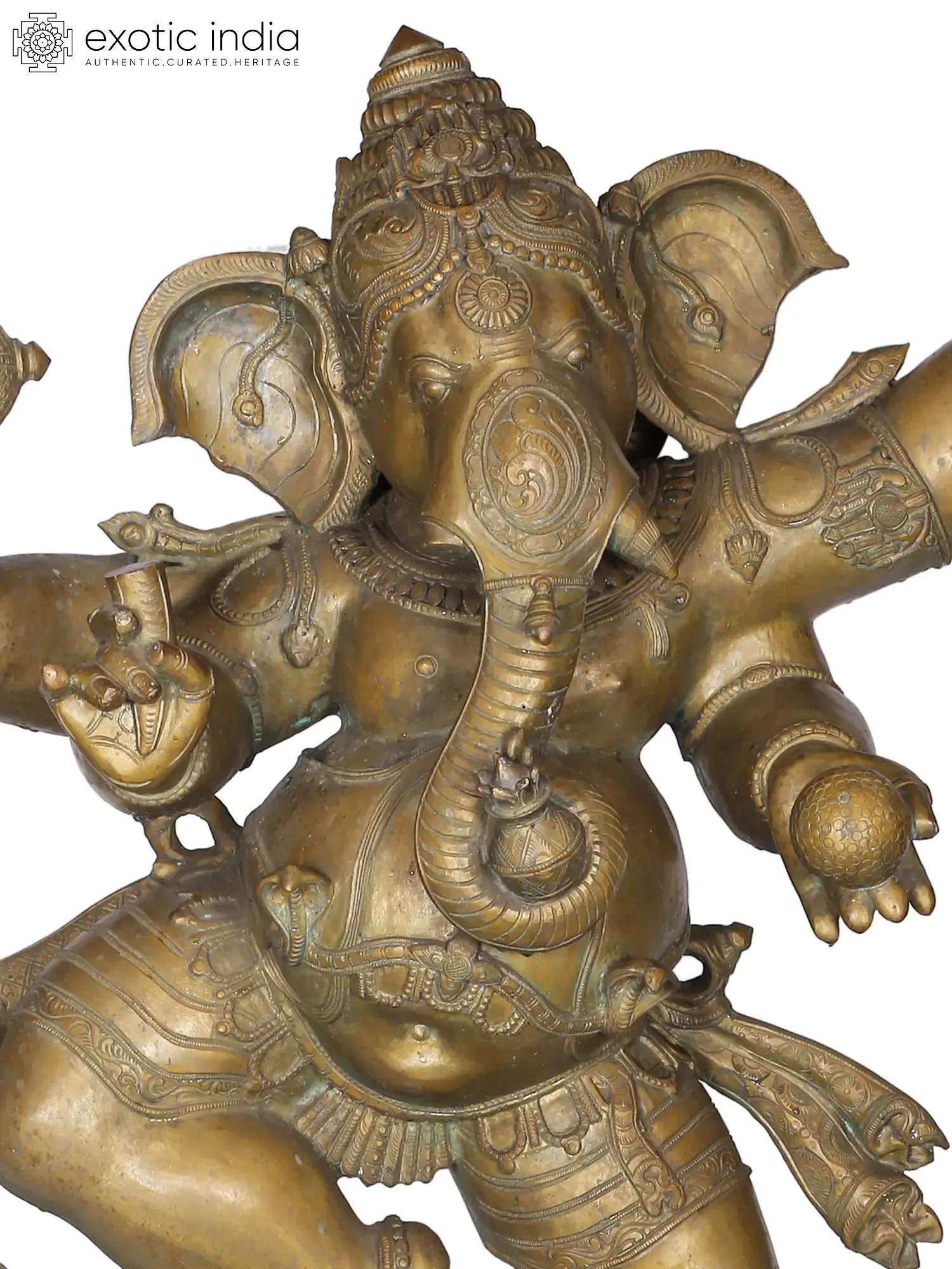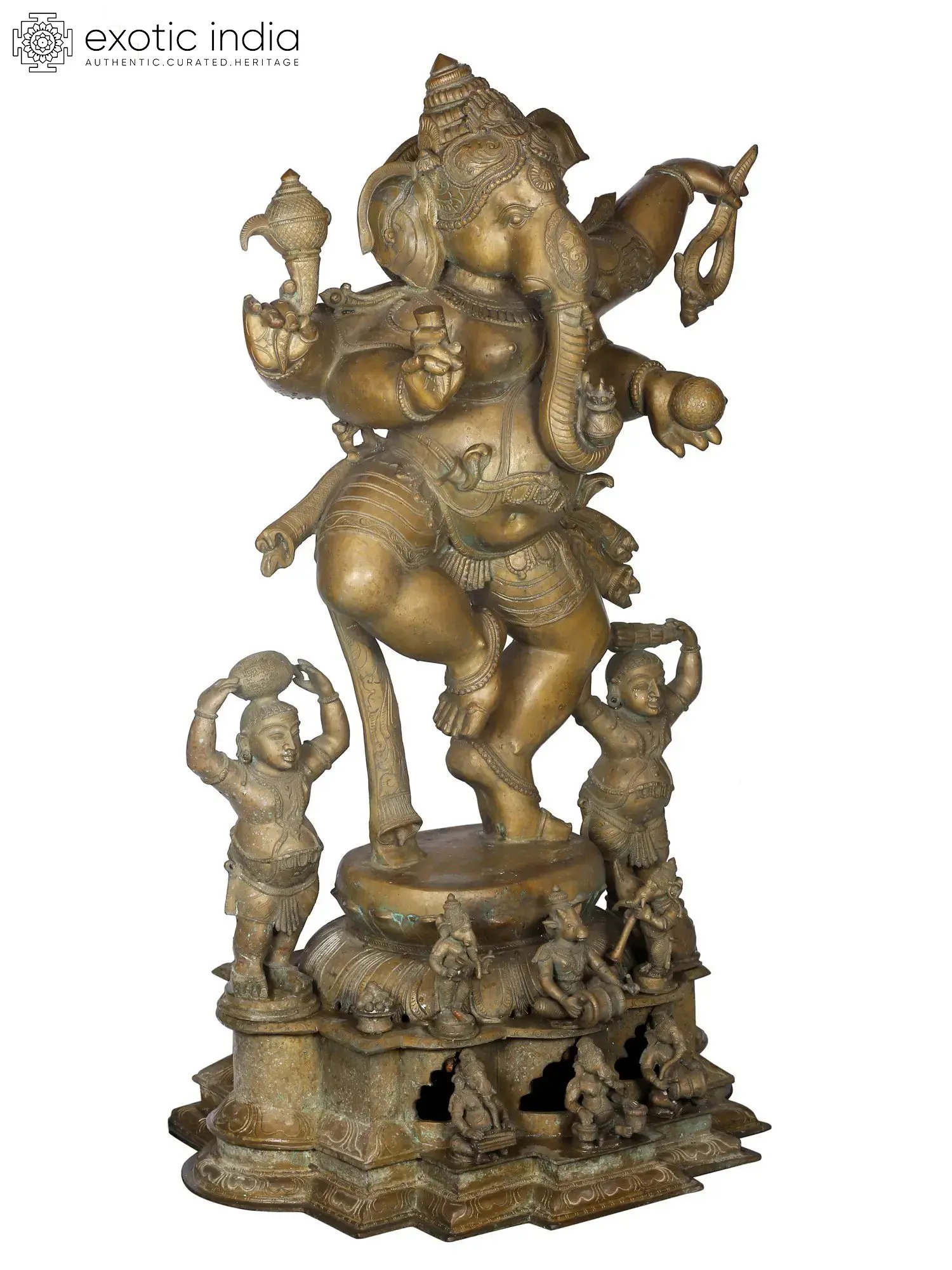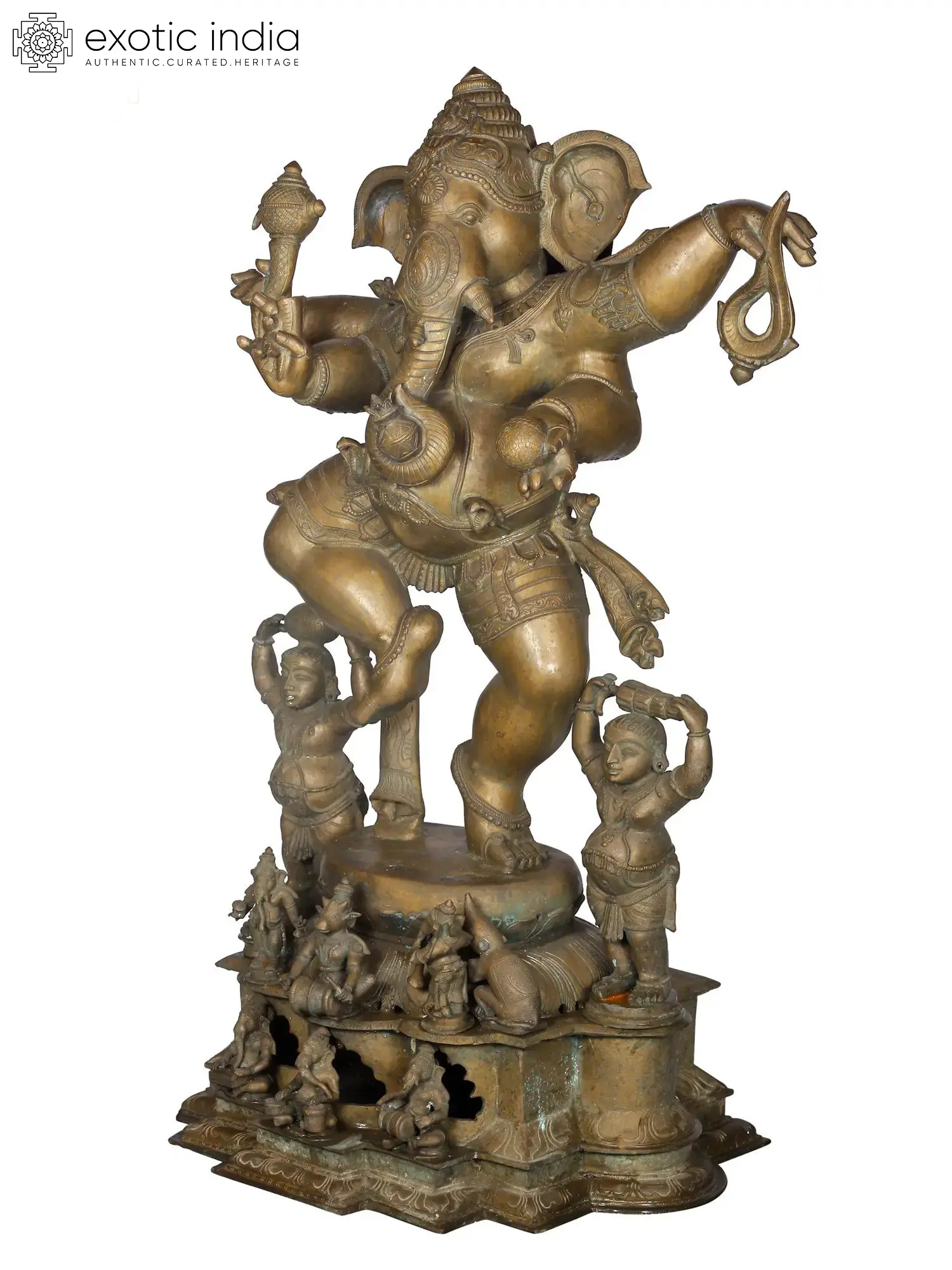 Known as Vighnaharta, Lord Ganesha removes obstacles for those who seek his blessings! Here is a joyous manifestation of him - Nritya Ganapati, raising his left leg in the air, as the right leg rests on the toe; he dances to Nandi playing the drum and other smaller Ganapatis as Vadakas playing trumpets and bells to the rhythm. His consorts Riddhi and Siddhi stand next to him on both the sides, representing faith and progress.