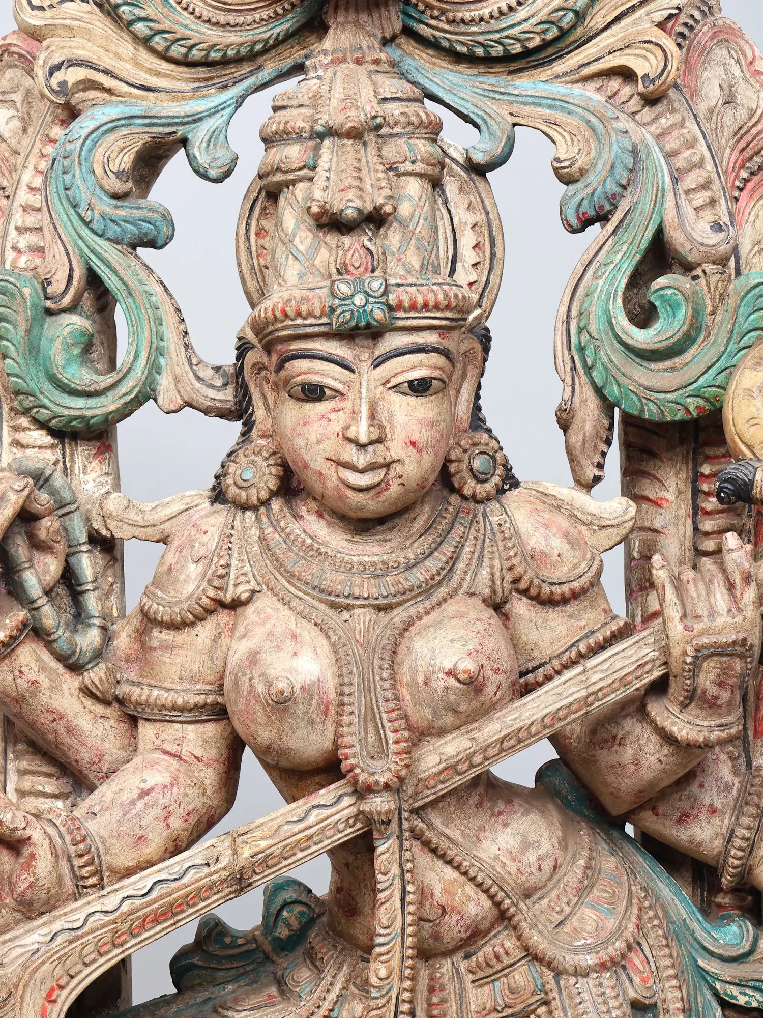 44" Large Goddess Saraswati Dancing and Playing Veena on Kirtimukha Throne | Wood Carved Statue