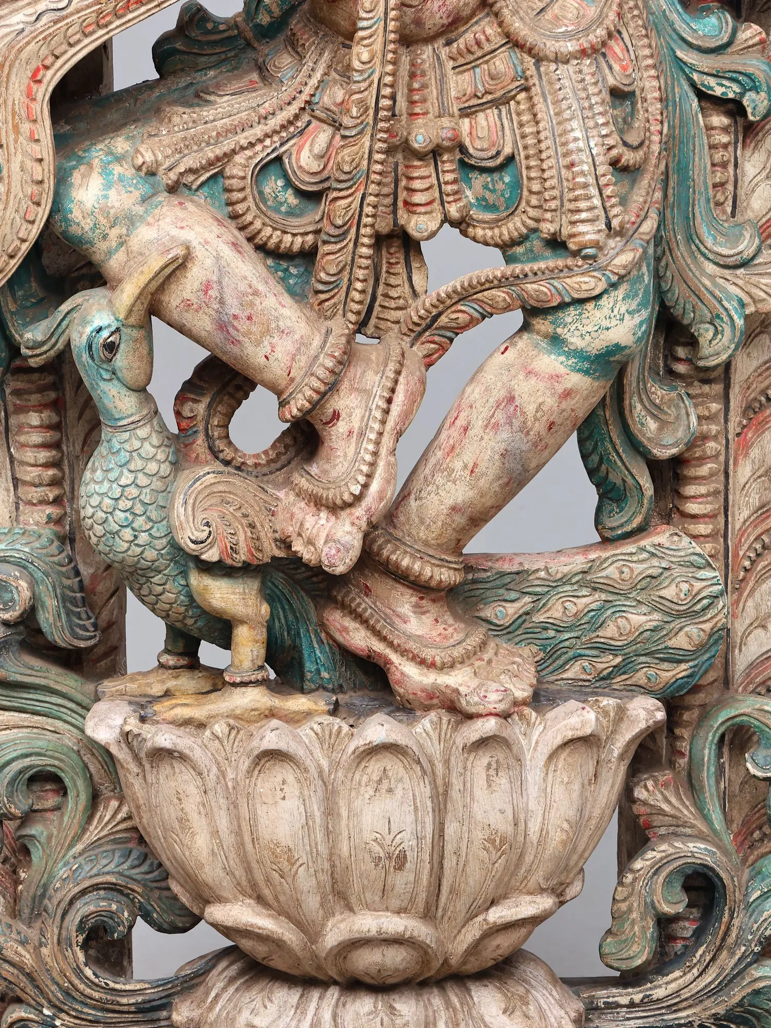 The dynamic portrayal of the divine figure is breathtaking, with each limb conveying a sense of fluid motion and ethereal grace. You'll be captivated by the exquisite carving of the flowing garments, the intricate jewelry, and the serene yet powerful expression on the face. The accompanying details, such as the auspicious peacock and the delicate lotus bloom upon which she stands, are rendered with astonishing lifelike quality, further enriching the visual narrative and spiritual resonance of the entire composition.