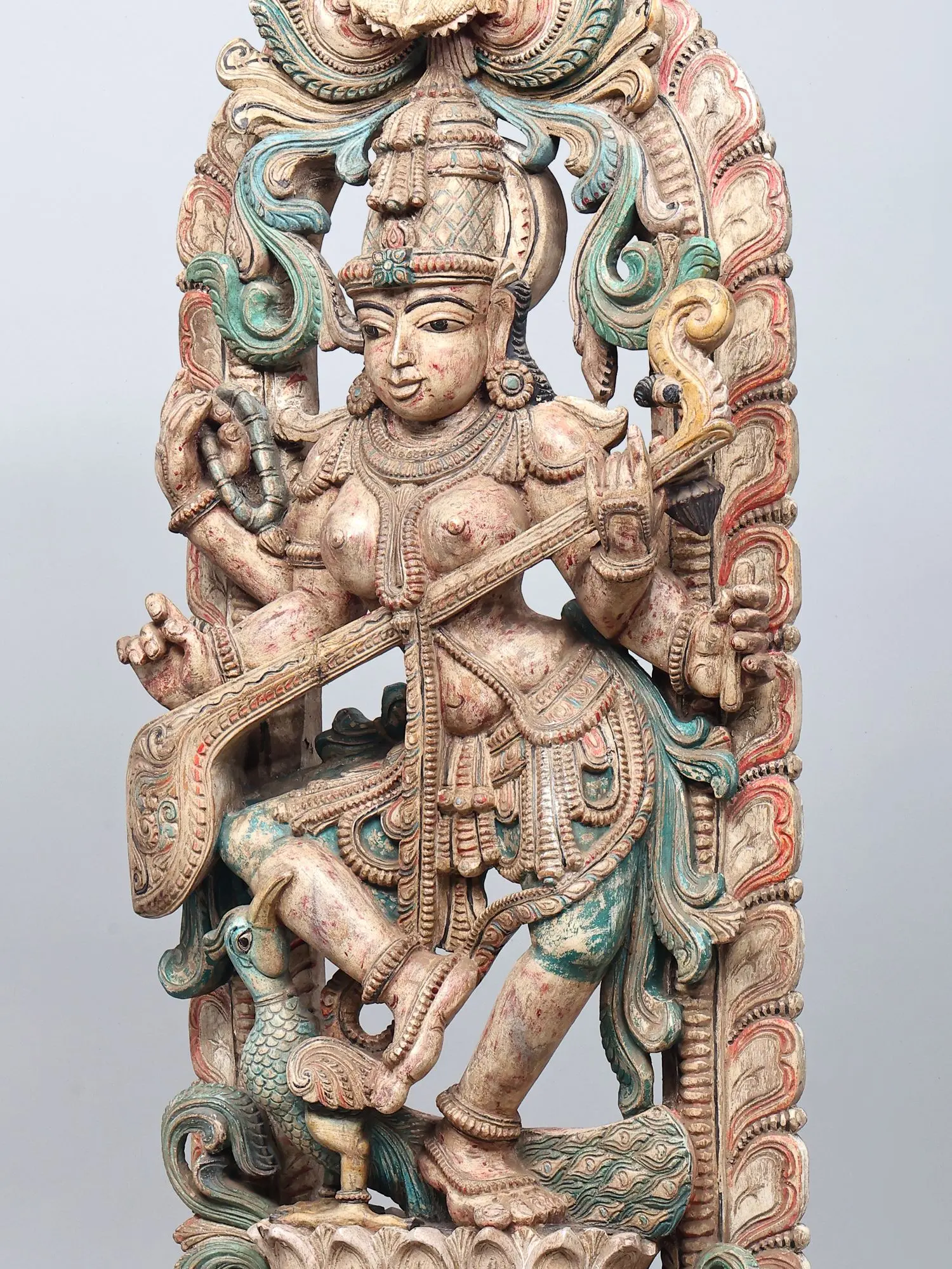 51" Goddess Saraswati Playing Veena Wooden Statue with Swan (Vahana)