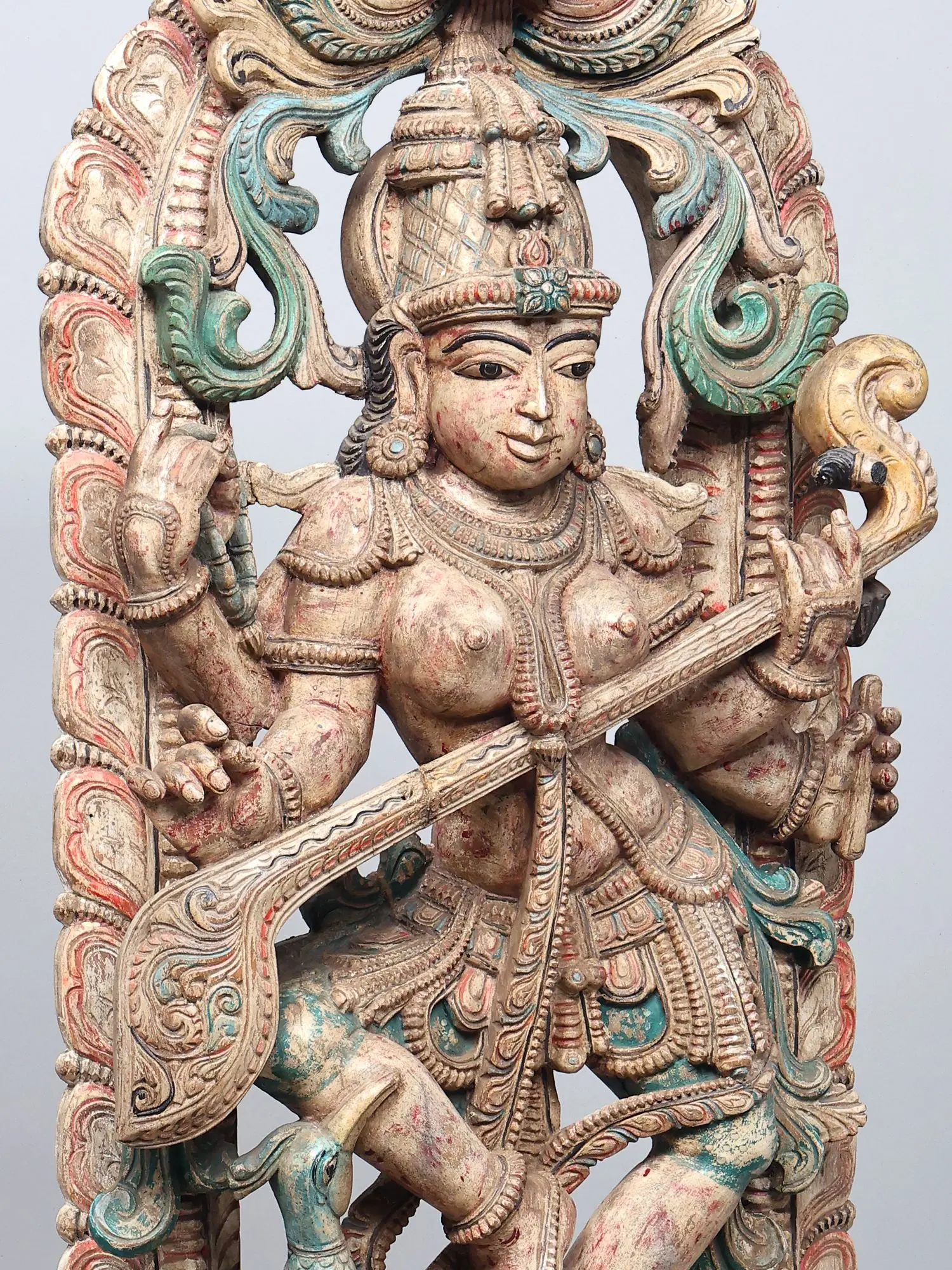 Wood Carved Statue: 36" Large Dancing Saraswati with Veena