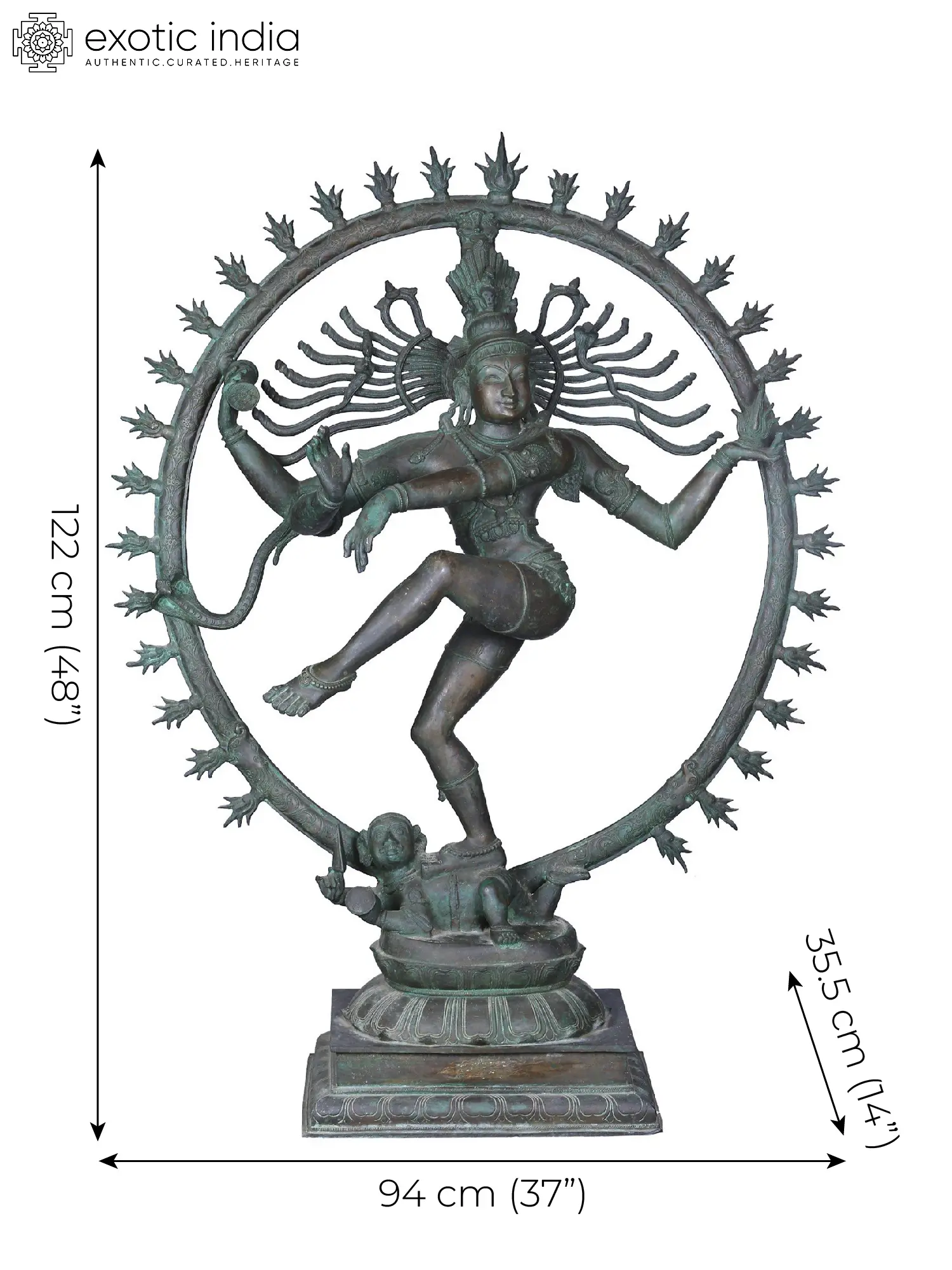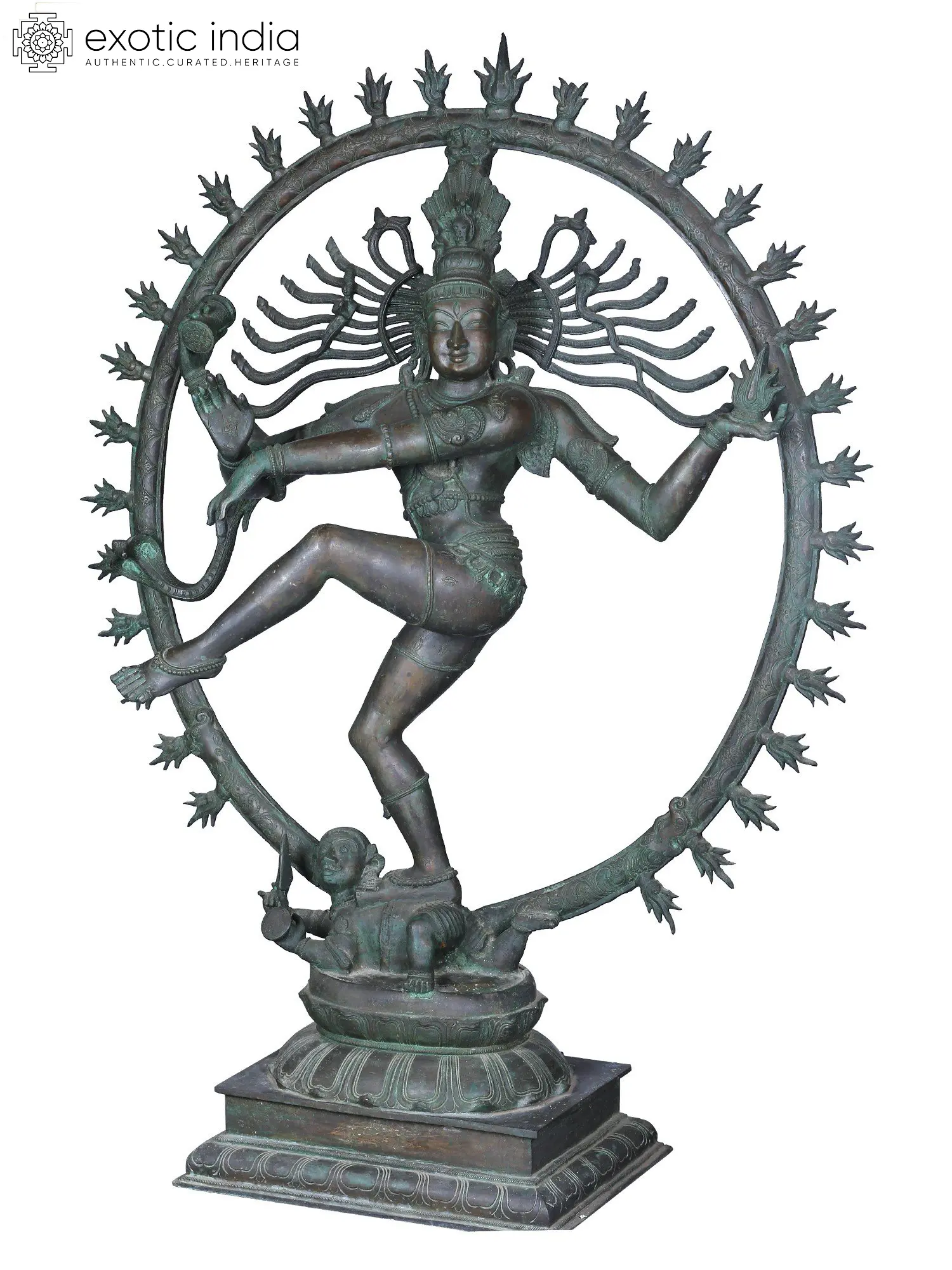 Surrounded by a flaming aureole, Shiva's dance is a reminder of the eternal cycle of life, death, and rebirth. The Panchaloha alloy, a sacred five-metal alloy, imbues the sculpture with an ethereal aura, its golden luster and rich patina reflecting the divine light of Shiva's presence.