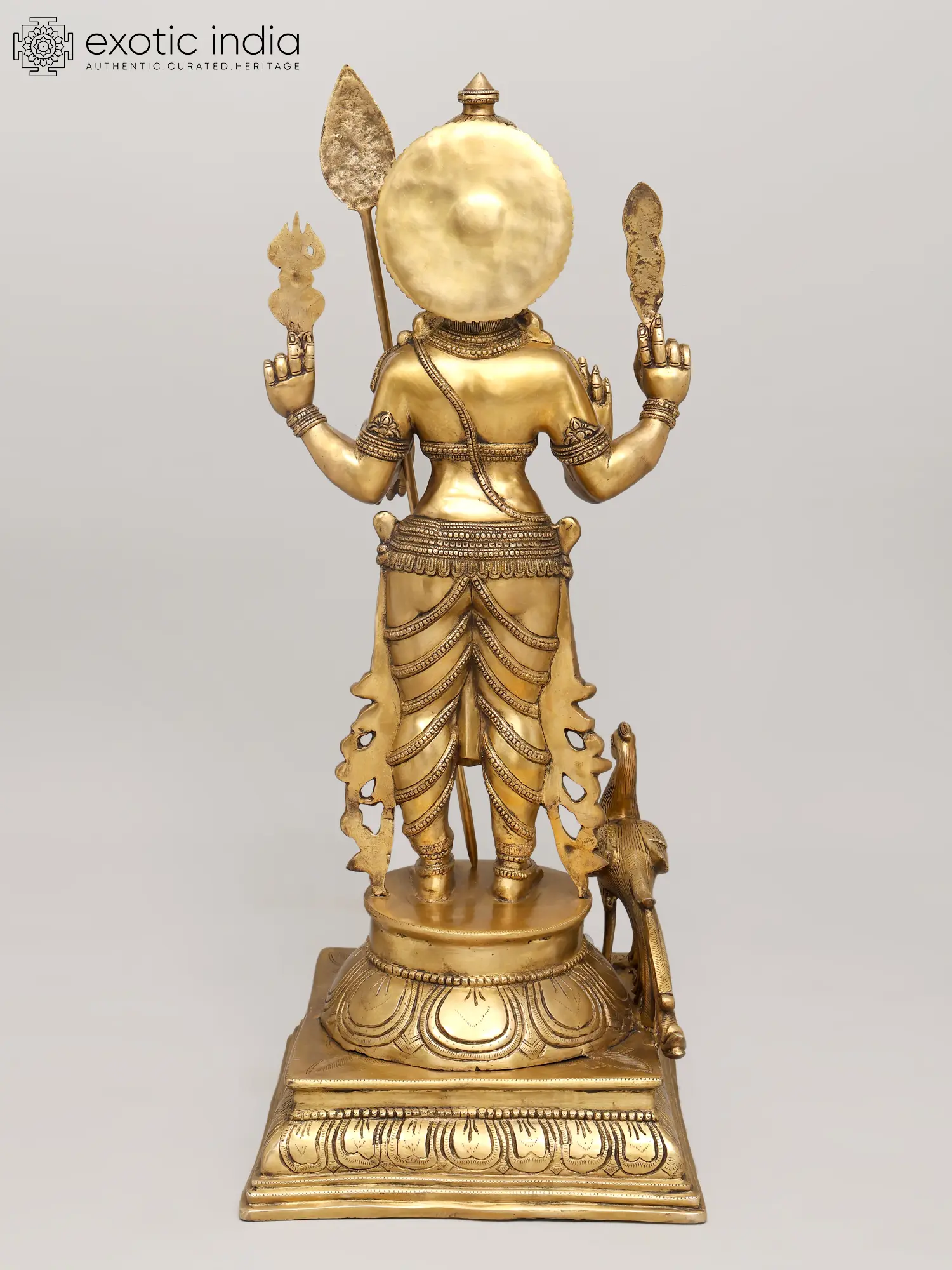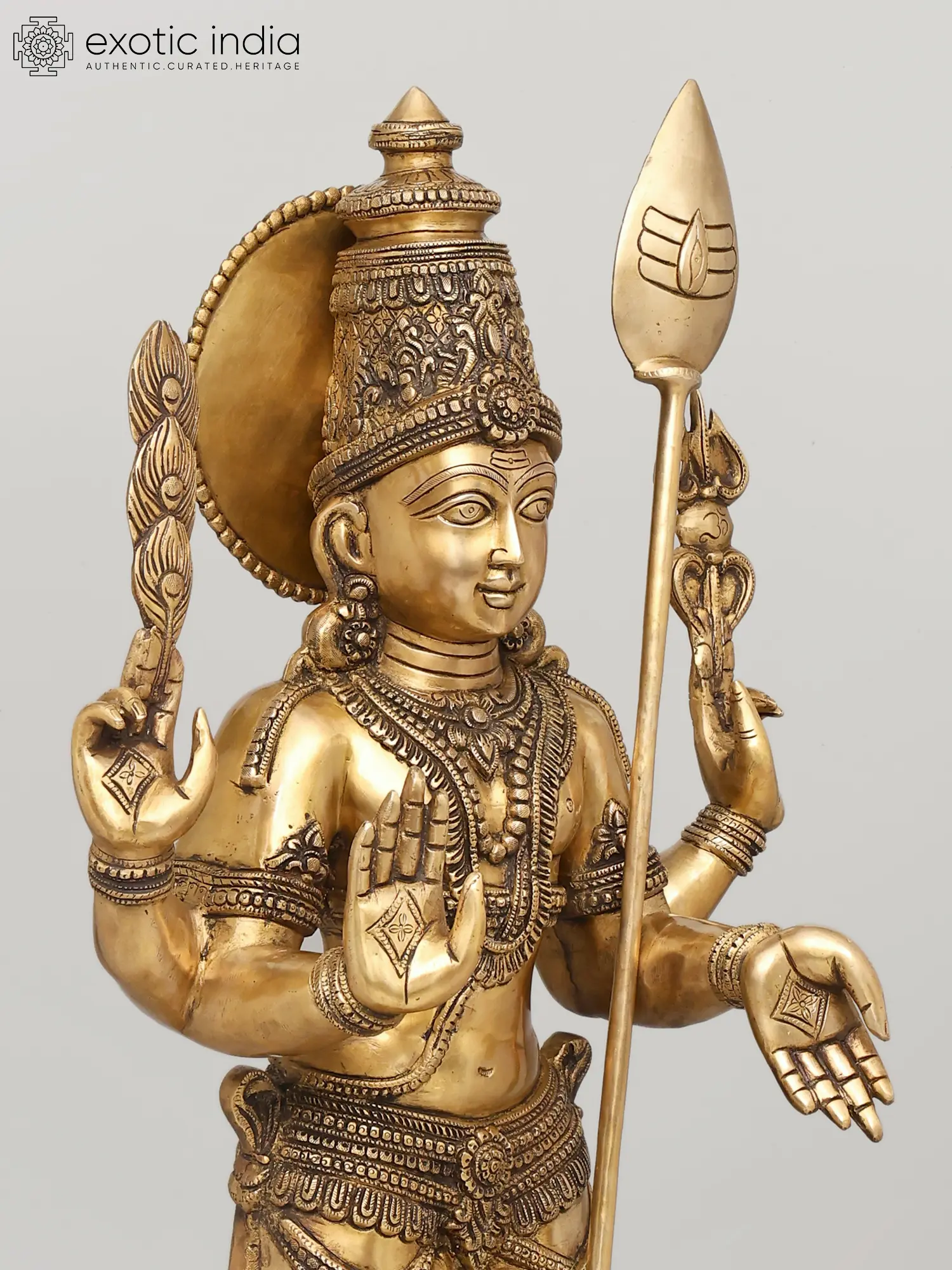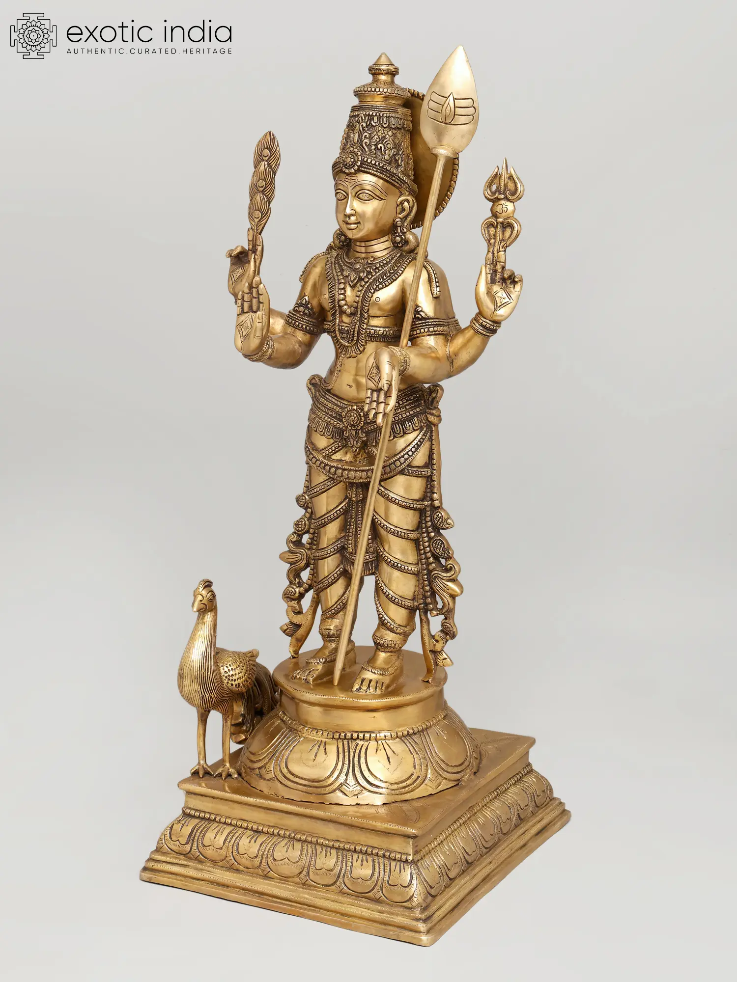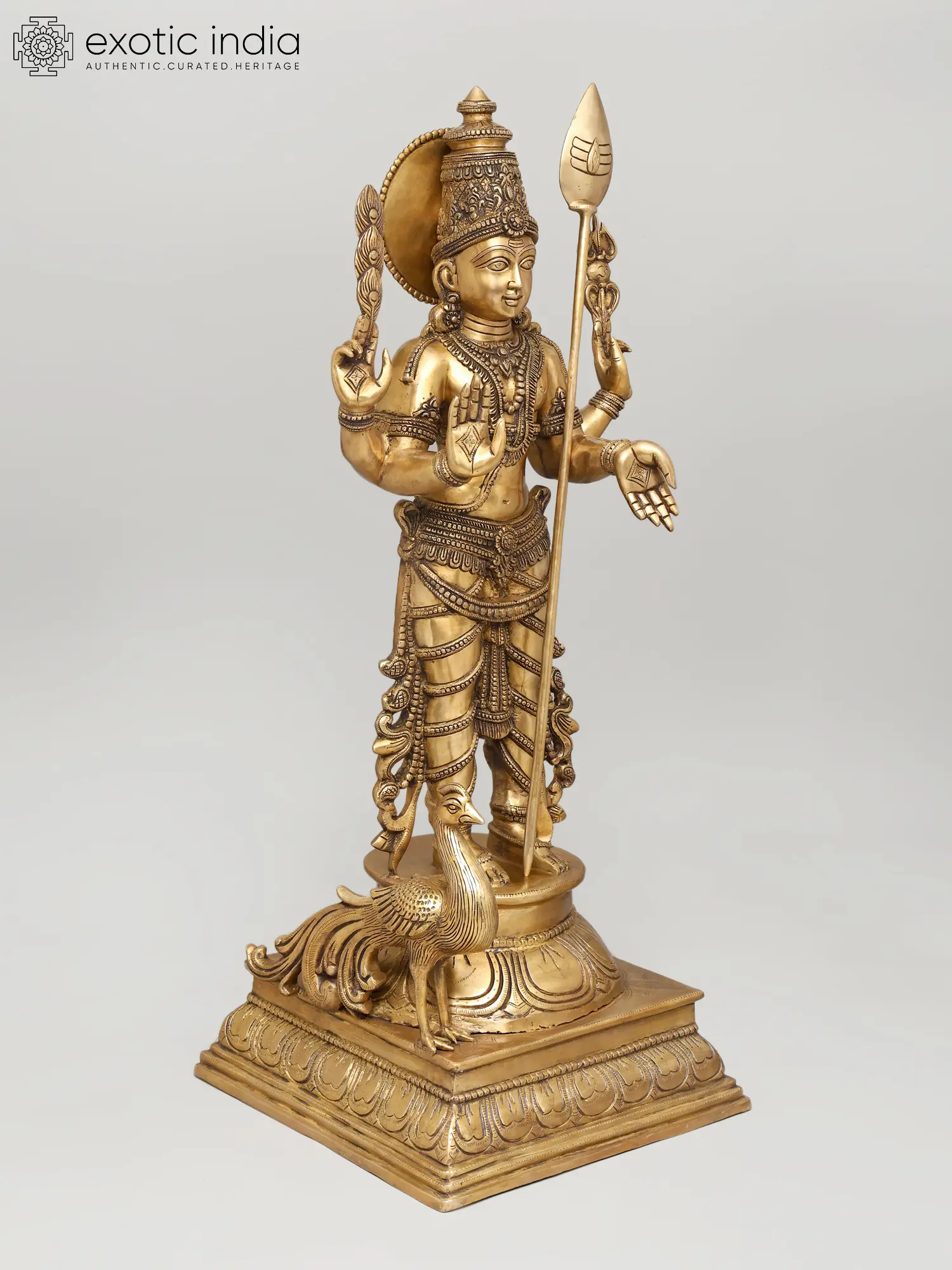 The two-tiered pedestal grounds the sculpture in ritual dignity, while the polished brass surface, softened by subtle tonal variations, enhances its sense of life. This image stands as a refined and complete expression of Murugan as Kumara, youthful, resplendent, and fully realised in divine command and grace.