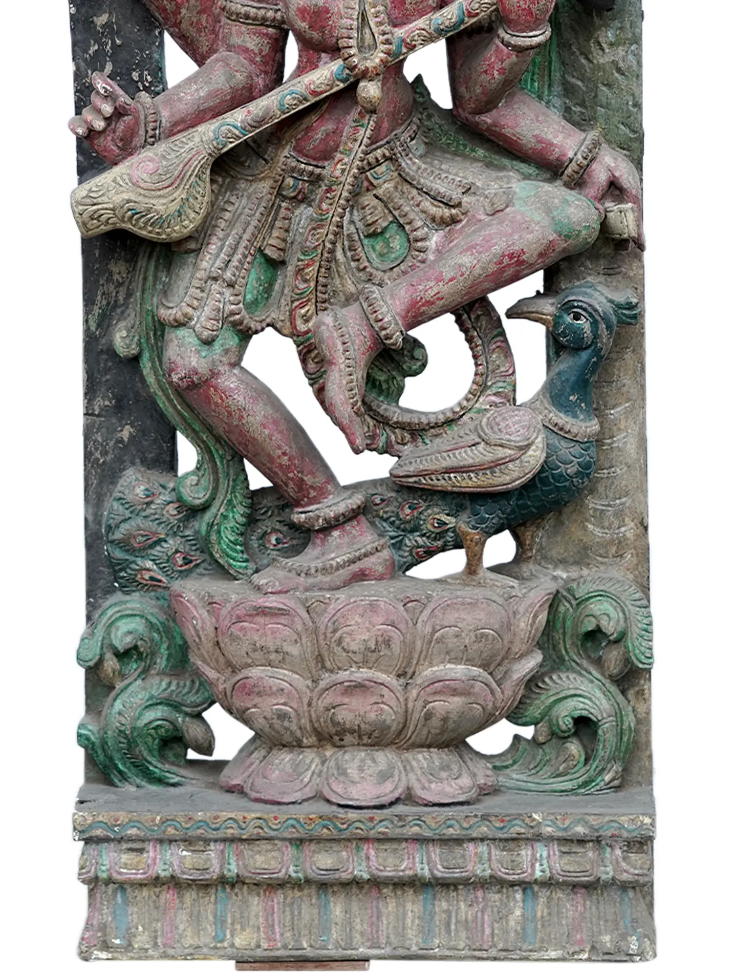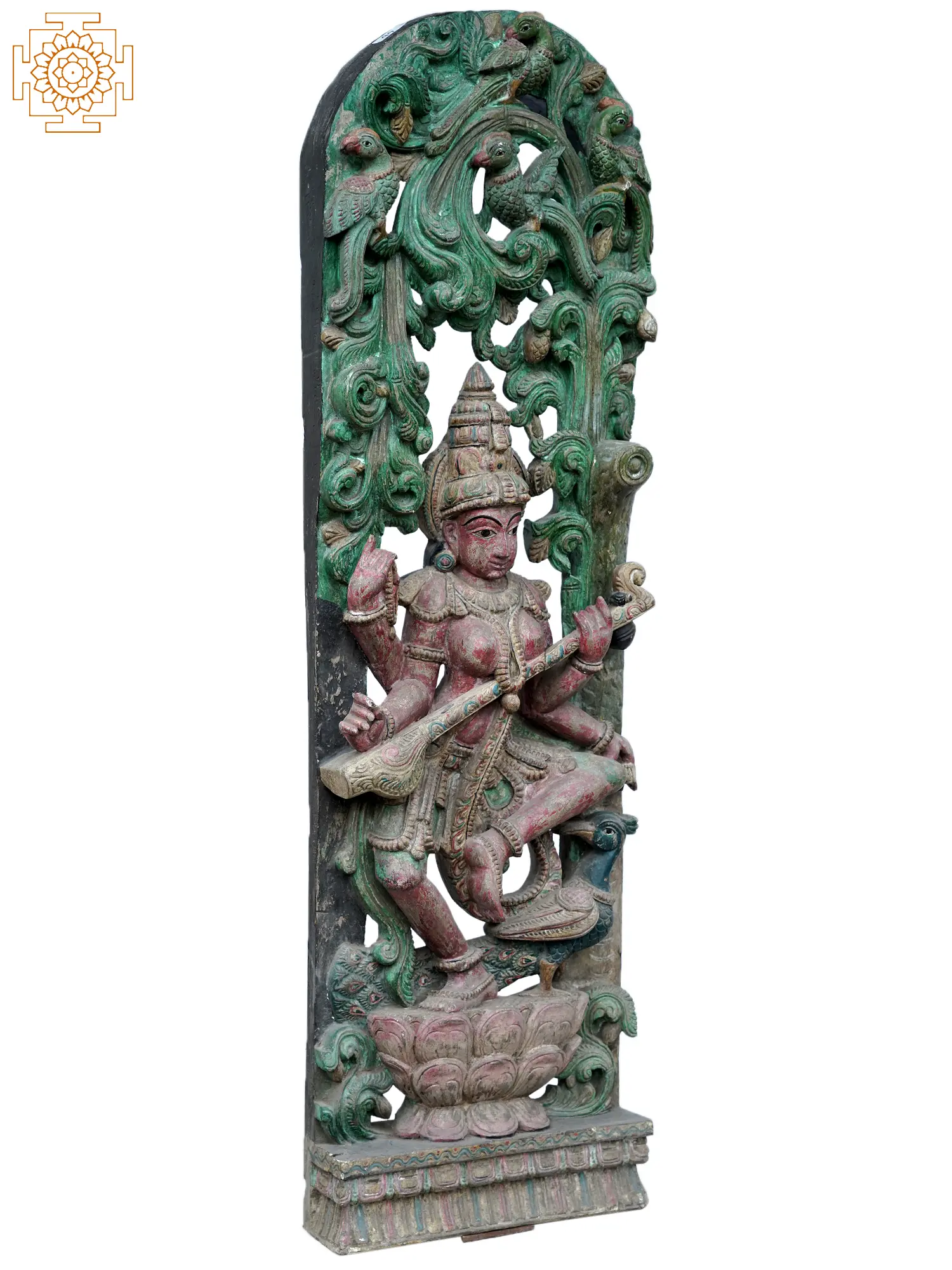 24"Goddess Saraswati Seated on Lotus | Wood Carving