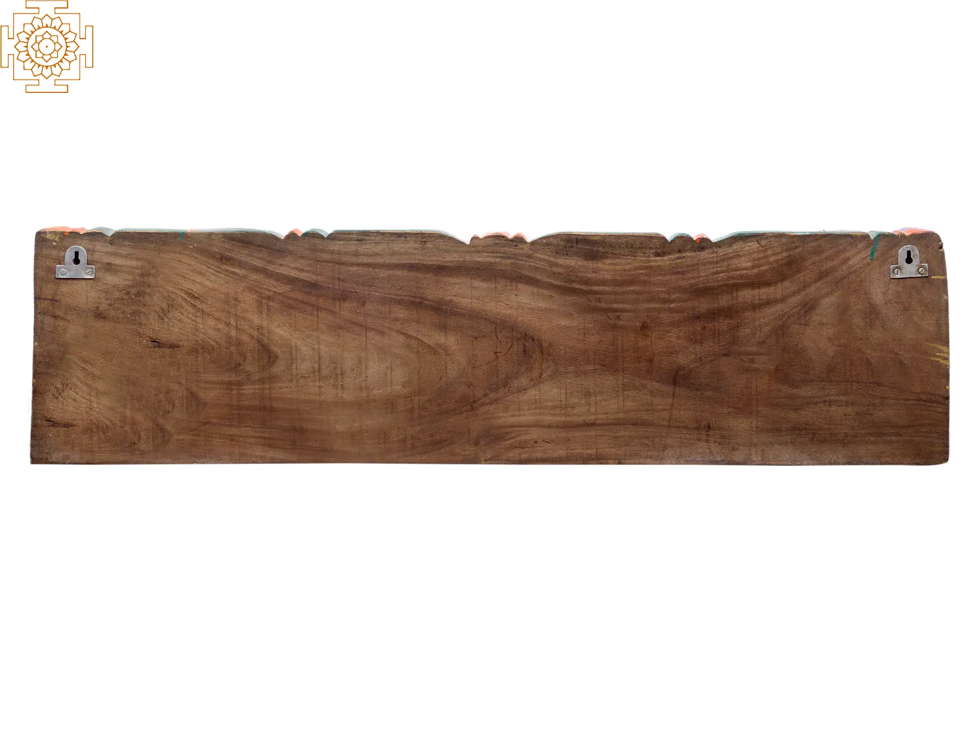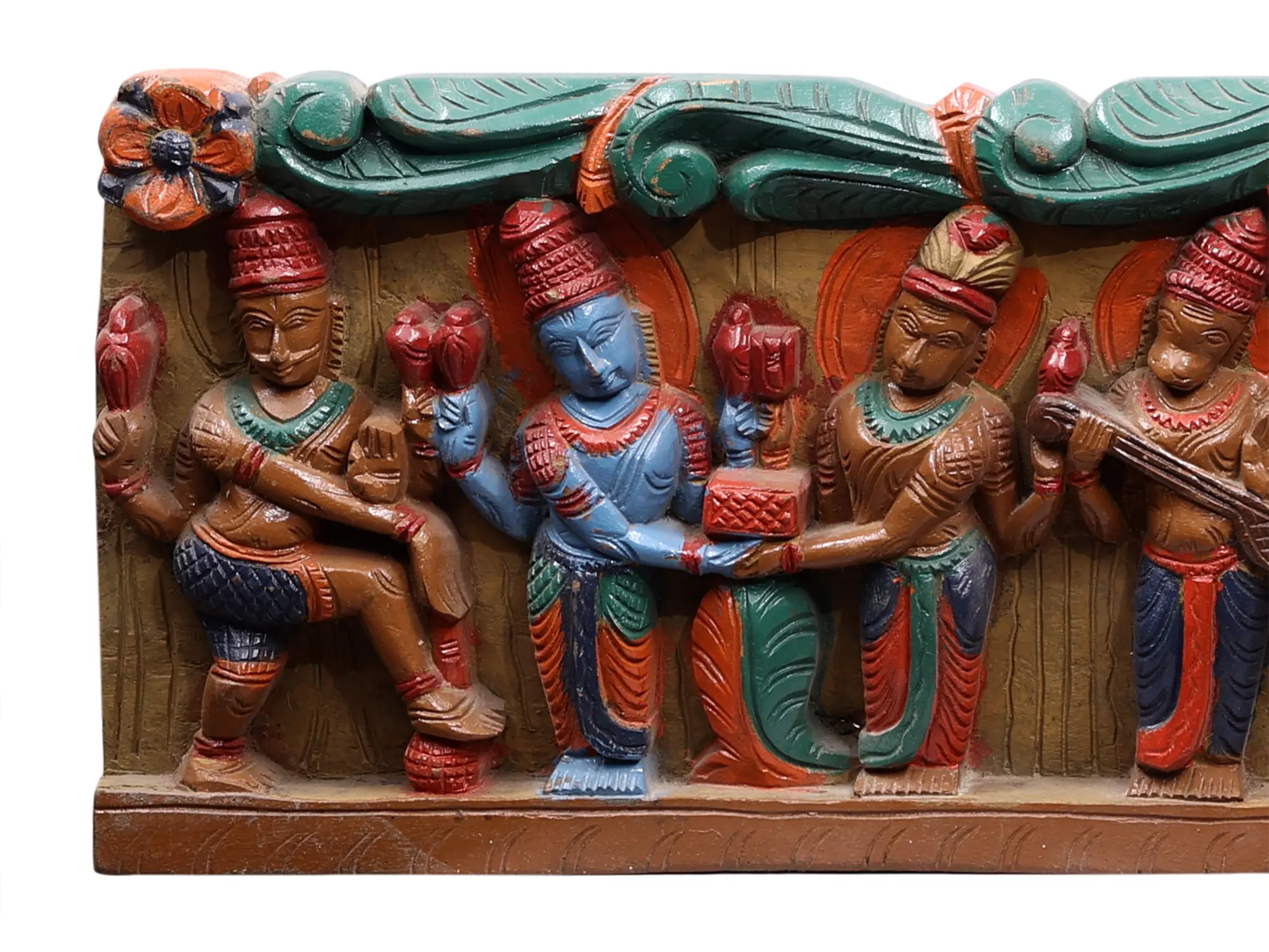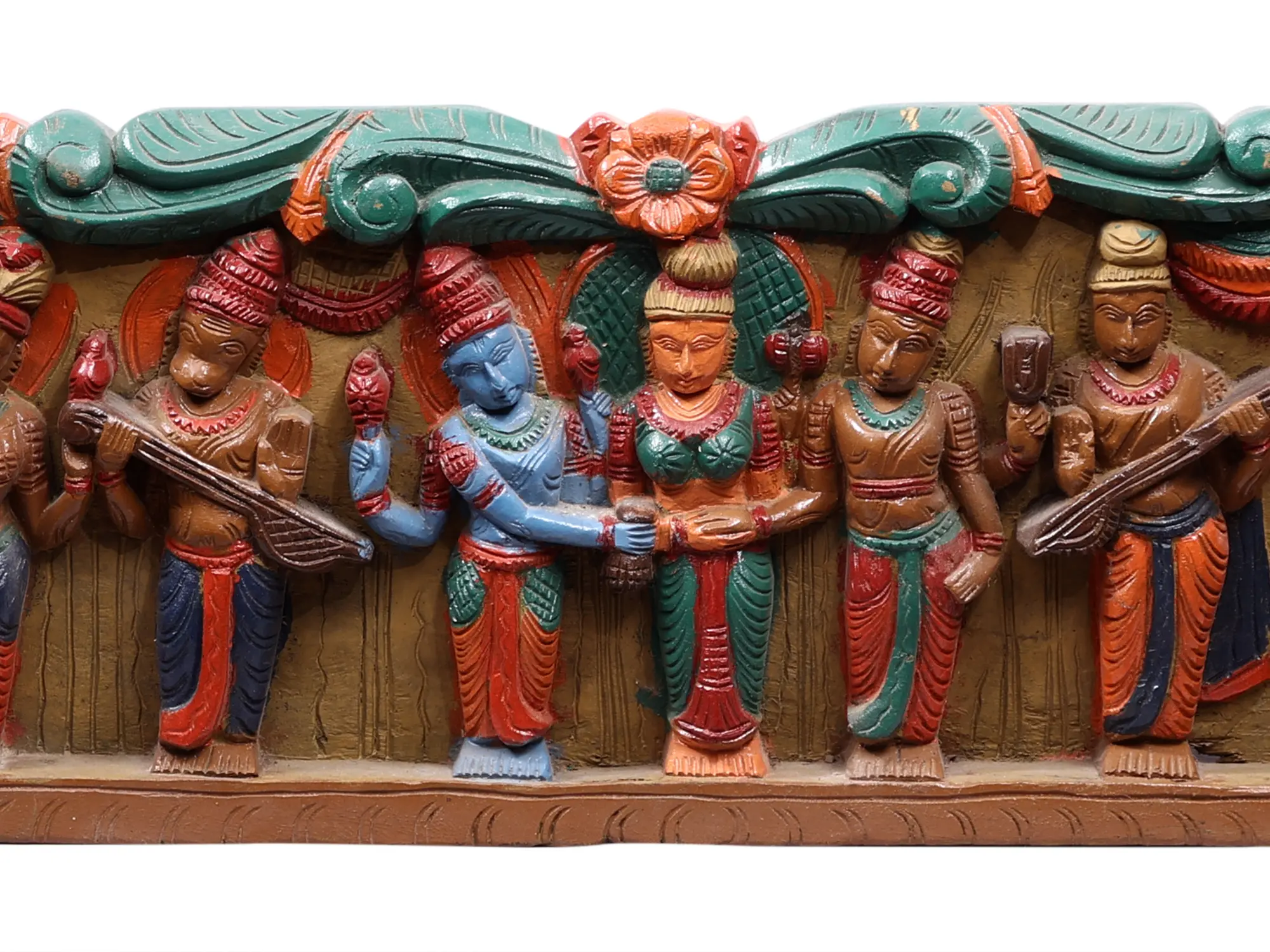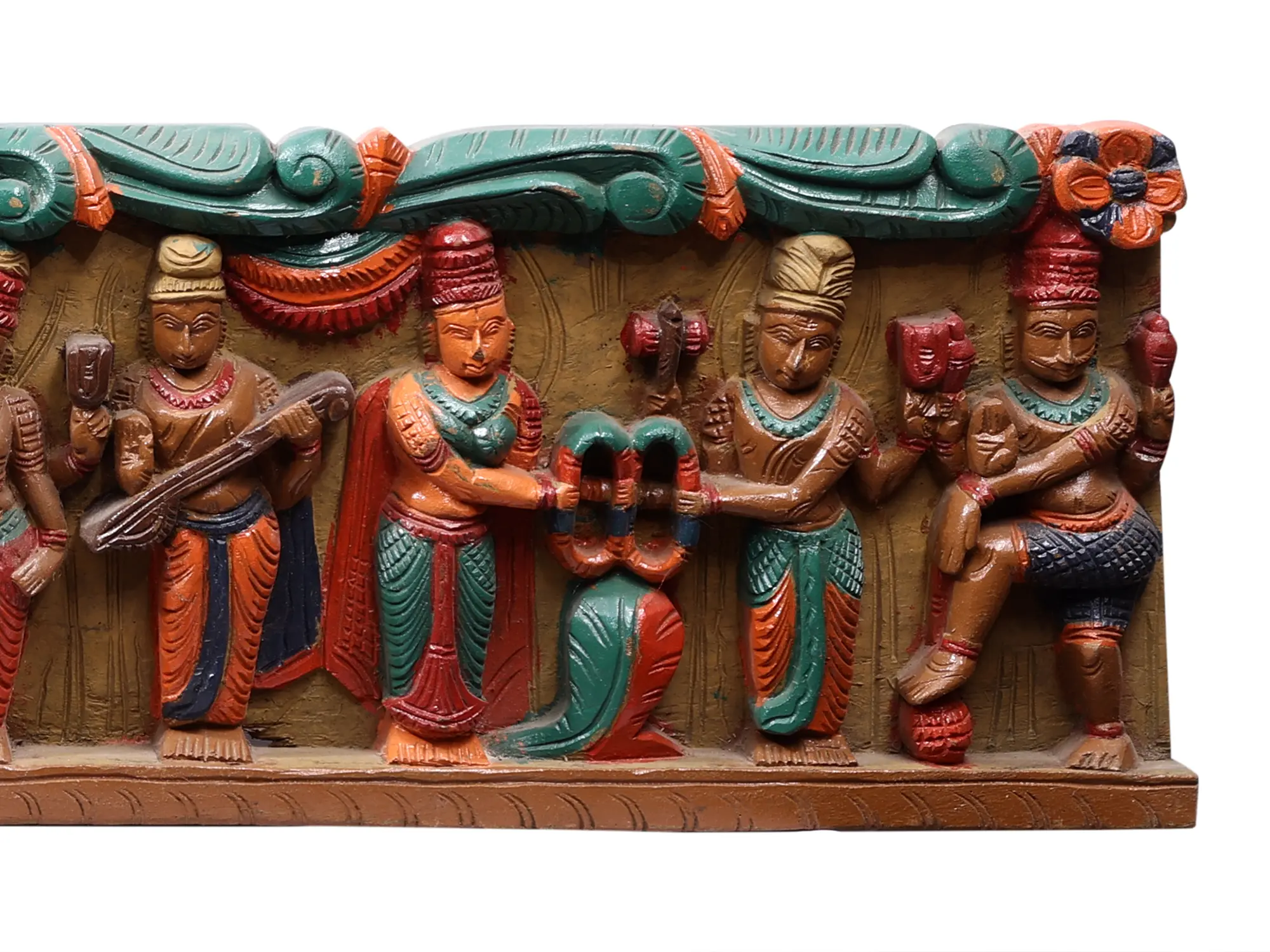 Immerse your home in the auspicious presence of a timeless divine event with this magnificent wood carving. This expansive wall panel, stretching an impressive 48 inches, meticulously depicts the Kalyana Sundaram – the divine wedding ceremony of Lord Shiva and Goddess Parvati. Each figure, from the celestial bride and groom to the attendant deities and sages, is rendered with exquisite detail, capturing the joy, reverence, and grandeur of this sacred union. The rich, warm tones of the wood, enhanced by vibrant painted accents, bring this ancient tale to life, making it a truly captivating centerpiece for any room.