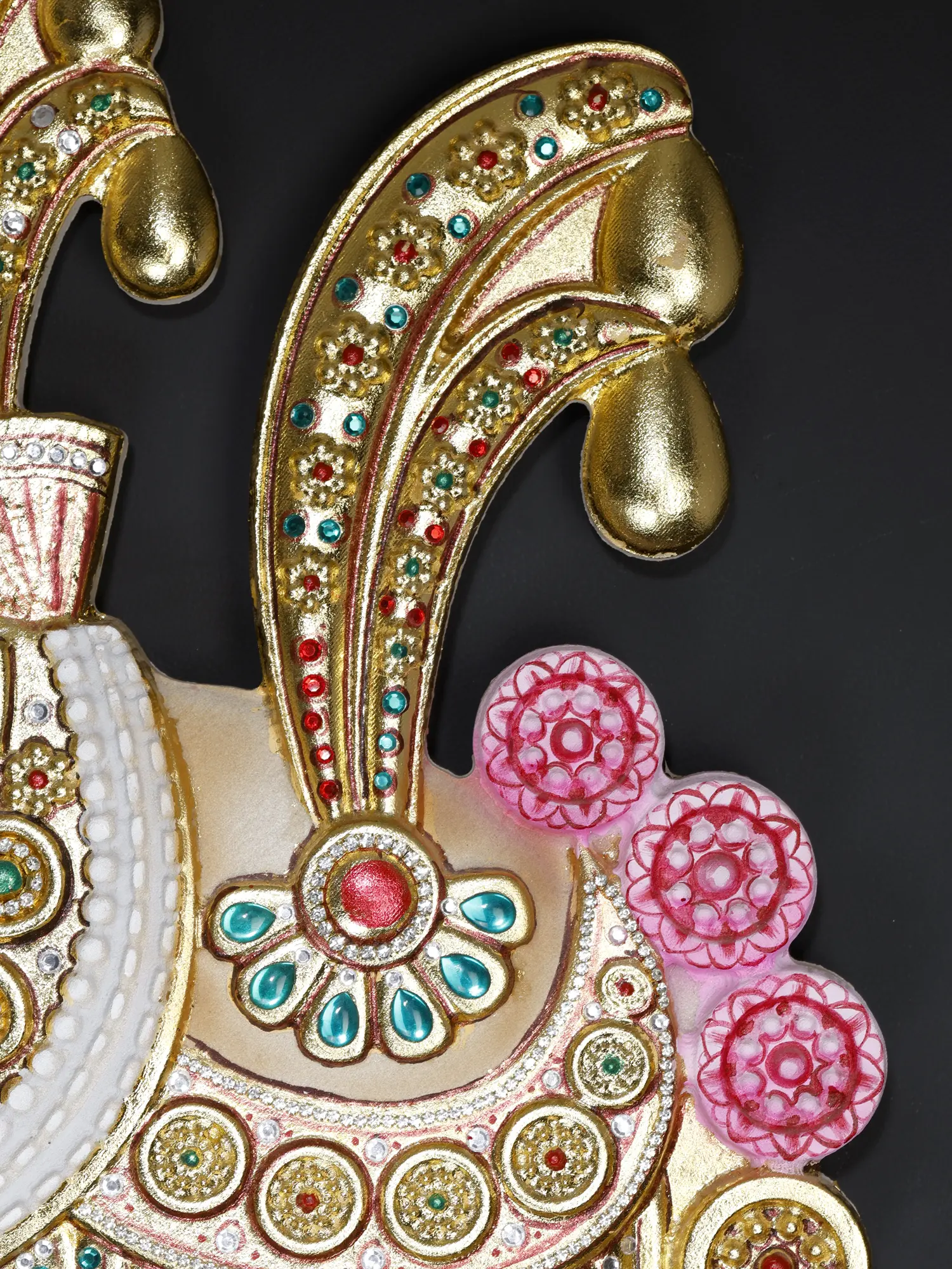 Like a cosmic white lotus, Srinathji seems to be blooming in a pond of gold. His elaborate headgear, with a large peacock feather, bird-shaped earrings, colorful stone pieces, and floral embellishment frames the exquisite expressions of the Lord, marked by the lotus eyes and pink lotus-like lips- lotuses blooming within His lotus face!