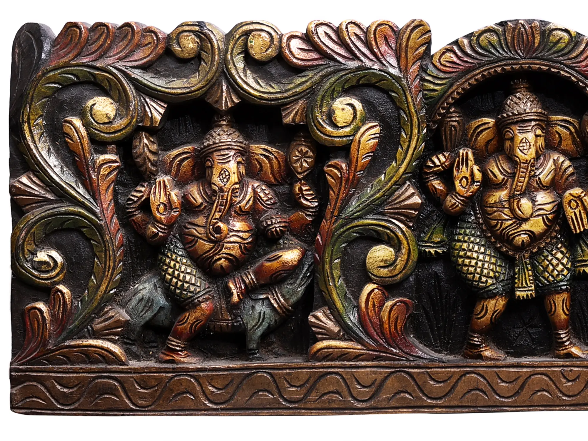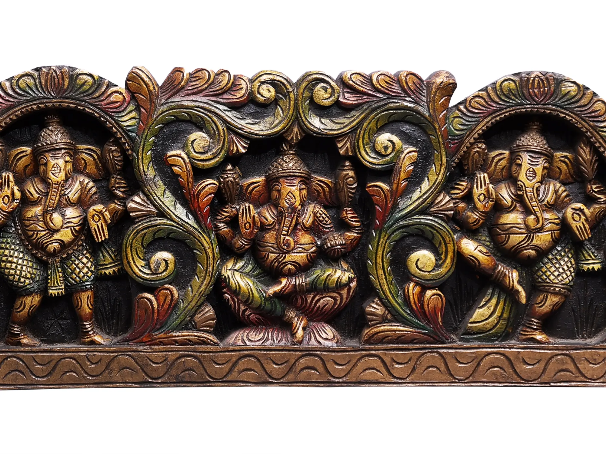 The might and mastery of Ganesha are celebrated in this wooden wall panel, through his different forms- enthroned on Mushak, standing in an active and benevolent mood, sitting on Padmasana or lotus throne, dancing beautifully, and in an upright pose. Gorgeous vines adorn this divine imagery, framing the Ganesha depictions as an ancient symbol of life that blooms in the presence of the auspicious Lord of Obstacles.