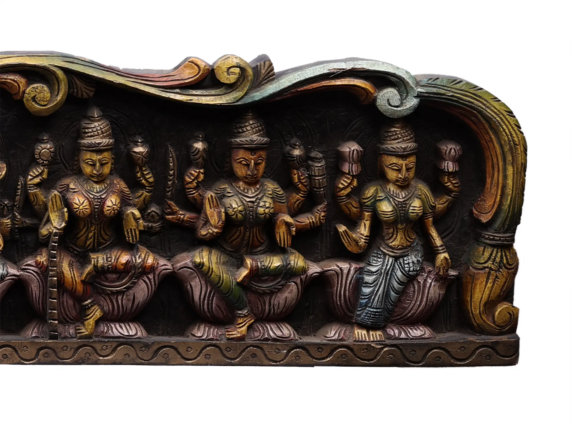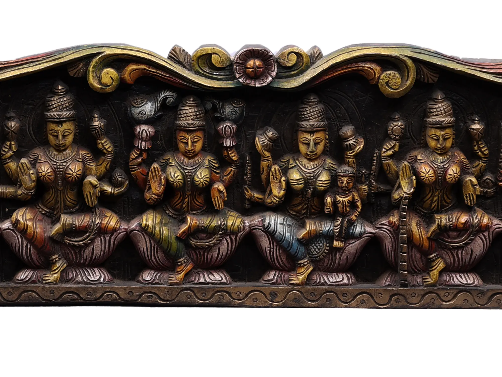 This generously sized wooden panel, measuring 48 inches in length, is designed to be a captivating focal point in any room. Whether gracing your living room, meditation space, or entryway, it will undoubtedly draw admiration and foster an atmosphere of peace and prosperity. The rich, earthy tones and the vibrant, yet tasteful, color palette make it a versatile addition to various interior design styles, from traditional to contemporary. The tactile quality of the carved wood invites a connection to ancient artisan traditions and the natural world. Displaying this piece is an expression of devotion, a desire for auspiciousness, and an appreciation for the profound symbolism it represents. Let the serene presence of the Ashta Lakshmi on this exquisite panel inspire abundance, harmony, and divine grace in your life.