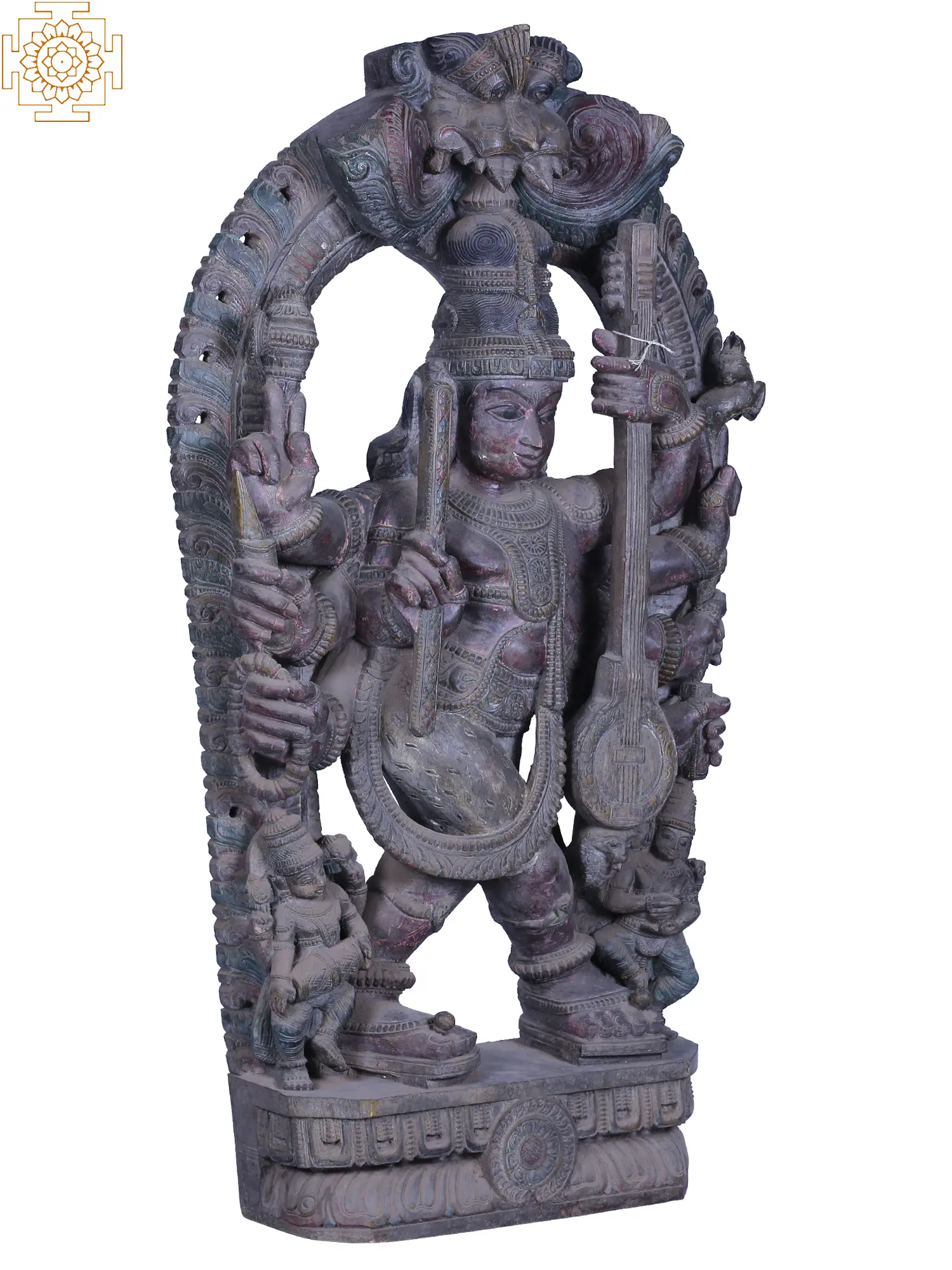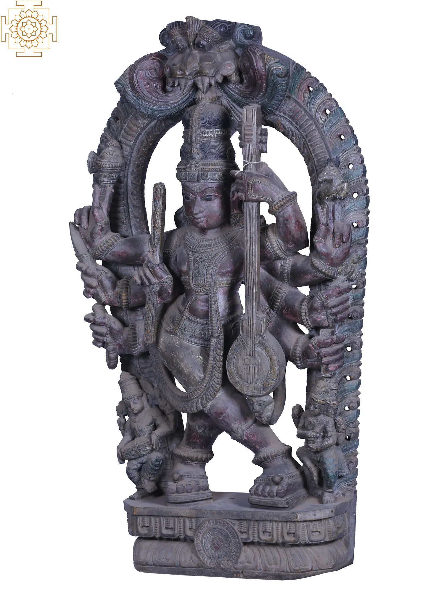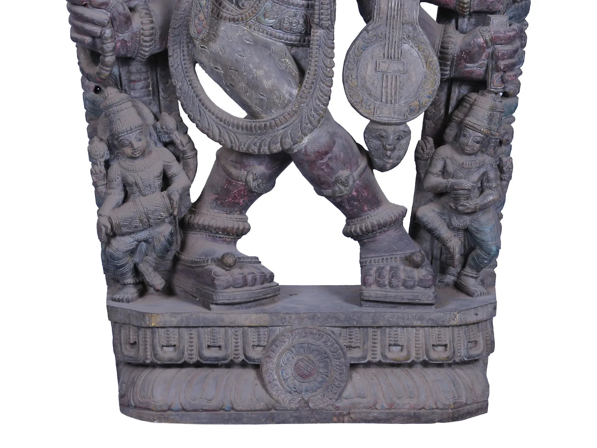 When we think of Shiva, the imagery is often singular in one’s mind, as a dancer in Ananda Tandava - Shiva, who’s beyond the regulation of imagination, carved into this stunning wooden figurine is depicted as a musician -Ashtabhujadhari Pasupati (eight-armed) about to perform the dance of cosmic essence within the Prabhamandala with a Kirtimukha. His eyes inspire an impression of fierceness, with his legs crossed; he holds an axe, dagger, Japa mala, Kartal, Sitar, antelope, fire, and sutra. Ornamented with chains and Naga coils, he wears the Khadau on his feet. Curved at his waist almost in the initiation of the movement, he’s accompanied by Lord Vishnu playing the mridangam and Lord Brahma playing the manjeera/jalra - together forming the rhythm of the world representing creation, preservation, and destruction.
