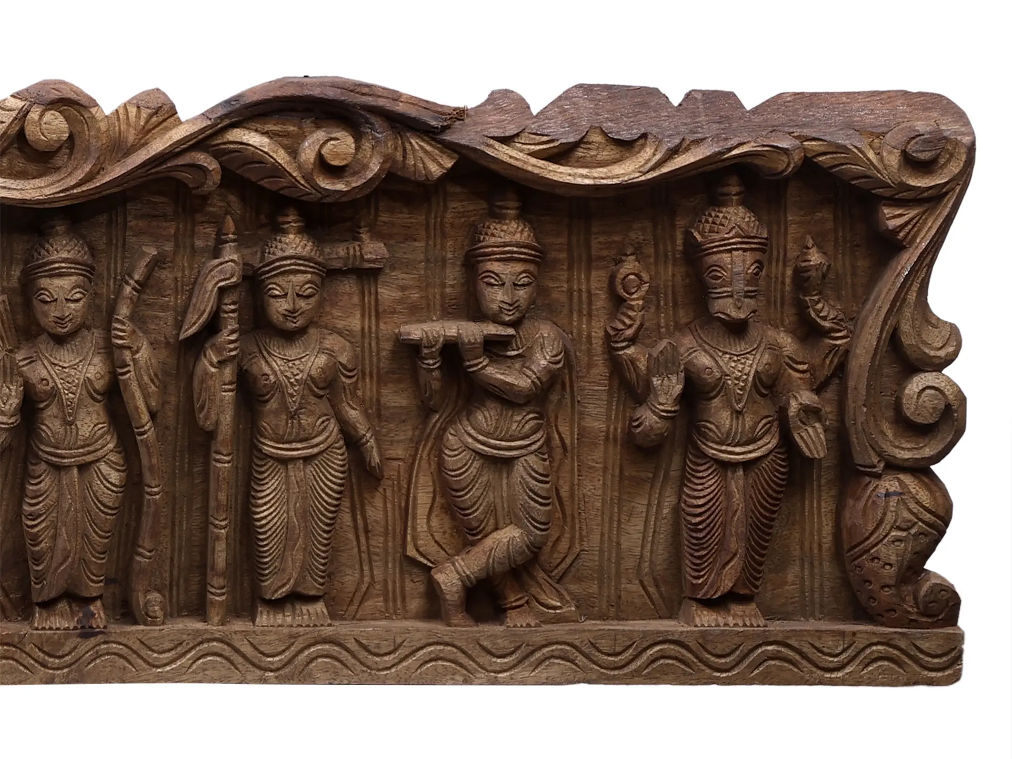 This magnificent wooden wall panel is a masterful depiction of the Dashavatara, the ten principal avatars or incarnations of Lord Vishnu. Each figure carved into the rich wood represents a divine manifestation that Lord Vishnu took to preserve dharma and restore cosmic order in times of crisis. From the aquatic Matsya and Kurma to the valiant Rama and the enlightened Buddha, and finally the prophesied Kalki, this panel encapsulates the cyclical nature of existence as understood in Hindu philosophy. The artistry involved in carving such a detailed narrative across the expansive length of this piece is truly remarkable, showcasing a tradition passed down through generations. ––––––––––