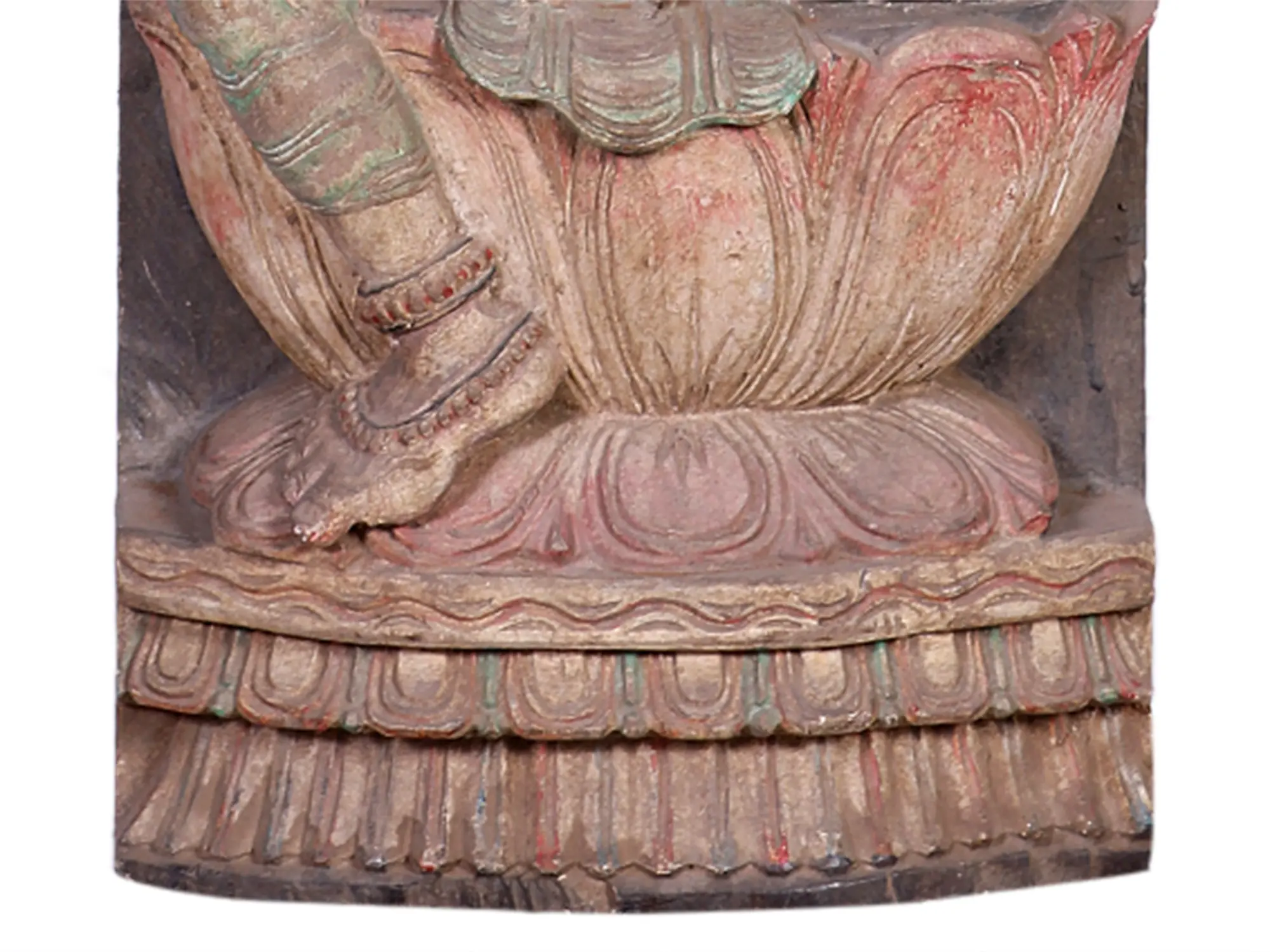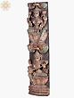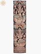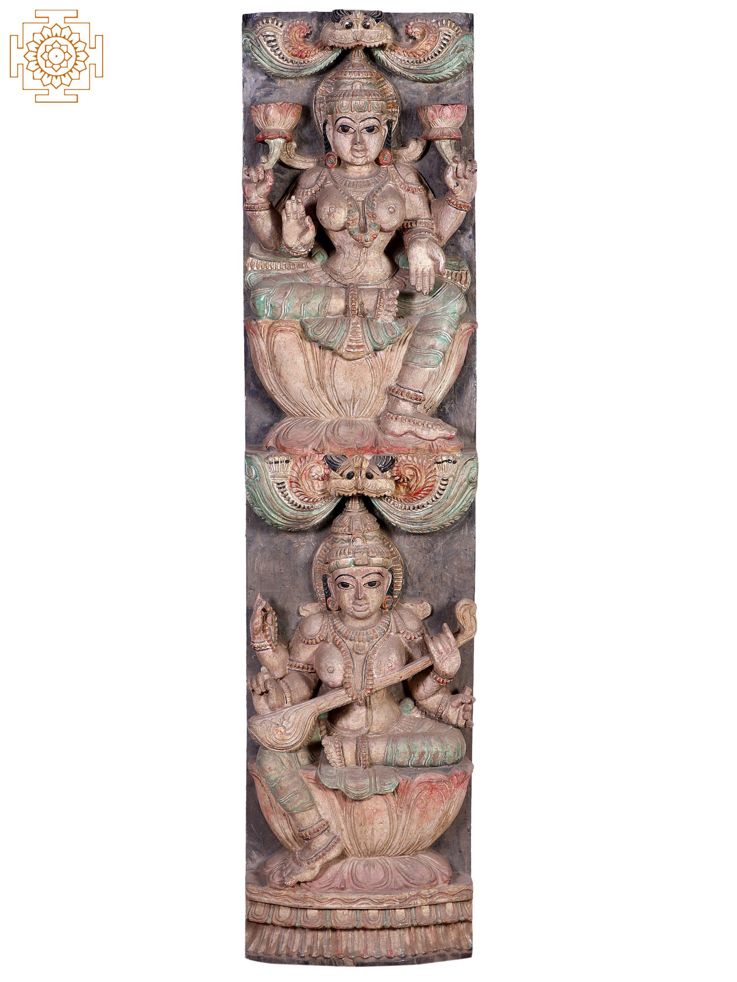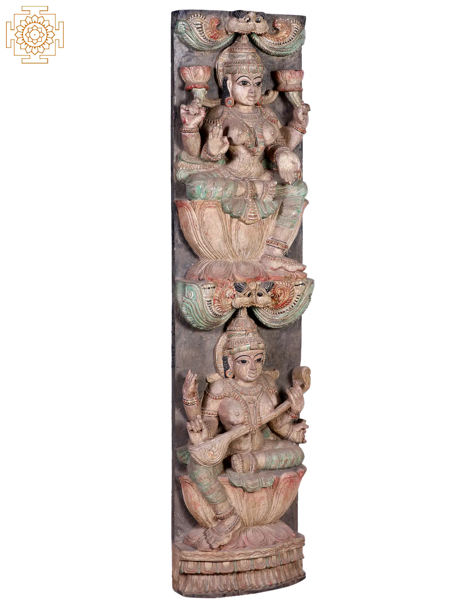 A twin-Devi wall panel to add to the auspiciousness of your space. Directly above Devi Sarasvati, is Devi Lakshmi in this compact longline wood-carved panel. Both seated in lalitasana, with the opposite limb pendant for each. Giant lotus-shaped thrones and, of course, the Kirtimukham motif above the crown.