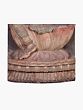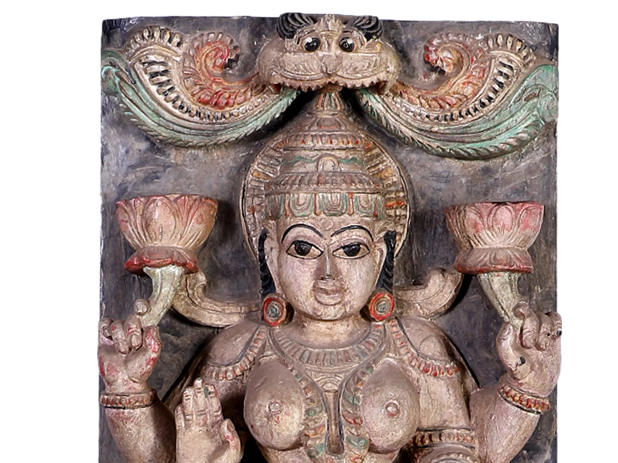 This twin Lakshmi-Sarasvati murti panel is carved from wood. The style and iconography are in keeping with the temple architecture of ancient South India. It is as if the Devis have emerged from the haloed vaults of a temple of yore, one presiding over plenitude (Lakshmi), the other over learning (Sarasvati).