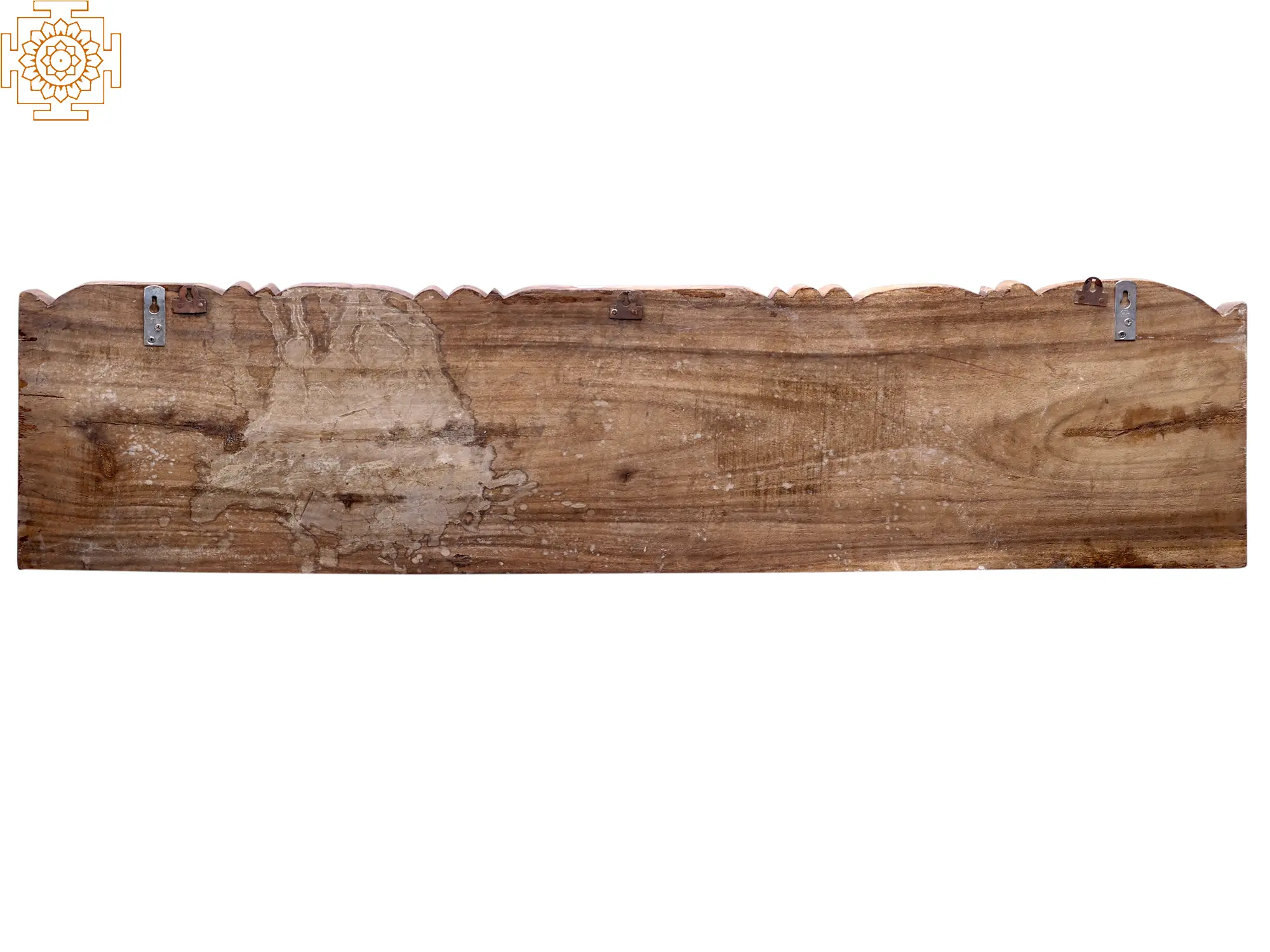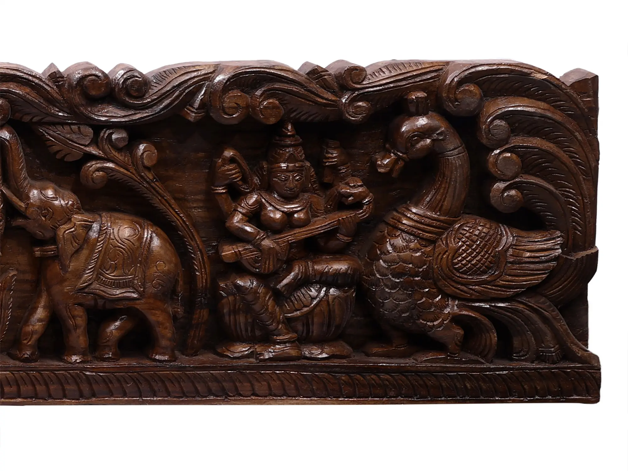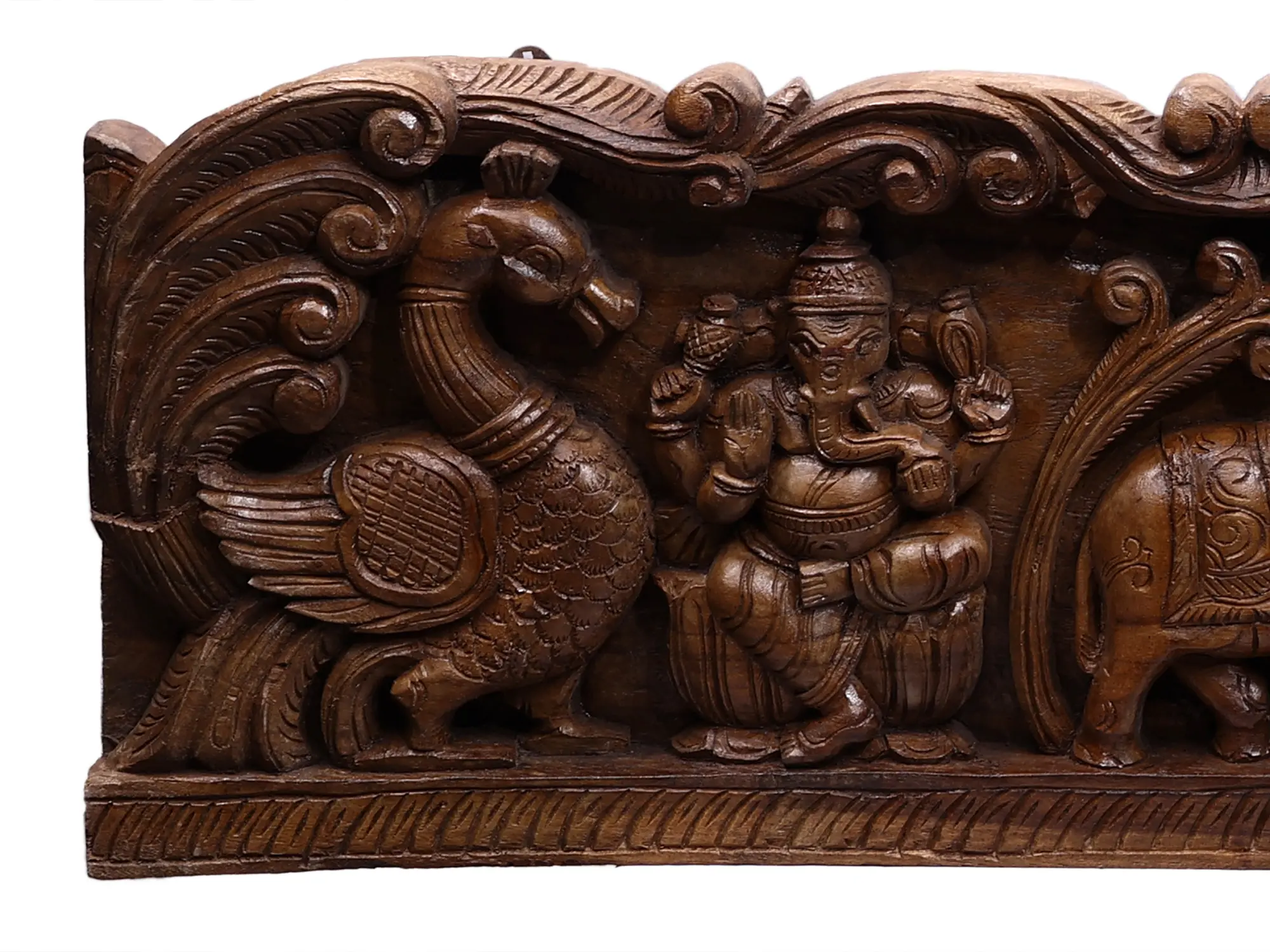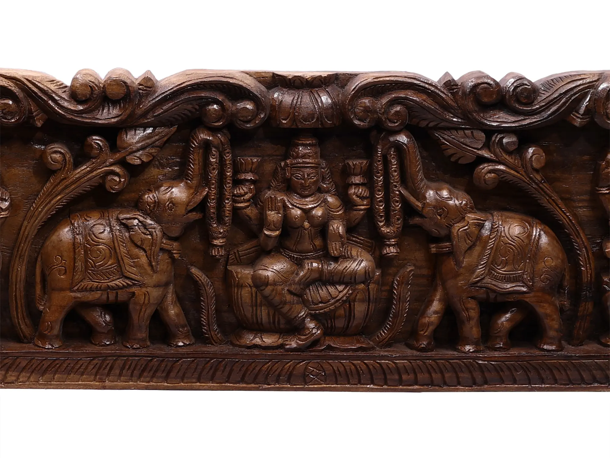 Blessings from above, Gaja Lakshmi, the goddess of riches, stands with lucky elephants. The destroyer of barriers, Lord Ganesha, sits majestically, providing protection and direction. The Goddess of Knowledge, Saraswati, represents the quest for knowledge and creativity and exudes tranquility and enlightenment. This work of sacred wood art invites prosperity, achievement, and spiritual development in any area it is placed in. It serves as a constant reminder of the blessings and auspiciousness that enliven every part of life with its exquisite carvings and heavenly presence.