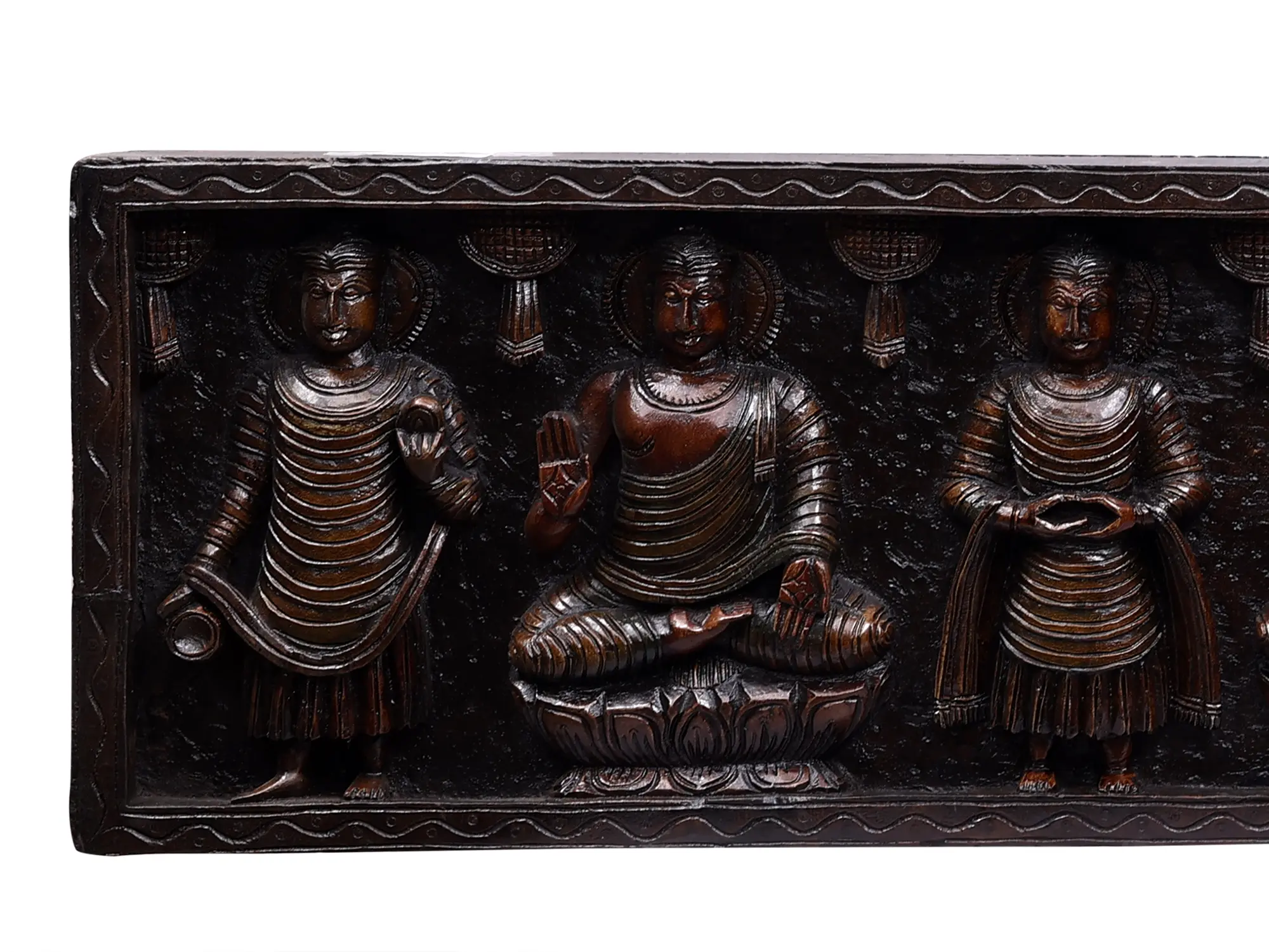 Infuse your living space with an aura of profound peace and spiritual contemplation with this magnificent wooden wall panel, intricately carved with multiple depictions of Gautama Buddha. This substantial piece, measuring an impressive 48 inches in length, serves as a powerful focal point, drawing the eye and inviting a sense of calm reflection. Each of the seven Buddha figures is rendered with exquisite detail, showcasing different postures that represent various aspects of his teachings and spiritual journey.