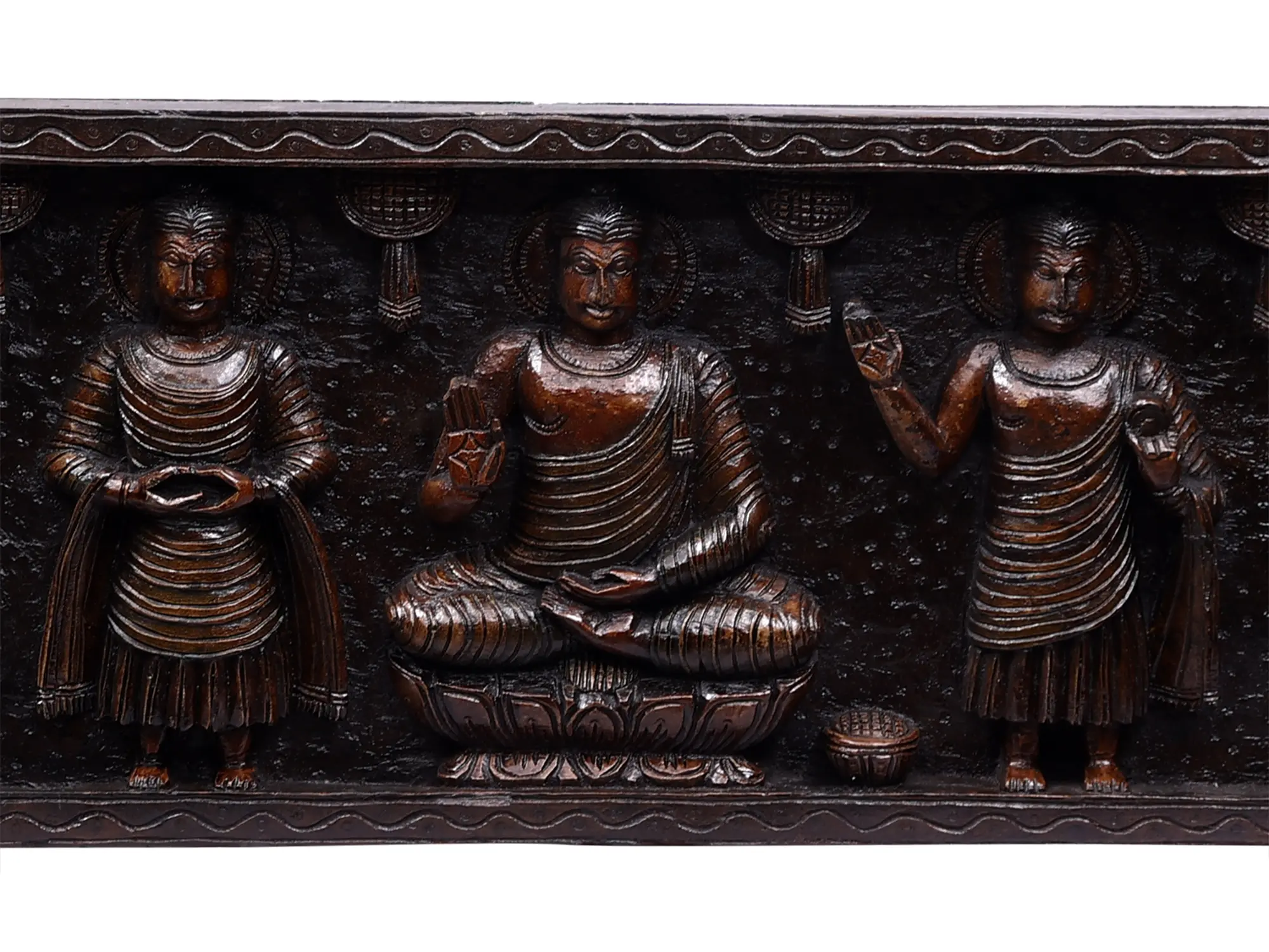 Crafted from a single piece of wood, this wall panel is a testament to the enduring artistry of traditional carving. The rich, deep tones of the wood evoke a sense of age and timelessness, reminiscent of ancient temples and sacred spaces. Each figure is meticulously sculpted, from the serene expressions on their faces to the graceful folds of their robes. The subtle variations in texture and depth achieved by the artisan imbue the panel with a lifelike quality, inviting viewers to connect with the spiritual essence of each depiction. The surrounding decorative elements, subtly integrated into the overall design, further enhance the panel's aesthetic appeal and spiritual resonance. This piece is not merely a decorative item; it is a piece of history, a conduit of spiritual wisdom, and a testament to the power of devotion expressed through art.