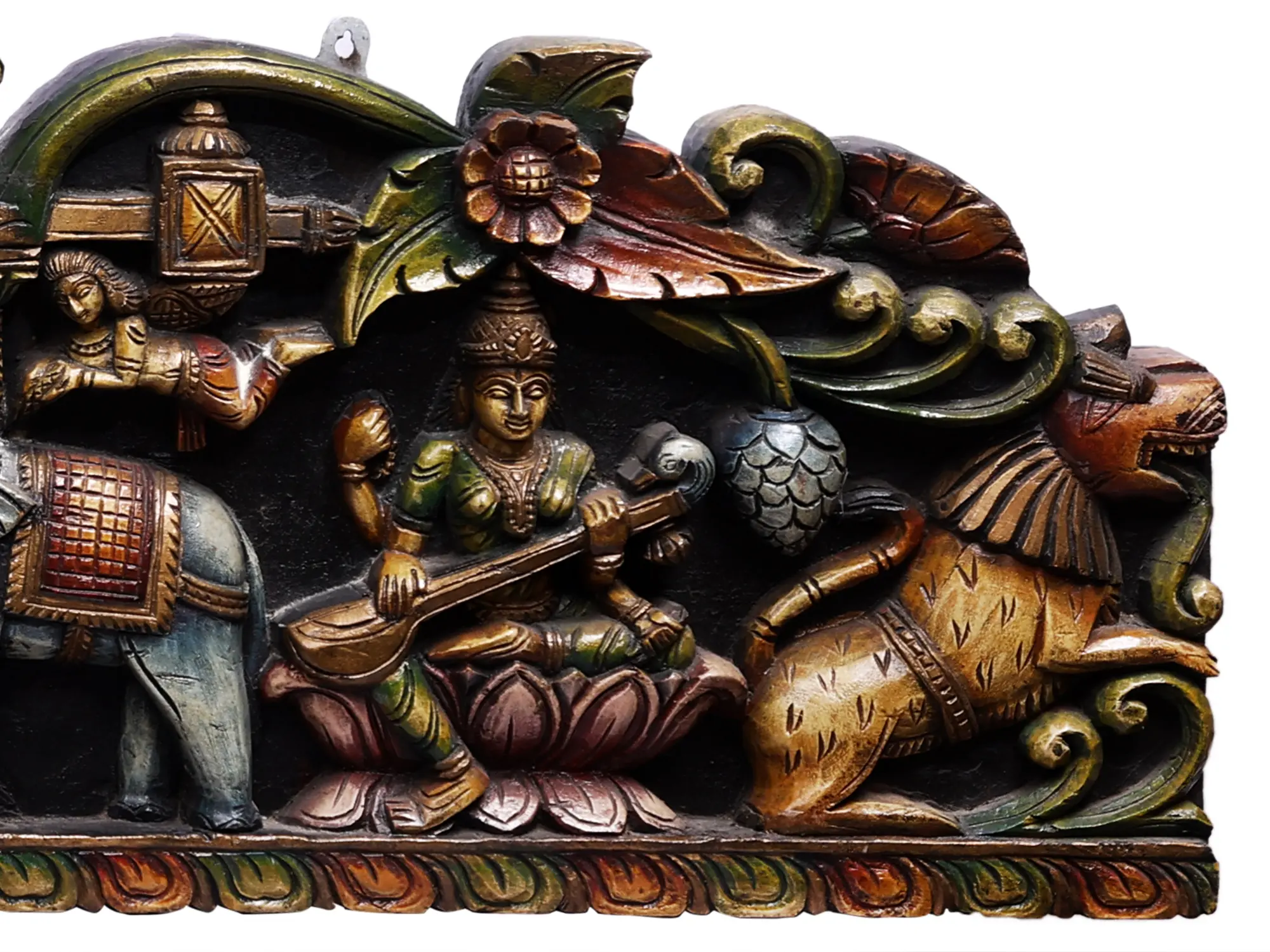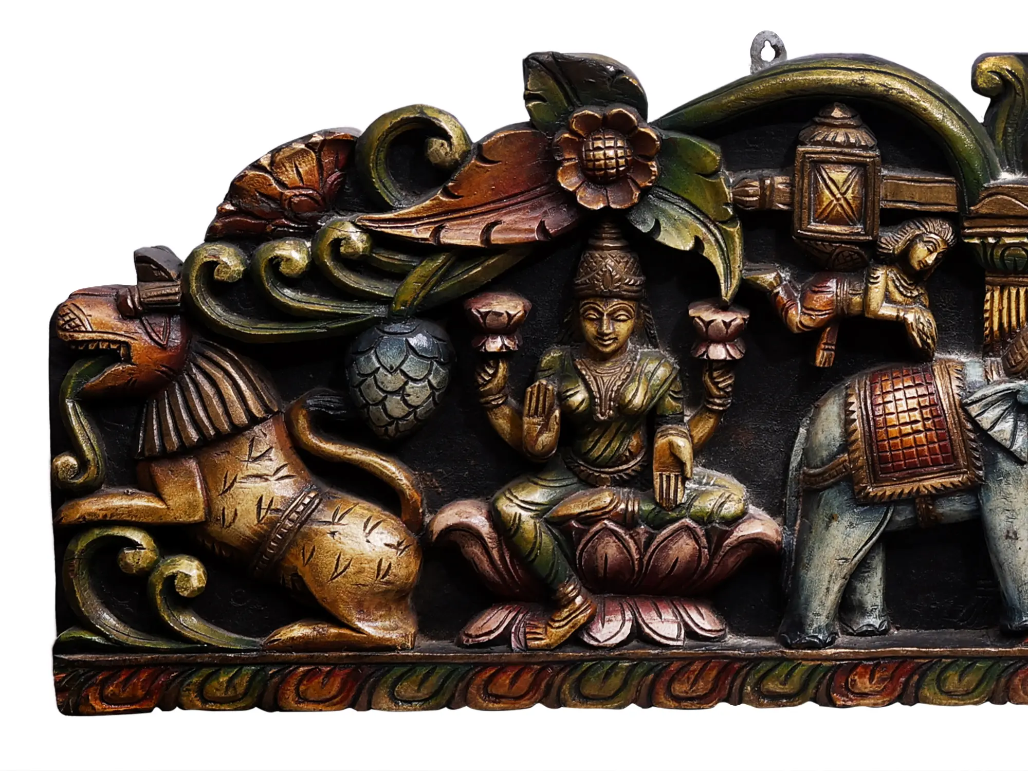 This magnificent wooden wall panel is a masterful depiction of the Hindu pantheon, bringing together three of the most revered deities in a harmonious and spiritually resonant composition. Carved with exquisite detail, the panel stands as a testament to traditional artistry and deep-seated cultural beliefs. At its heart sits Gaja Ganesha, the elephant-headed god, the remover of obstacles and the patron of wisdom and new ventures. His presence signifies the clearing of paths, ensuring smooth beginnings and successful endeavors, echoing the ancient mantra "Om Shri Ganeshaya Namah" that invokes his blessings. Flanking Ganesha are the divine goddesses, Lakshmi and Saraswati, representing the twin pillars of fortune and knowledge that enrich human life. To one side, Goddess Lakshmi, the embodiment of wealth, prosperity, and auspiciousness, is seated, often depicted with lotus flowers and coins, symbolizing abundance and purity. Her presence promises material well-being and good fortune, aligning with the concept of "Shri," a term that encompasses beauty, grace, and prosperity. On the other side, Goddess Saraswati, the divine patroness of music, arts, wisdom, and learning, is shown, her Veena in hand, ready to bestow her blessings of creativity and intellectual prowess. She is the fountainhead of all knowledge, inspiring artists, musicians, and scholars alike. The panel is further enriched by symbolic representations that enhance its spiritual significance. Majestic elephants, often associated with royalty, strength, and wisdom in Indian culture, stand regally on either side of Ganesha, offering their support and grandeur. Lions, symbols of power and courage, guard the outer edges, adding a layer of protective symbolism. Delicate floral motifs and ornate architectural elements frame the divine figures, creating a sense of sacred enclosure and aesthetic beauty. The intricate carvings and the subtle, rich hues with which this panel is finished evoke a sense of ancient grandeur and spiritual serenity, making it a truly captivating piece. ––––––––––––––––––––
