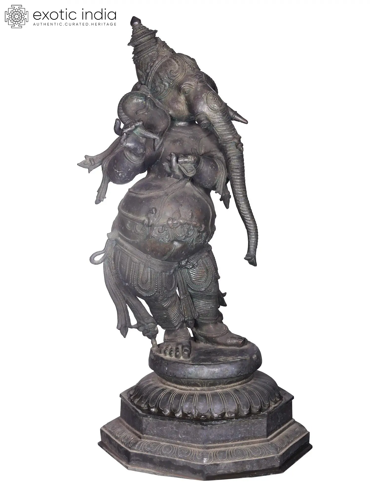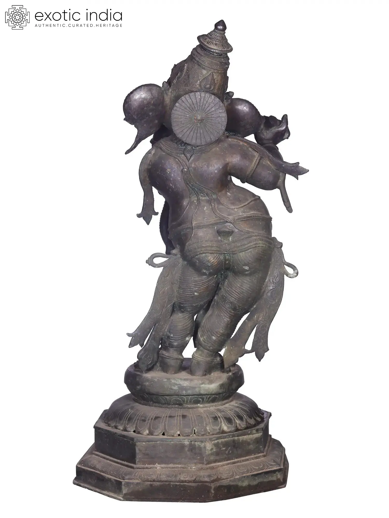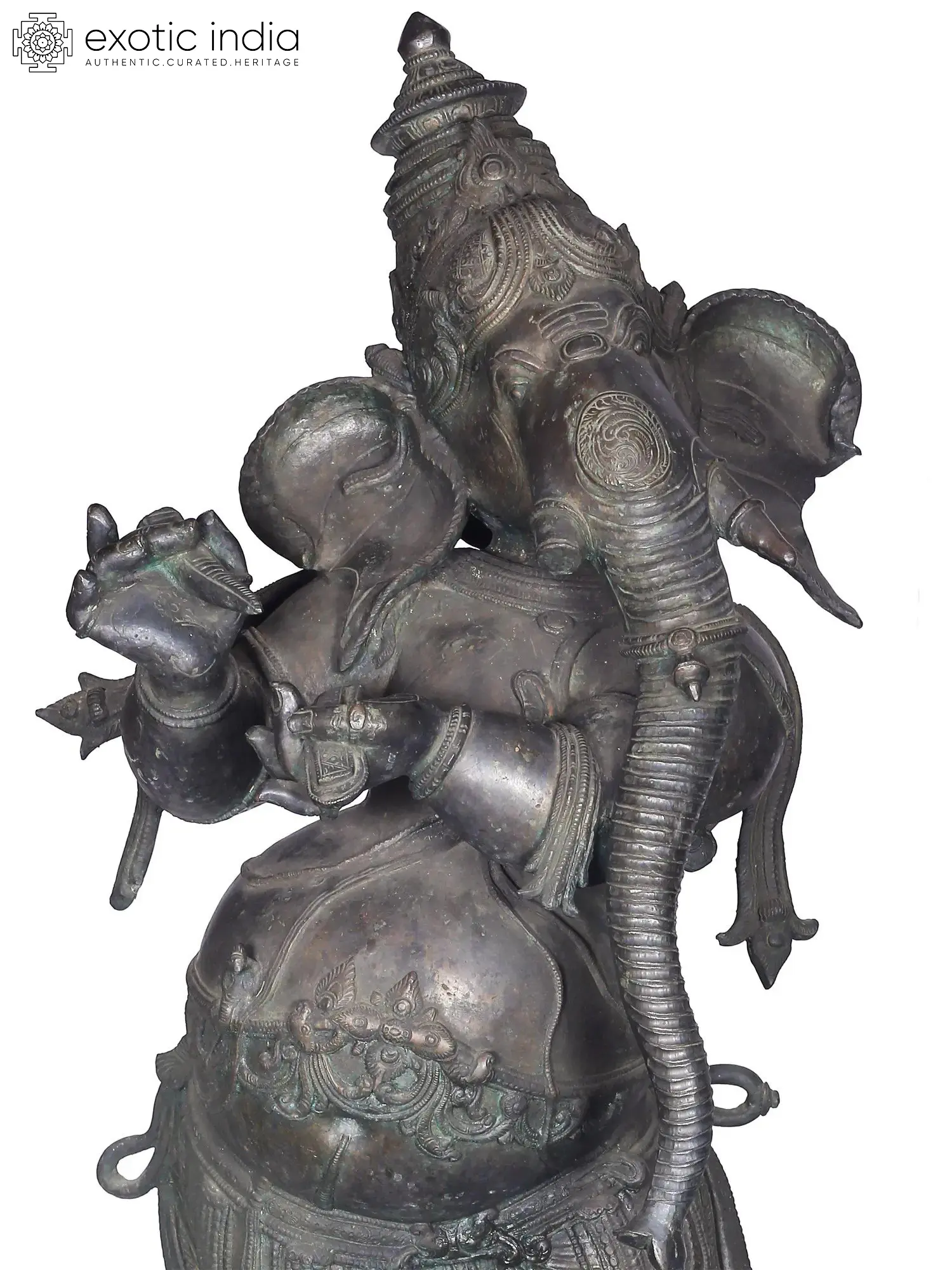 Standing on quadri-layered pedestal, this idol of Lord Ganesha invokes a quest for wisdom, in an amusing posture, almost similar to Tribhangi - ‘Ekdanta’ holds a manuscript in his one hand, and pens the holy Aksharas on it with his broken tusk. His Tripunda, finger positionalities, Janeu, jewelry and the cloth design appears clean and impressive, complimenting the Panchaloha bronze. His trunk is hung down straight, symbolizing the complete realization of the Sushumna Nadi. The basis to this unique idol can be found in one of the tales; where Ved Vyasa - the composer of Mahabharata selects Lord Ganesha to write it down owing to his gifted intelligence.
