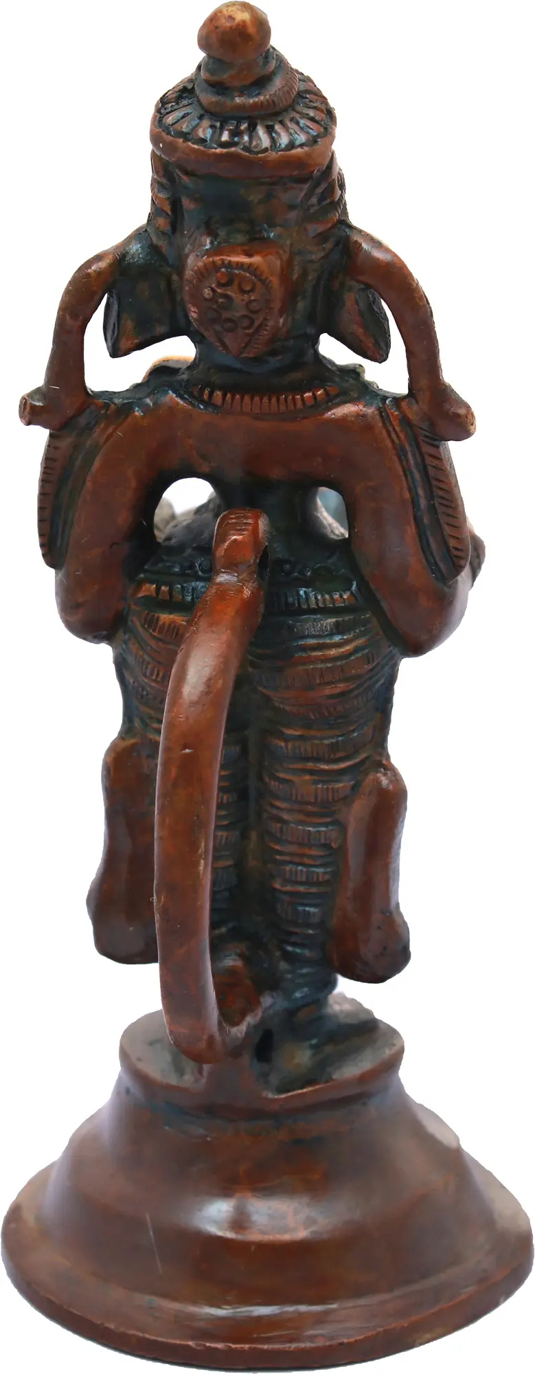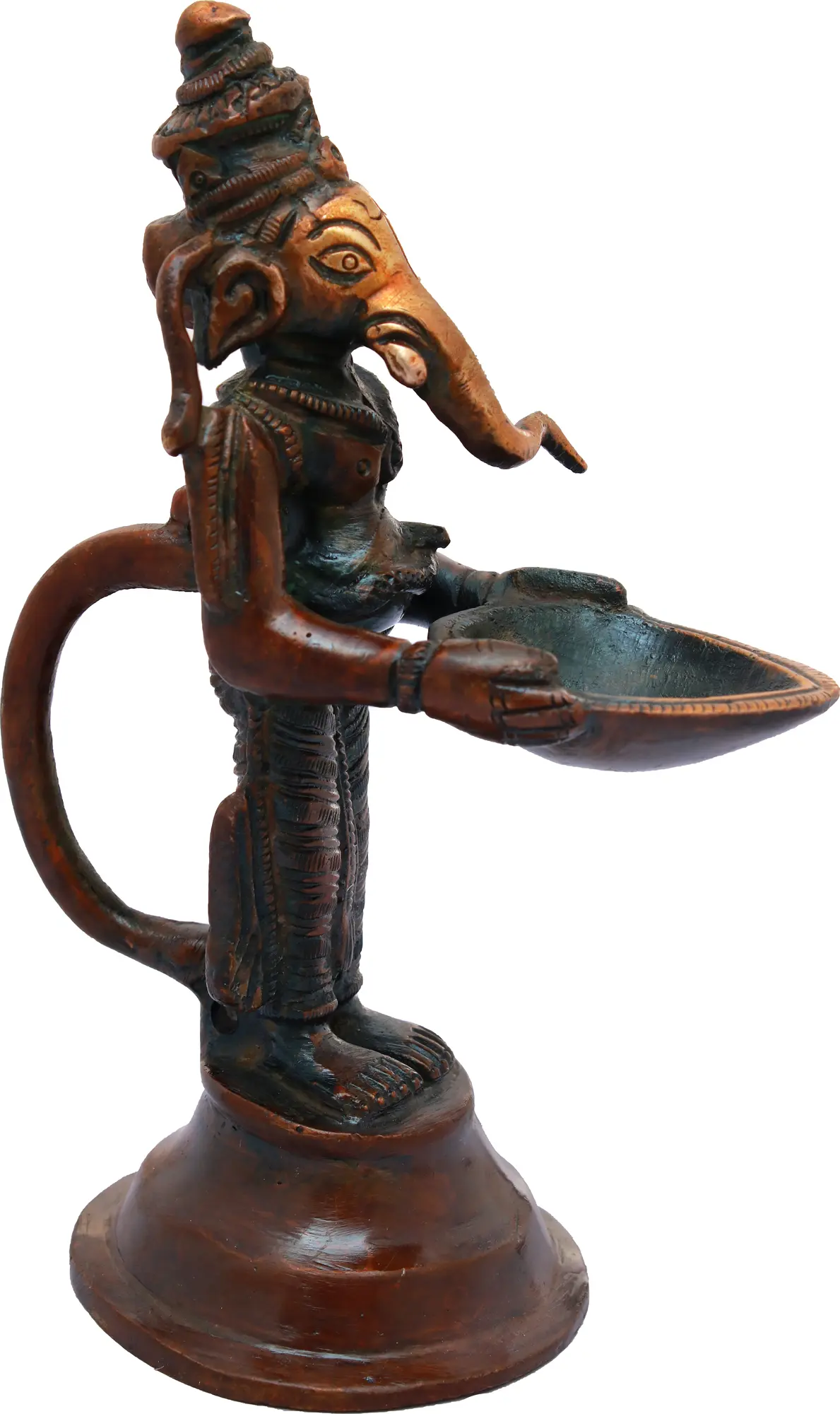 This auspicious brass lamp is blessed with the image of Lord Ganesha. He is standing, holding one lamp in his hand as if blessing the devotees with knowledge and wisdom. The structure of the lamp is roughly inspired by the Deepalakshmi. There is a handle attached to the main figure to allow the devotee to have a comfortable grip for aarti.