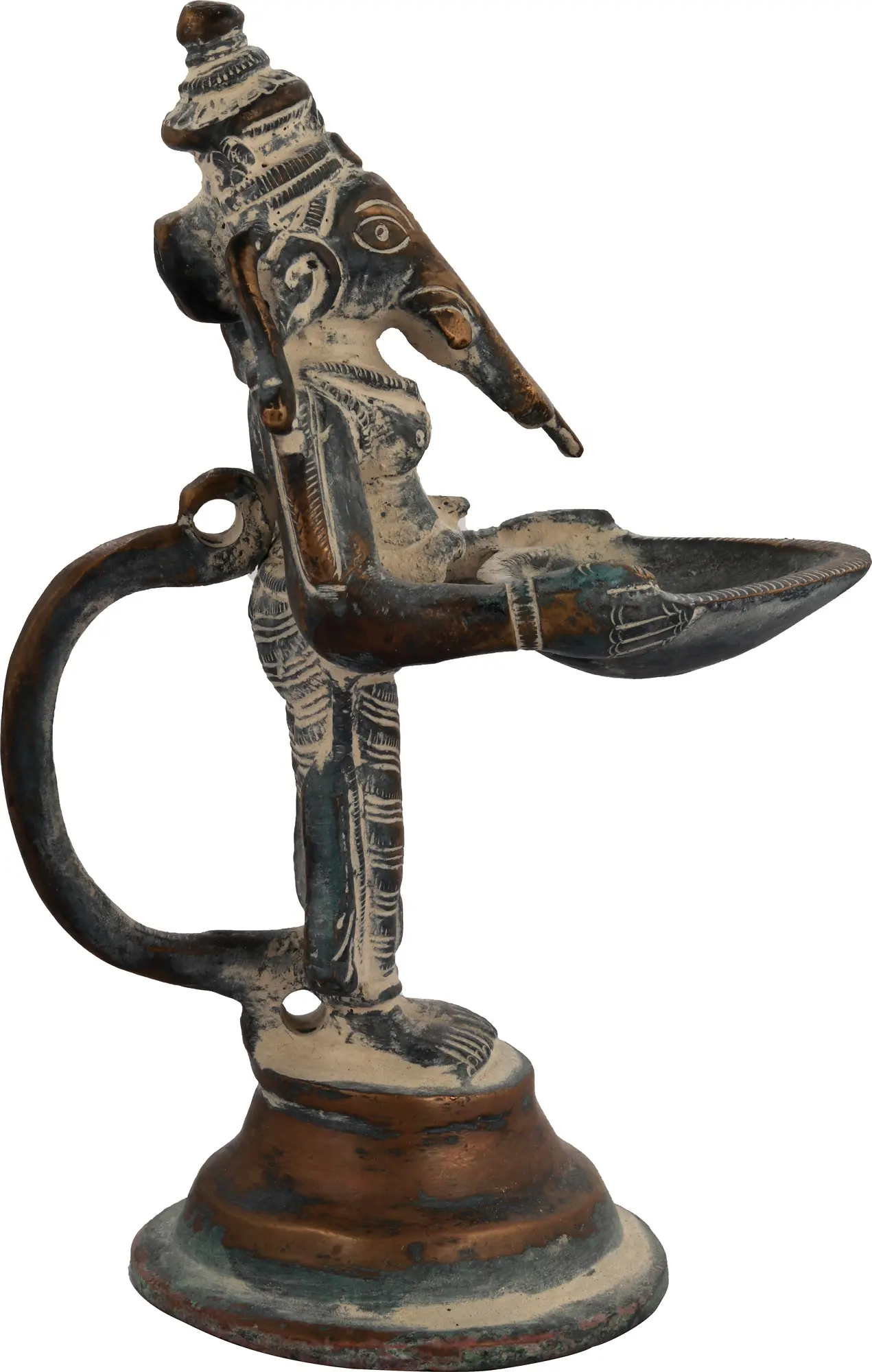 This auspicious brass lamp is blessed with the image of Lord Ganesha. He is standing, holding one lamp in his hand as if blessing the devotees with knowledge and wisdom. The structure of the lamp is roughly inspired by the Deepalakshmi. There is a handle attached to the main figure to allow the devotee to have a comfortable grip for aarti.