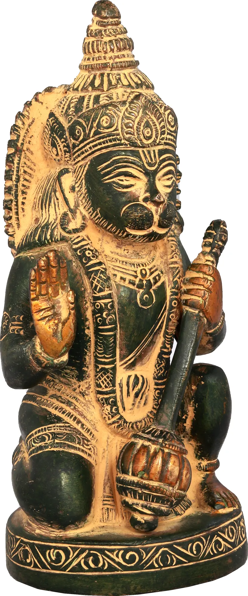 This Lord Hanuman statue, handcrafted with passion, is a beautiful representation of power and devotion. This masterpiece, handcrafted in India, depicts the courageous Hanuman in great detail, highlighting his steadfast commitment and indomitable spirit. The brass sculpture reflects the essence of the epic Ramayana, radiating heroism and divinity. This artwork pays attention to traditional artistry while embracing the eternal story of Hanuman's heroism, with every curve and shape carefully created. The brown and green patina on the statue gives it a dramatic look. The Siras chakra behind Lord Hanuman's head symbolizes the divine aura that the deity exudes. This sculpture transcends artistry as a symbol of triumph over hardship, as a reminder of heroic values and the strength of faith.