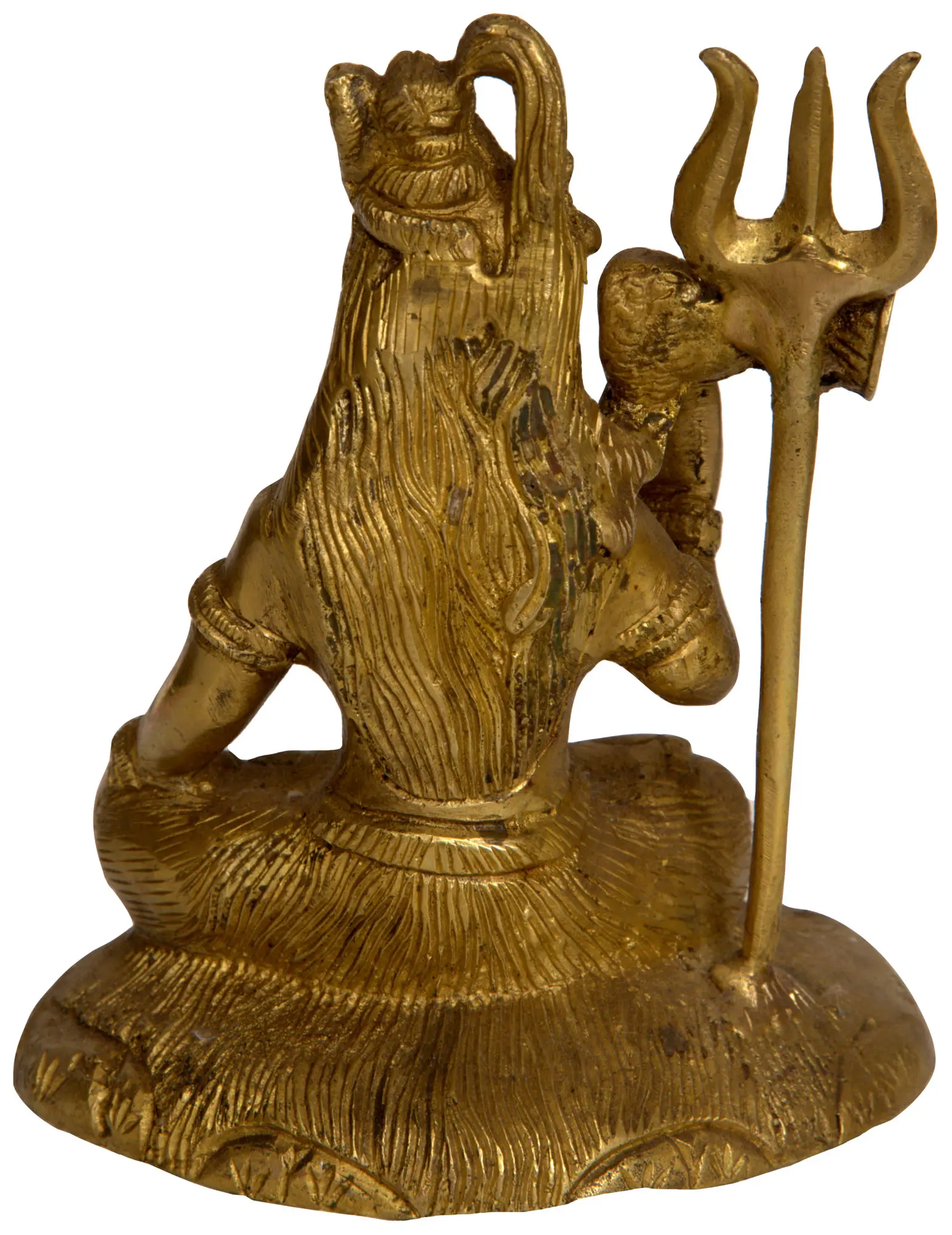 Bhagawan Shiva, “the Eternal Yogi”, “the Auspicious One”, exudes an aura of transcendence as he sits upon a tiger skin in the enchanting “Padmasana posture”. Serenely adorned with the serpent Vasuki coiled around his neck, his attire of sacred Rudraksha beads symbolises his austere simplicity. From the tangled locks of his hair, the Holy River Ganga cascades in a mesmerising dance, a testament to his divine grace. The crescent moon graces his brow, a symbol of timeless cycles. His right hand, raised in “Abhaya Mudra”, offers solace and protection, while a trident (Trishul), entwined with a mystical “Damaru”, represents the balance of creation, preservation, and destruction. This celestial artwork, crafted in brass, signifies Shiva’s omnipotence and the harmony of cosmic forces.