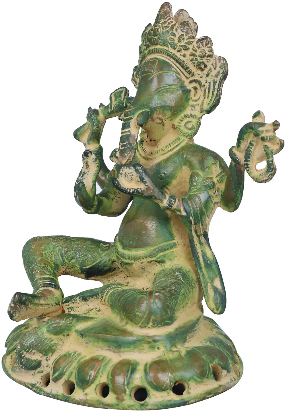 Chaturbhuja Lord Ganesha embodies wisdom, success, and auspicious beginnings. Seated on the lotus, Ganesha invites devotees to seek solace and guidance, reminding them of his benevolence and ability to guide them through life’s journey with grace and positivity. Ganesha holds a noose to guide devotees, a goad to remove obstacles or a sweet Modak for rewards. His lower right hand is raised in a gesture of blessing, signifying his role as the bestower of boons. As the Remover of Obstacles and a patron of Art and Knowledge, Ganesha is venerated before any undertaking. With precise craftsmanship, this brass creation captures the essence of spiritual evolution amidst life’s challenges.