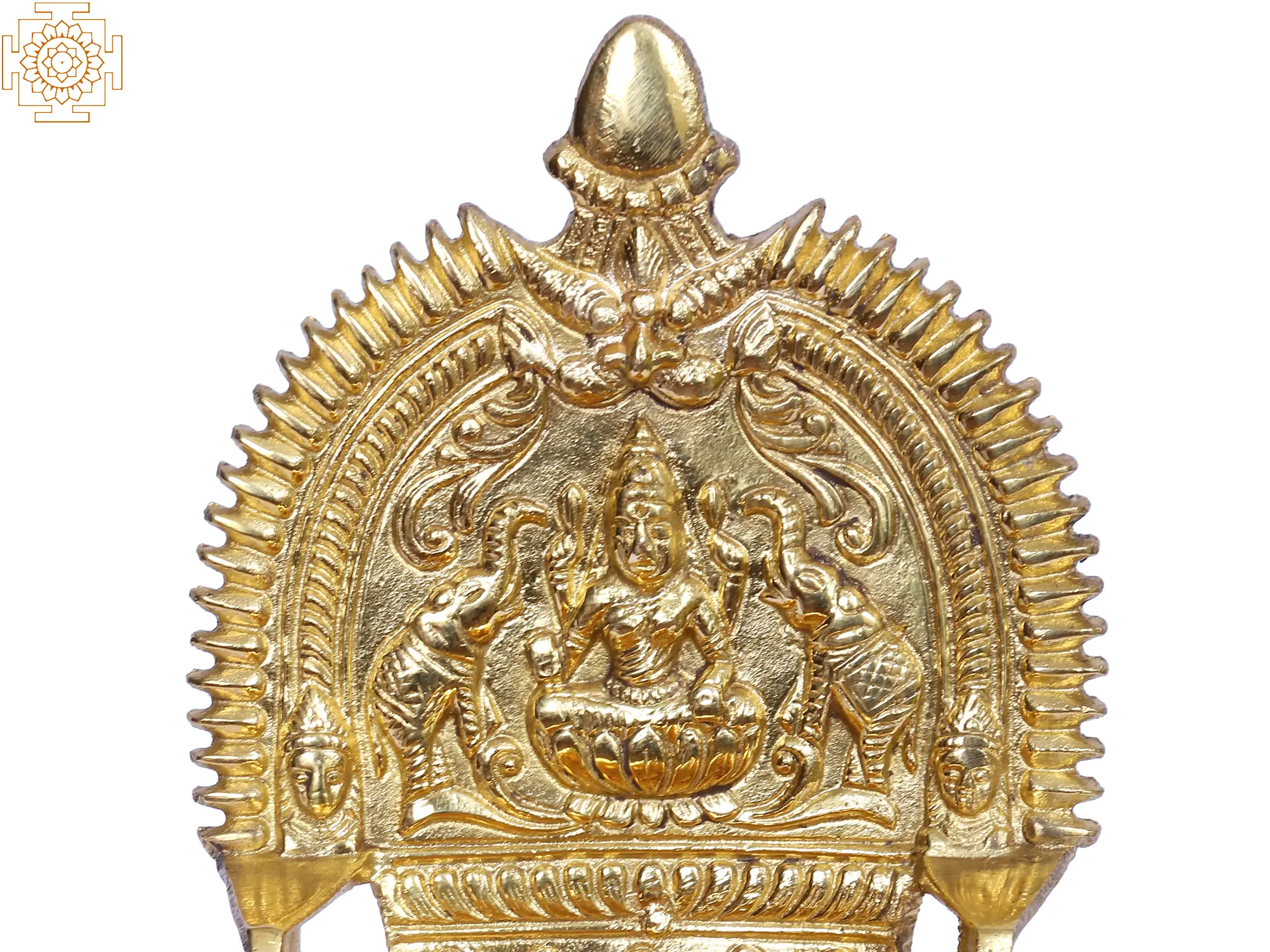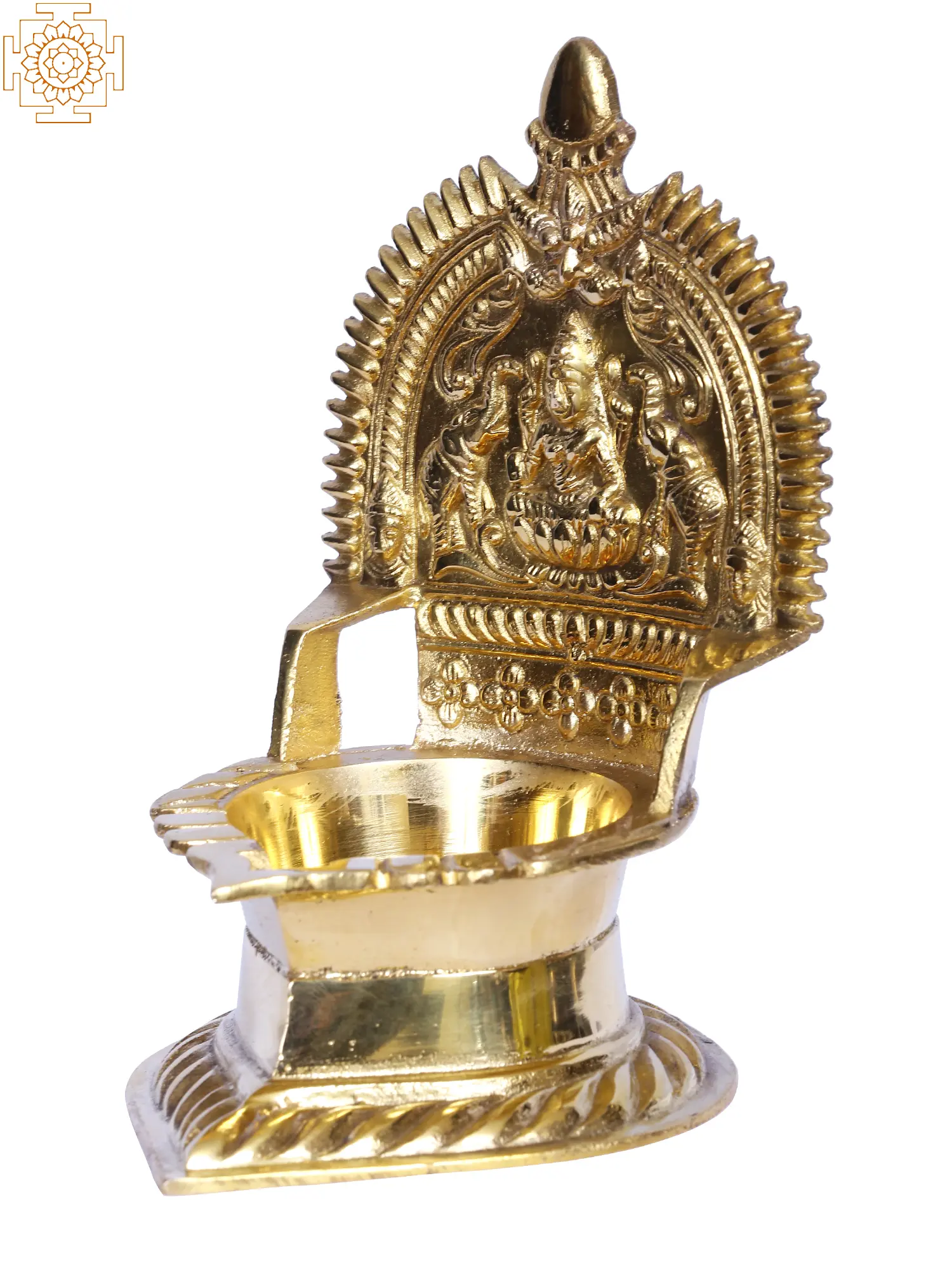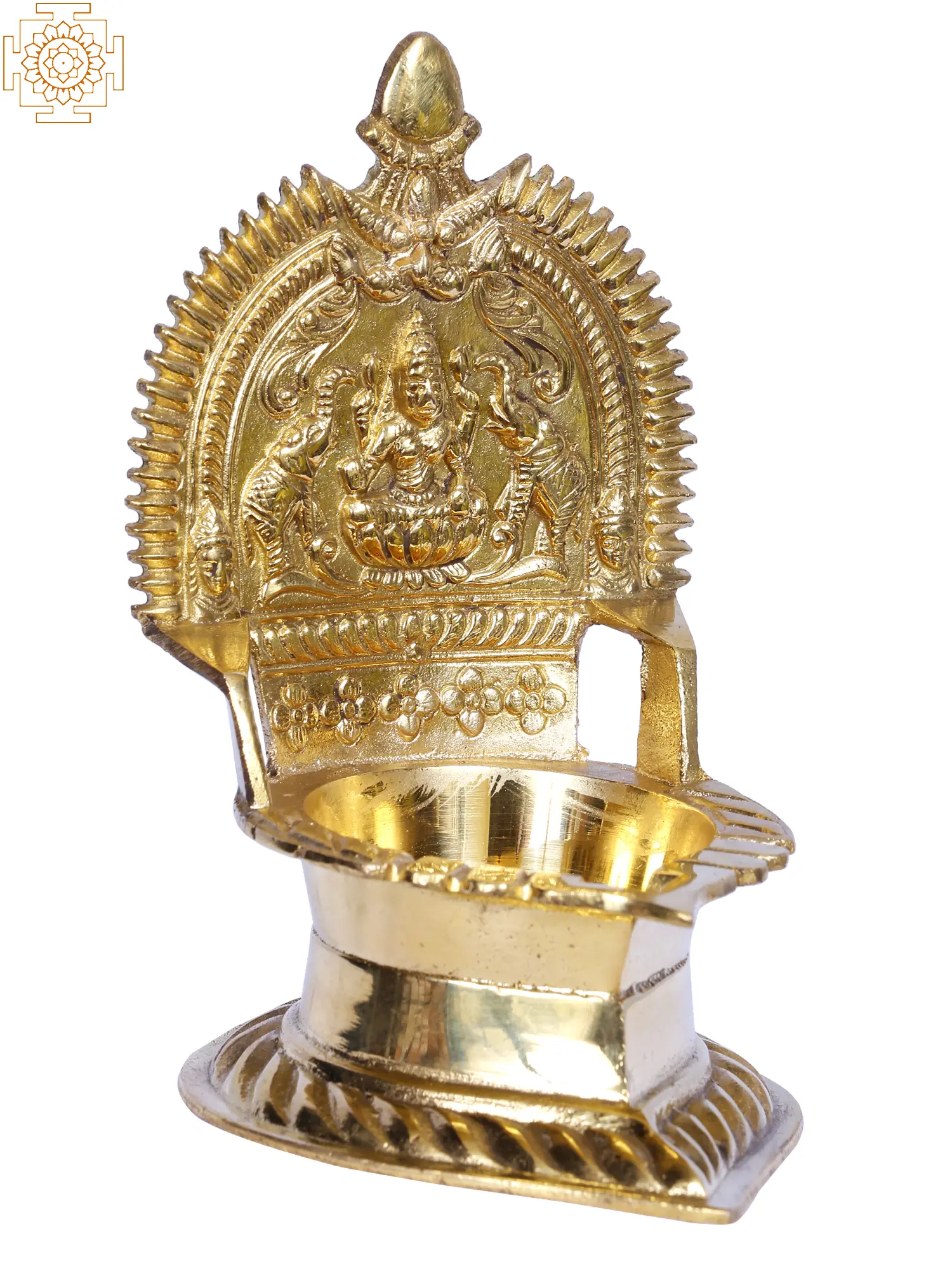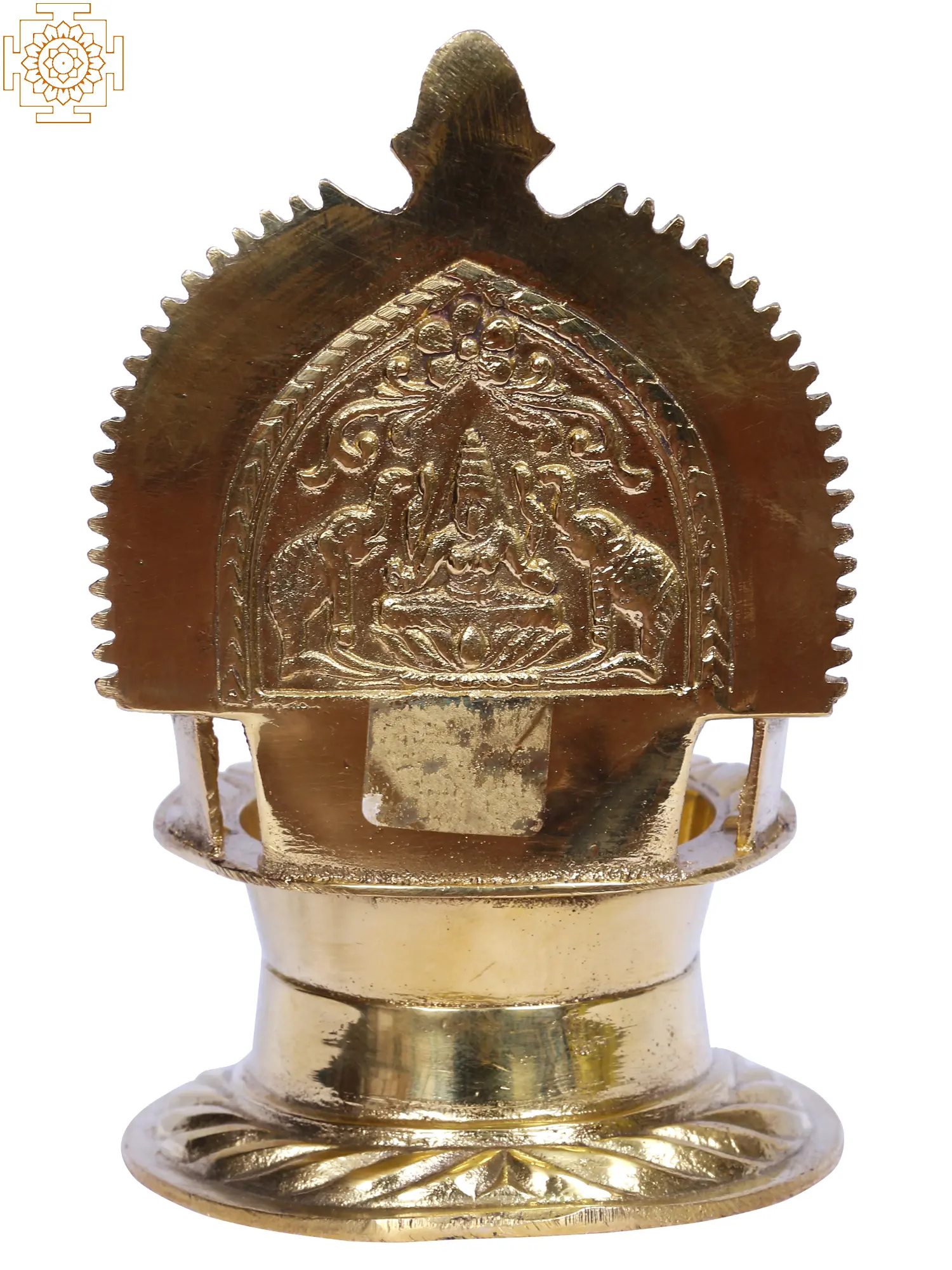 Goddess Gajalakshmi, the goddess revered by many, is the deity of health, wealth, and royalty. She was highly regarded by ancient poets such as Kalidasa. Because of her regal rank, she can be found in a variety of ceremonial artifacts. This Gajalakshmi Deepam is crafted of brass and has a gold tinge. The metal provides it with a long-lasting life. The backdrop of the lamp is an intricate portrayal of the goddess Gajalakshmi seated beneath a Prabhavali of Kirtimukha and flower buds staring outwards. The oil basin of the lamp is deep enough to contain oil that will allow the wick to burn for the whole night. The lamp's stand is strong, with beautiful carvings of leaves, a common theme in Indian art. The lamp also features a Gajalakshmi pattern on the rear to ensure the deity's blessings. It is stated that lighting this lamp twice a day brings wealth and good fortune into the home.