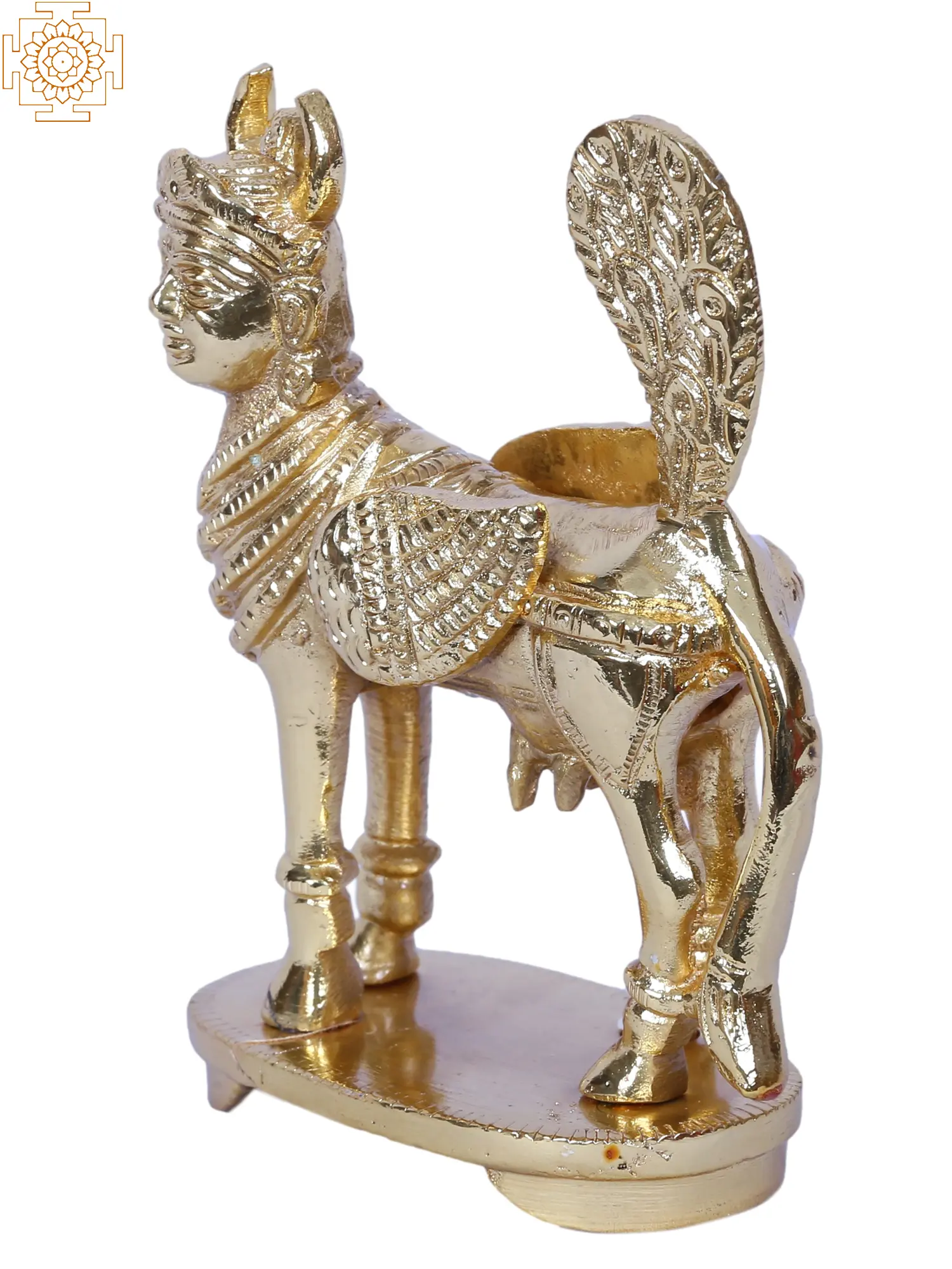 Kamadhenu- the wish-fulfilling cow who emerged from the Samudra-manana or churning of the ocean, in Hindu tradition symbolizes a supremely auspicious being, whose presence in a home can dispel all Vastu doshas and become a source of fortune and abundance. In this brass statue, the bovine divinity stands on an ovular platform, in a zoo-anthropomorphic form (half human, half animal). Her form has been beautifully delineated and layered with gold, giving the composition a heavenly aura.