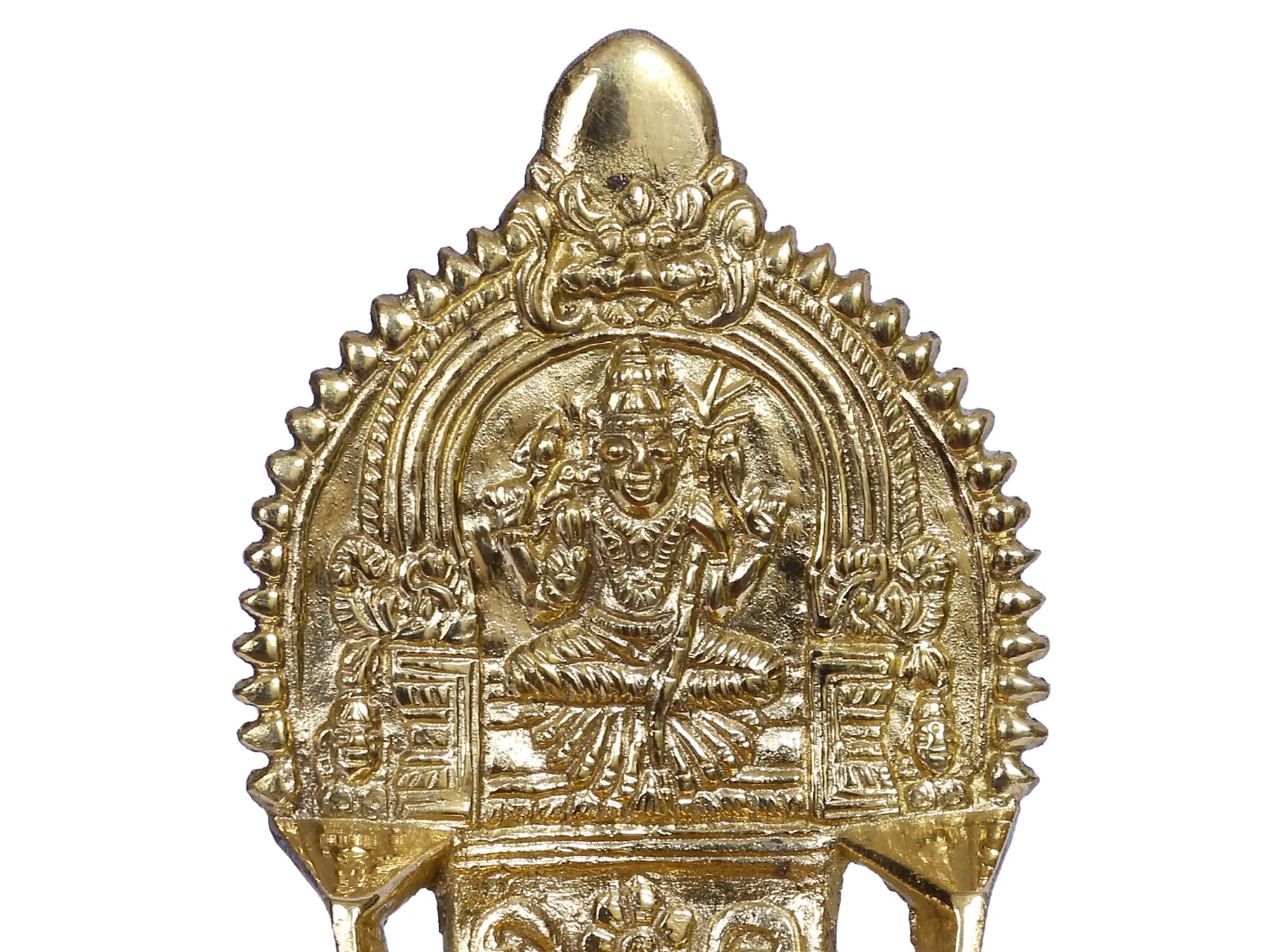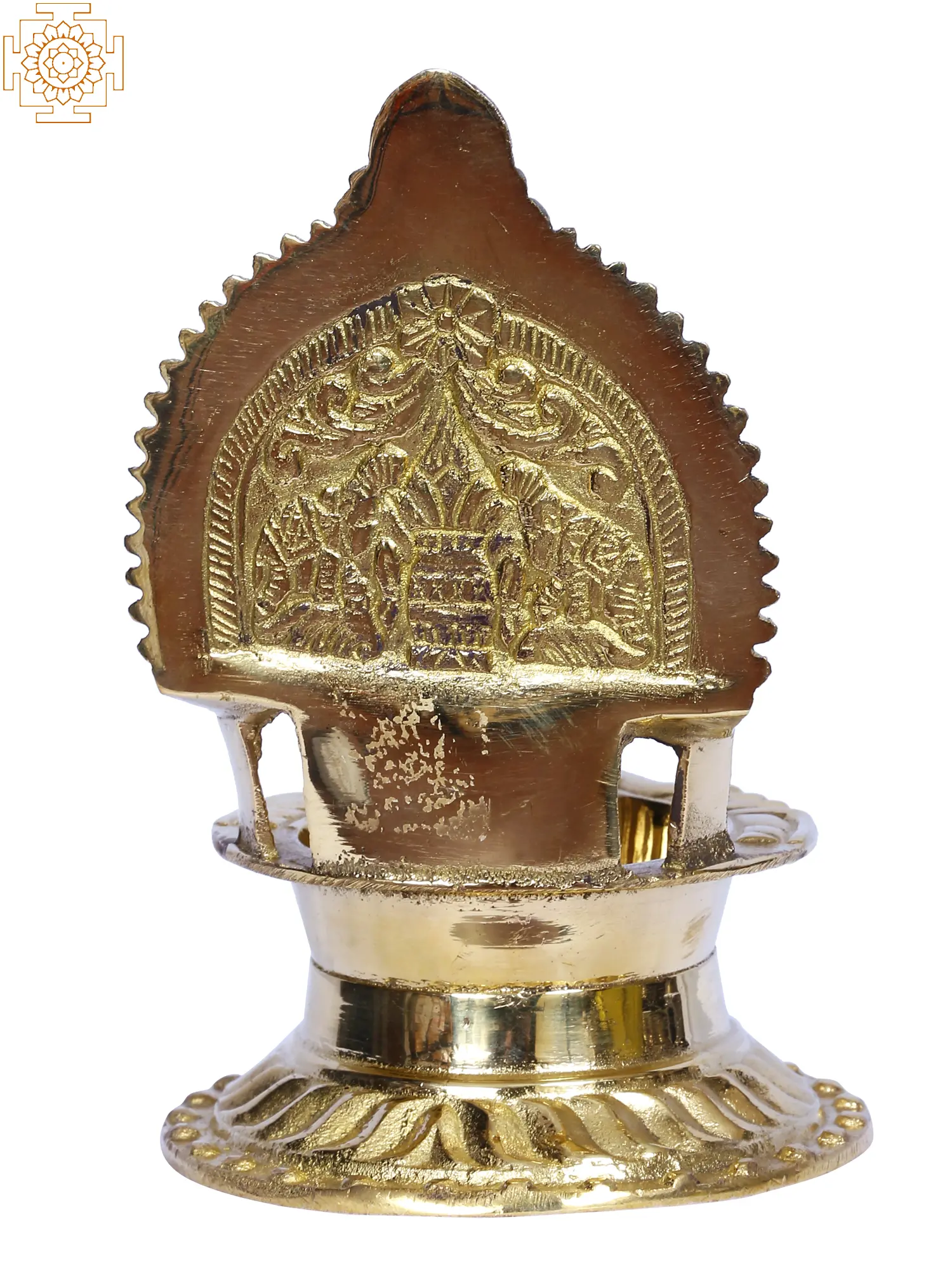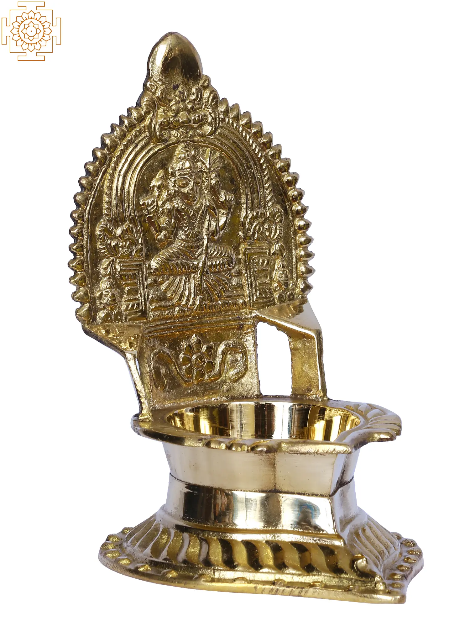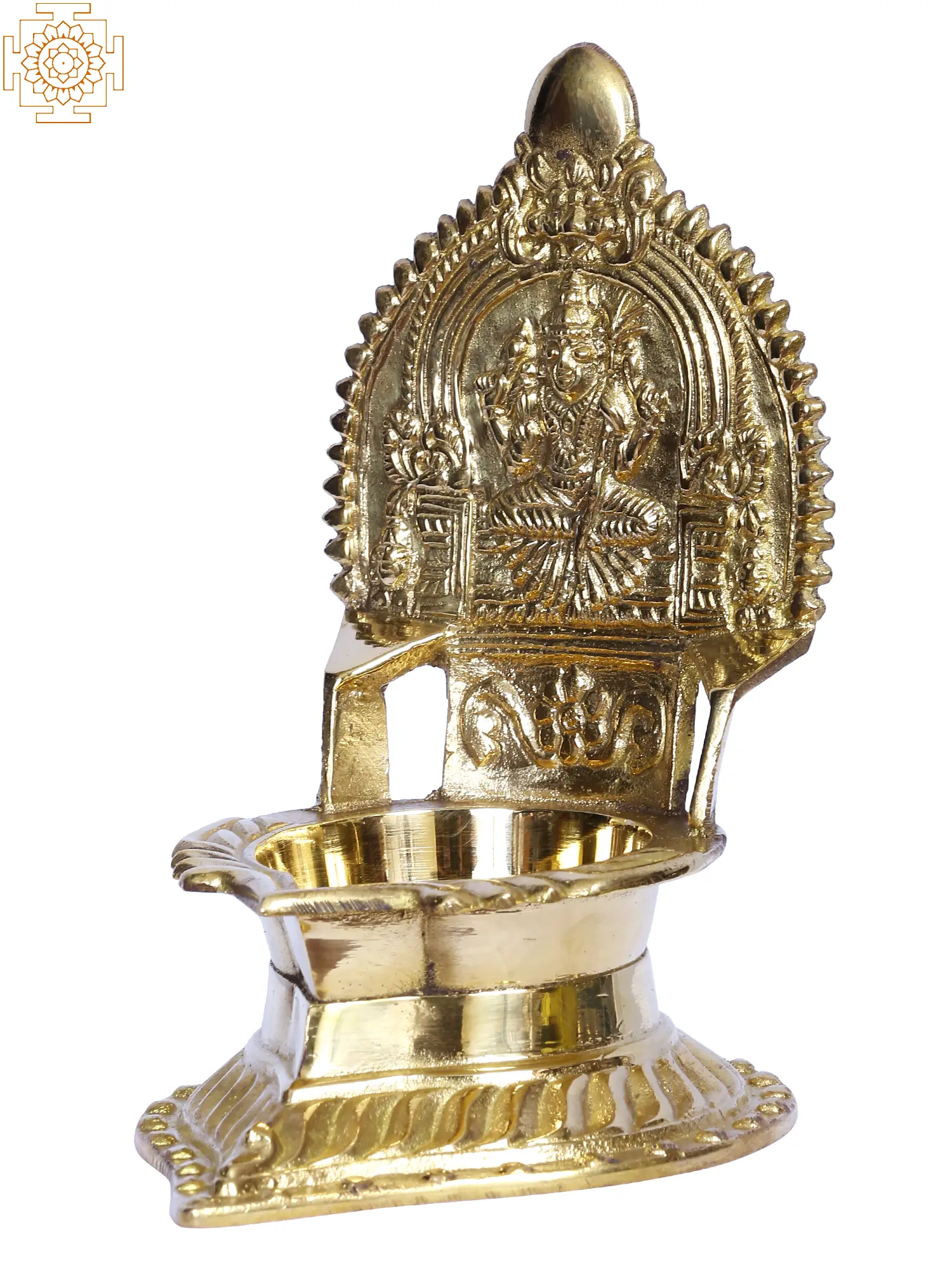 This brass lamp with the sacred figure of goddess Kamakshi on the crown, held together by a Kirtuimukha Prabhavali, is a great gift for loved ones, bringing riches and knowledge into their homes. The lamp is created in a traditional manner by trained craftsmen and carries the legacy of India's lamp manufacturing. This Kamakshi Diya may be lighted every day and should be facing southeast to get the full advantages of worshipping or praying.