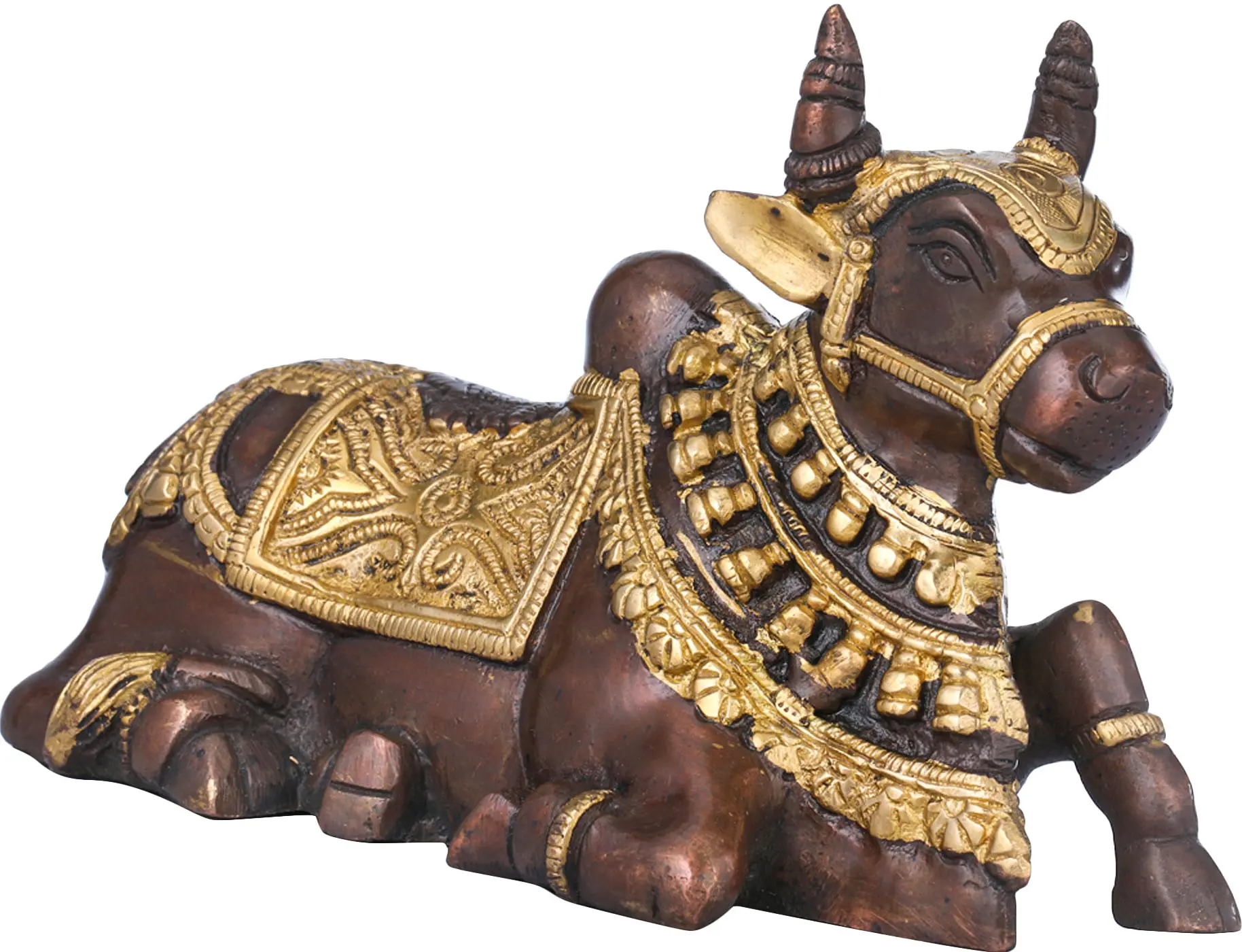 This holy brass statue of Lord Nandi, Lord Shiva's celestial mount, is meant to symbolize devotion and a link to the spiritual world. This statue of Nandikeshwara, who is fully reclined and eagerly awaiting his Lord Shiva, is a perfect illustration of the revered bond between a student and a teacher. The contrast coloring of brown and gold has been used to give the statue a majestic appearance. With its gold-painted ornamentation on Lord Nandis's torso, this statue exudes regal beauty. This monument is an homage to Lord Nandi's sacrifice and devotion, and it is ideal for placement in a temple.