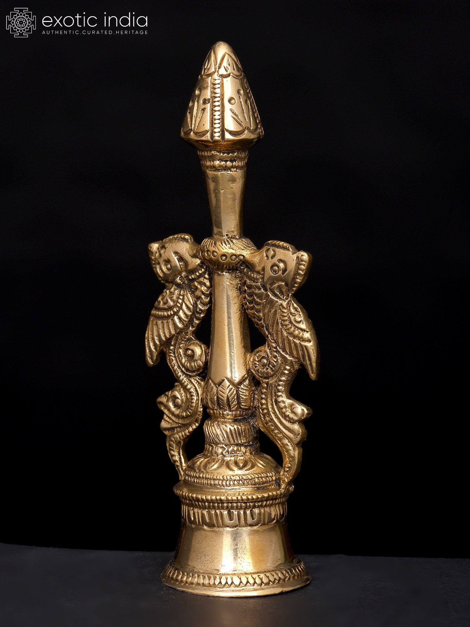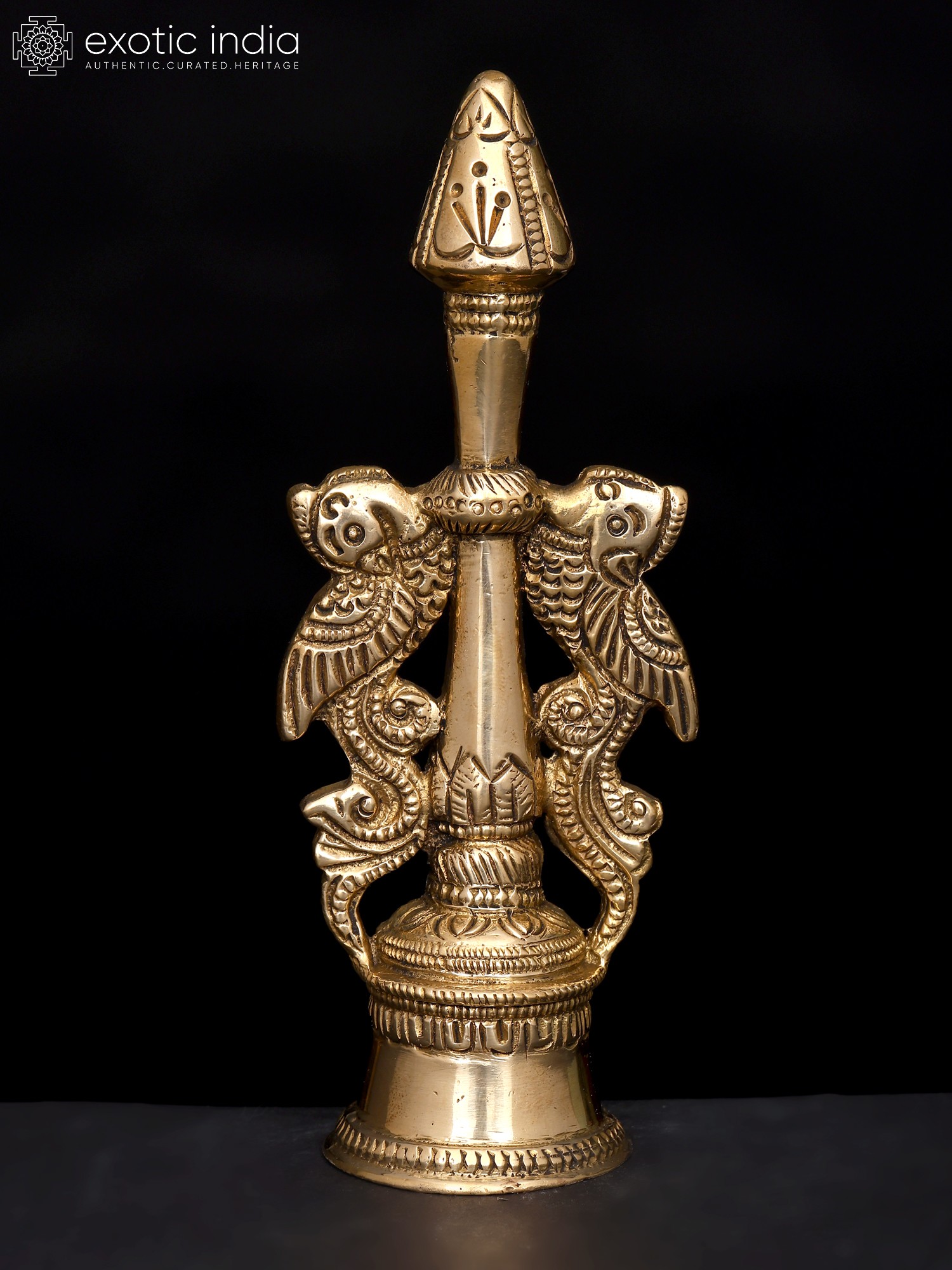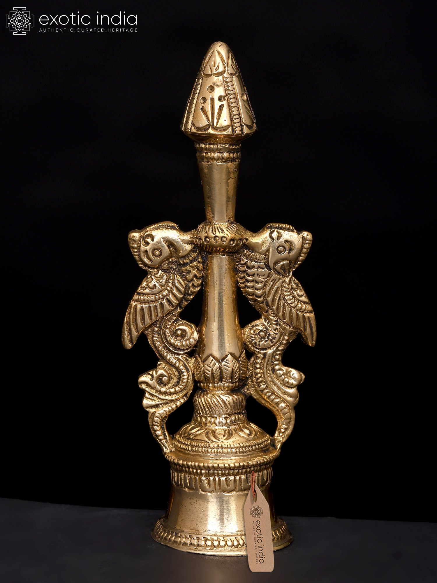 This Brass Hindu Ritual Bell with two magnificent peacock patterns on both sides mixes holy music with the auspiciousness of Lord Murugan's heavenly steed. This bell provides another depth of spirituality to a community where ringing bells is considered auspicious. When the bell, which represents spiritual vibrations, is combined with the peacock, which represents expansion and grandeur, the result is a piece that emanates good energy and acts as a vehicle for success. This incredible work of art seamlessly combines the heavenly presence of pleasant energies with the protective emblem.