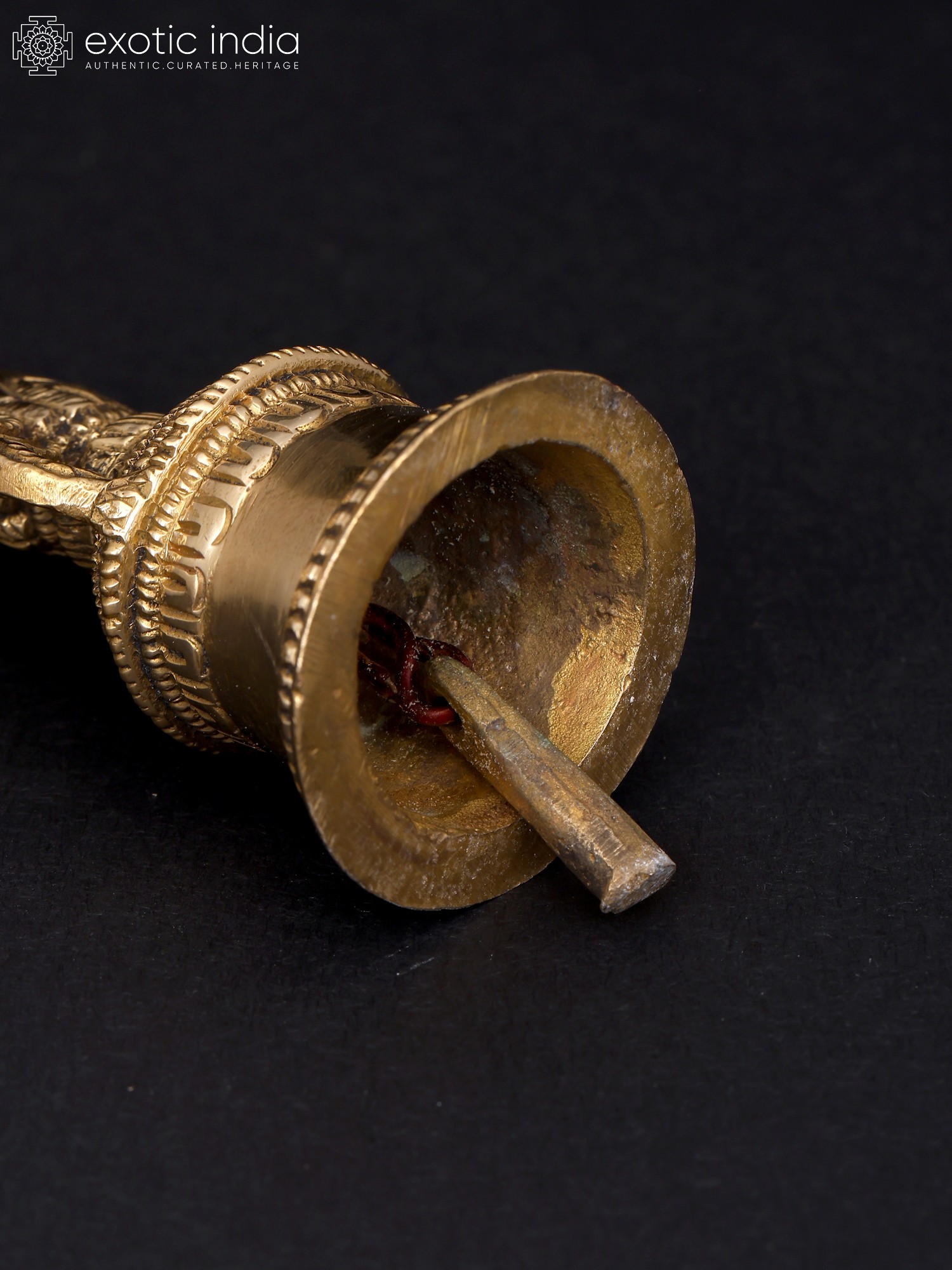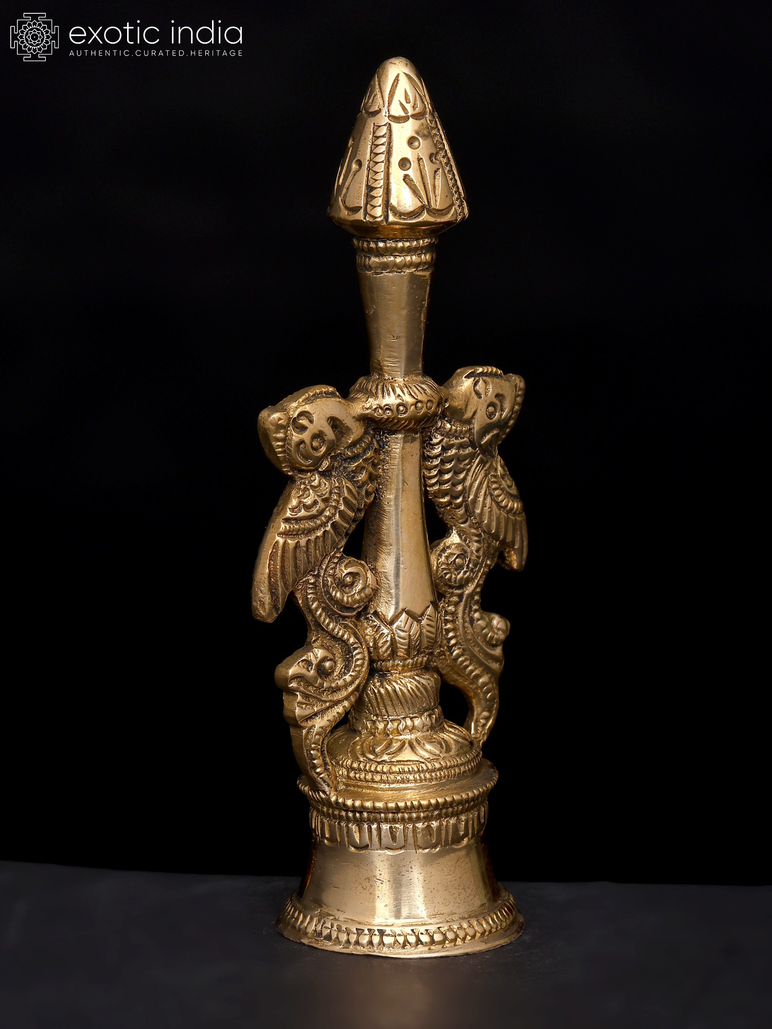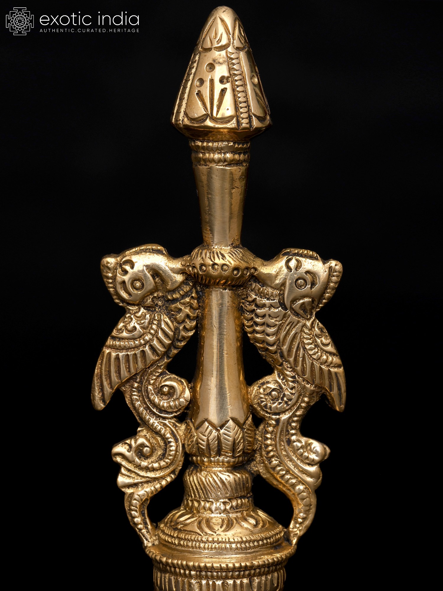 This Brass Hindu Ritual Bell with two magnificent peacock patterns on both sides mixes holy music with the auspiciousness of Lord Murugan's heavenly steed. This bell provides another depth of spirituality to a community where ringing bells is considered auspicious. When the bell, which represents spiritual vibrations, is combined with the peacock, which represents expansion and grandeur, the result is a piece that emanates good energy and acts as a vehicle for success. This incredible work of art seamlessly combines the heavenly presence of pleasant energies with the protective emblem.
