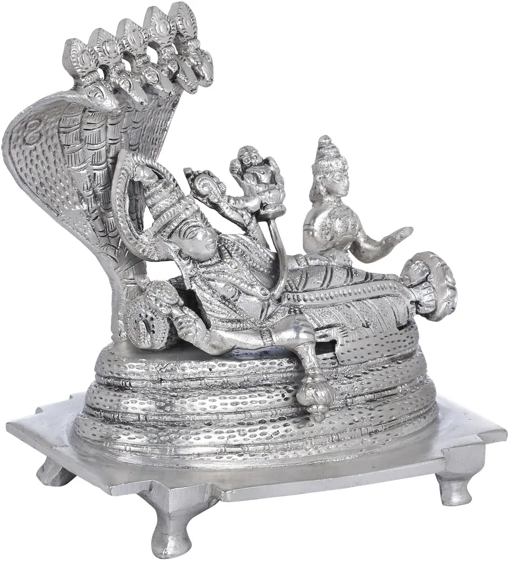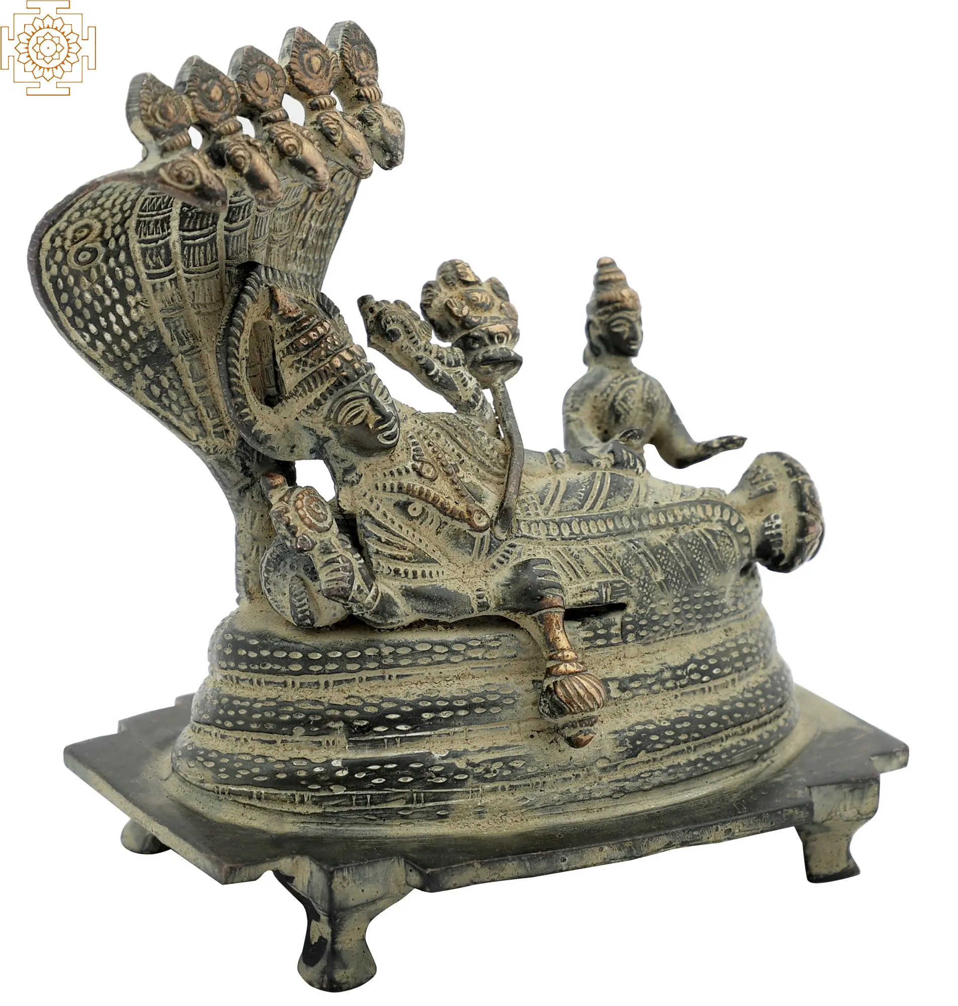 In the heart of cosmic eternity, a mesmerising tableau unfolds – Sheshasayi Vishnu, reclining upon the coils of the great serpent Ananta Shesha, emerges as the cosmic dreamer, enveloped by the embrace of his beloved consort Devi Padma. From his divine navel emerges Lord Brahma, the creator, ready to weave the tapestry of existence. This brass portrayal encapsulates the profound interplay of creation, preservation, and dissolution, inviting you to witness the dance of the universe's eternal rhythm.