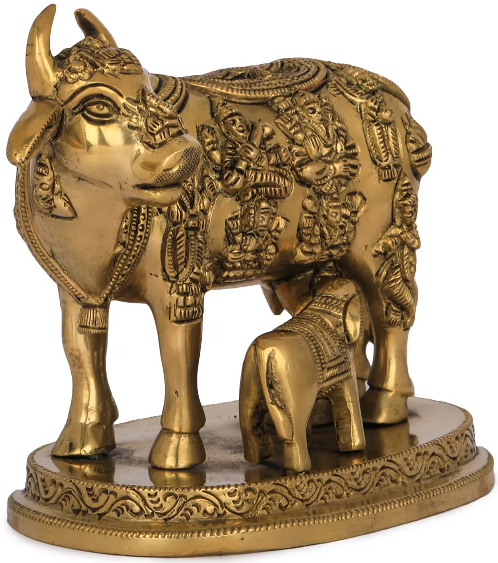 Small Superfine Kamdhenu Cow and Calf with Engraved Many God and Goddess on Wood Base | Brass Figurine