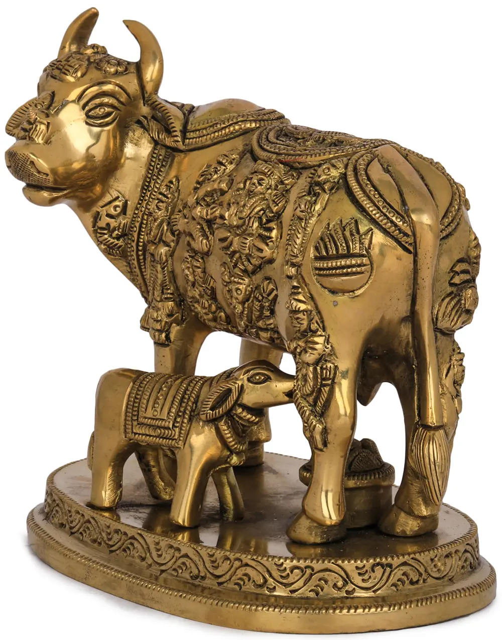 6" Small Superfine Cow and Calf with Ganesha Lakshmi Carving | Brass Statue with Inlay Work