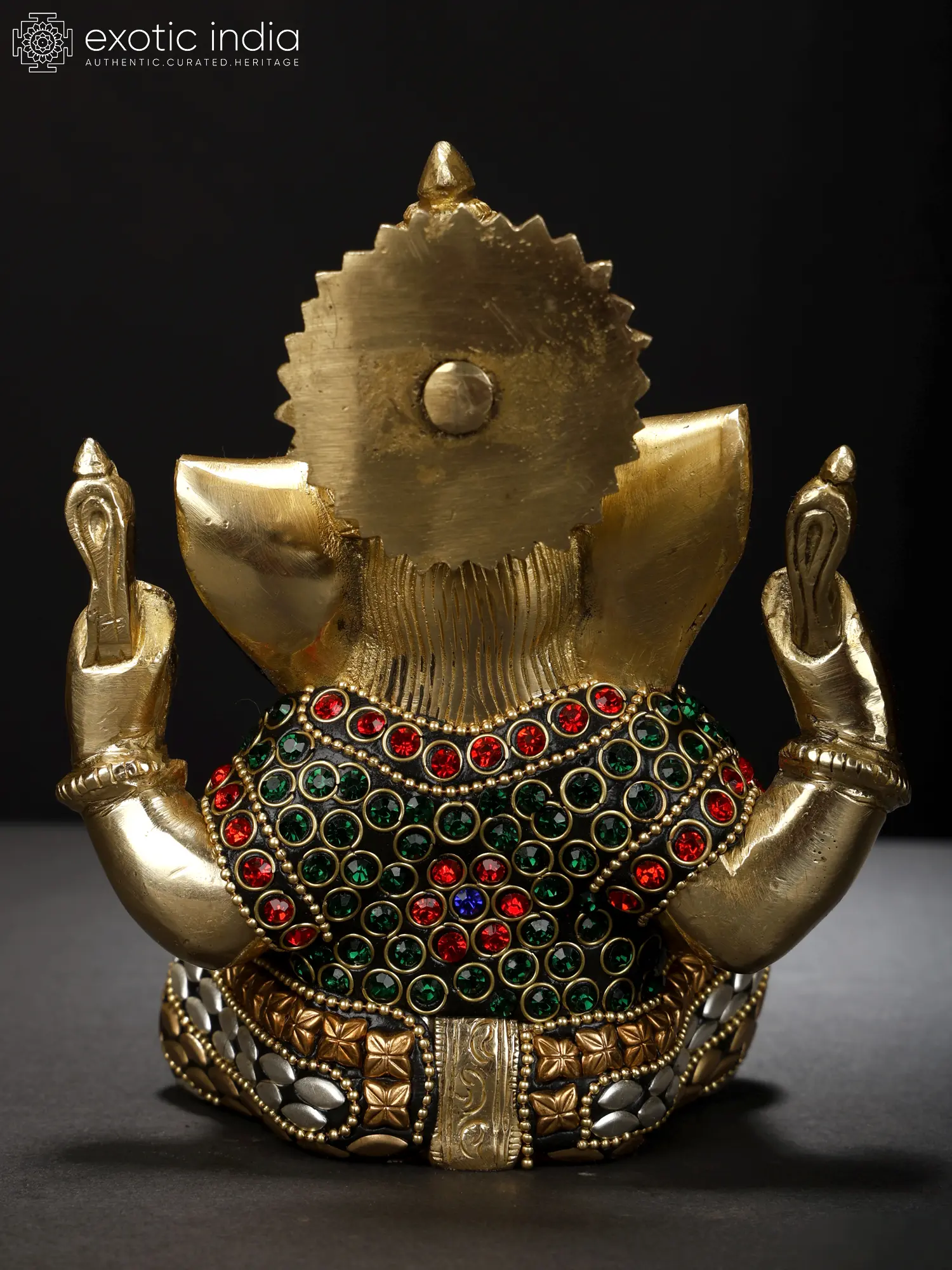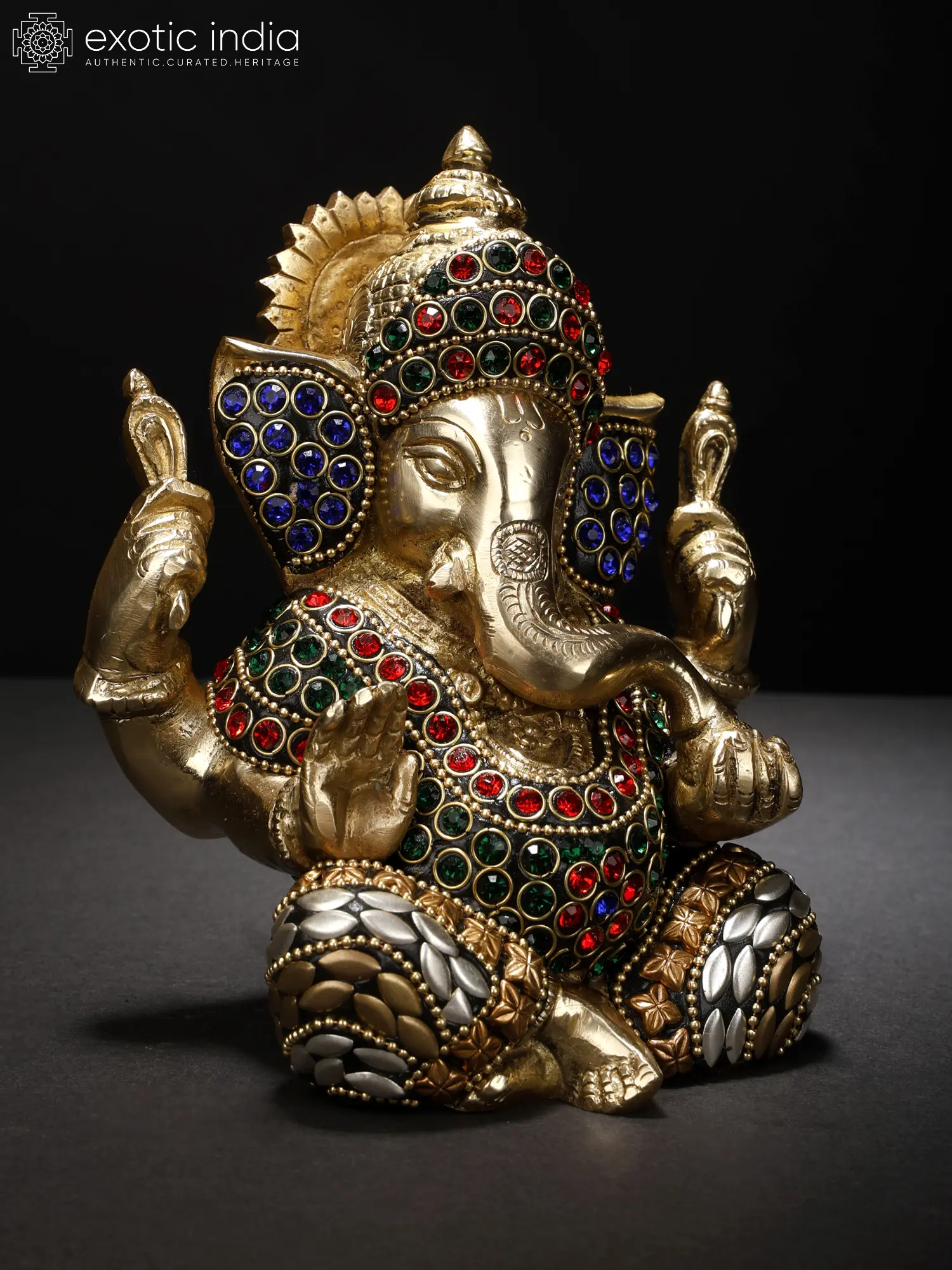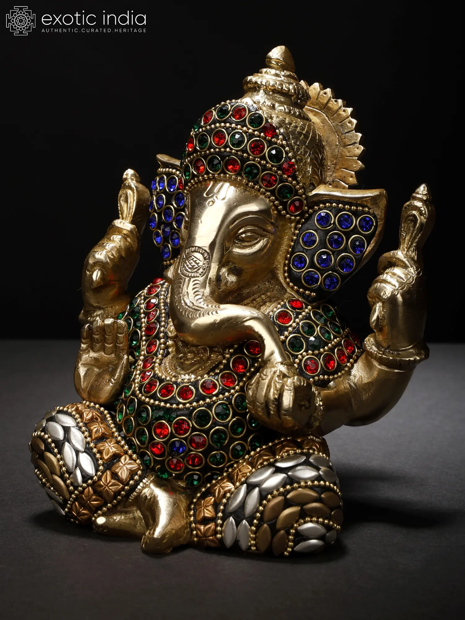The royalty of Ganesha has been cast in the finest stones in this one-of-a-kind sculpture from the Exotic India collection. The Lord's quiet atmosphere is enhanced by the chromatic stones.